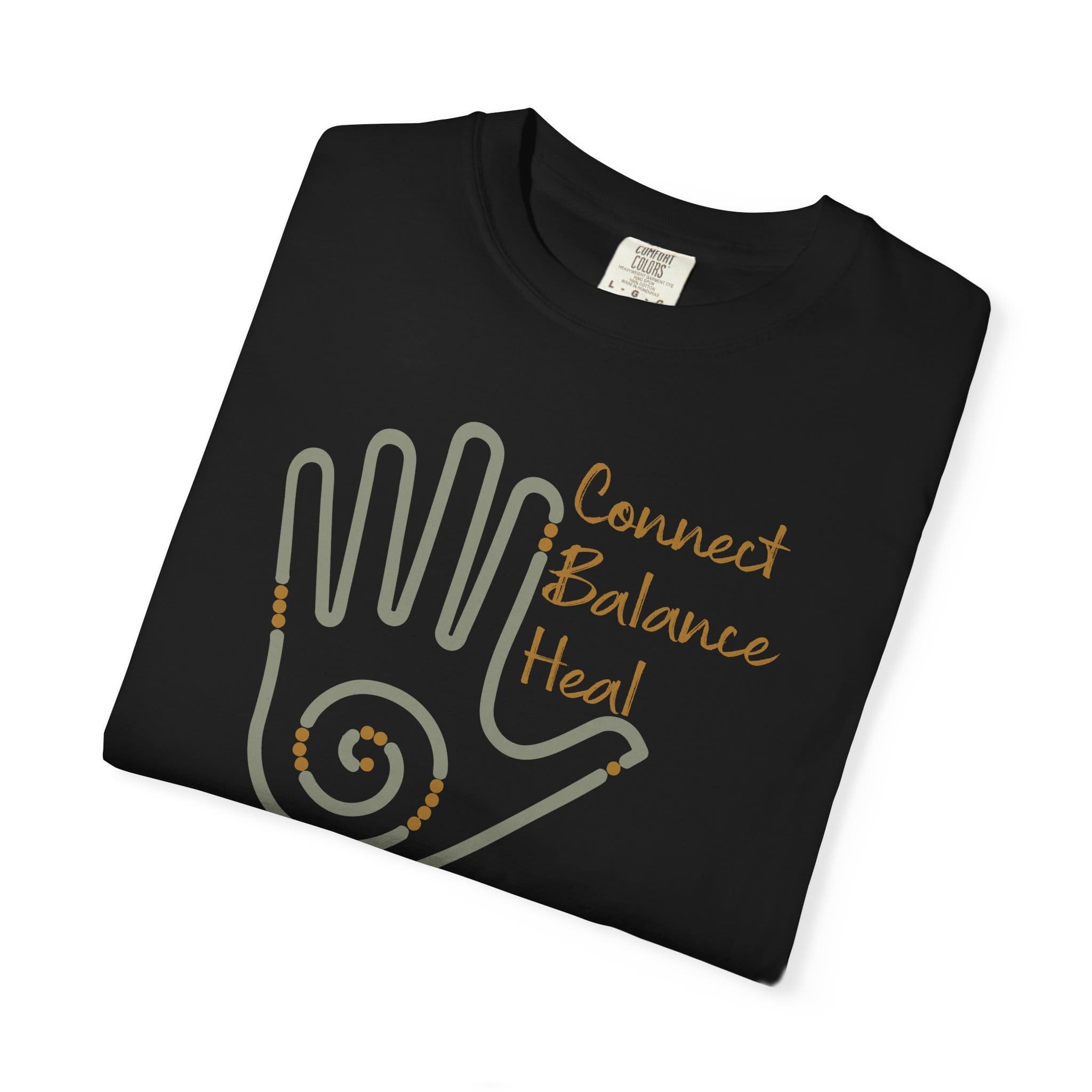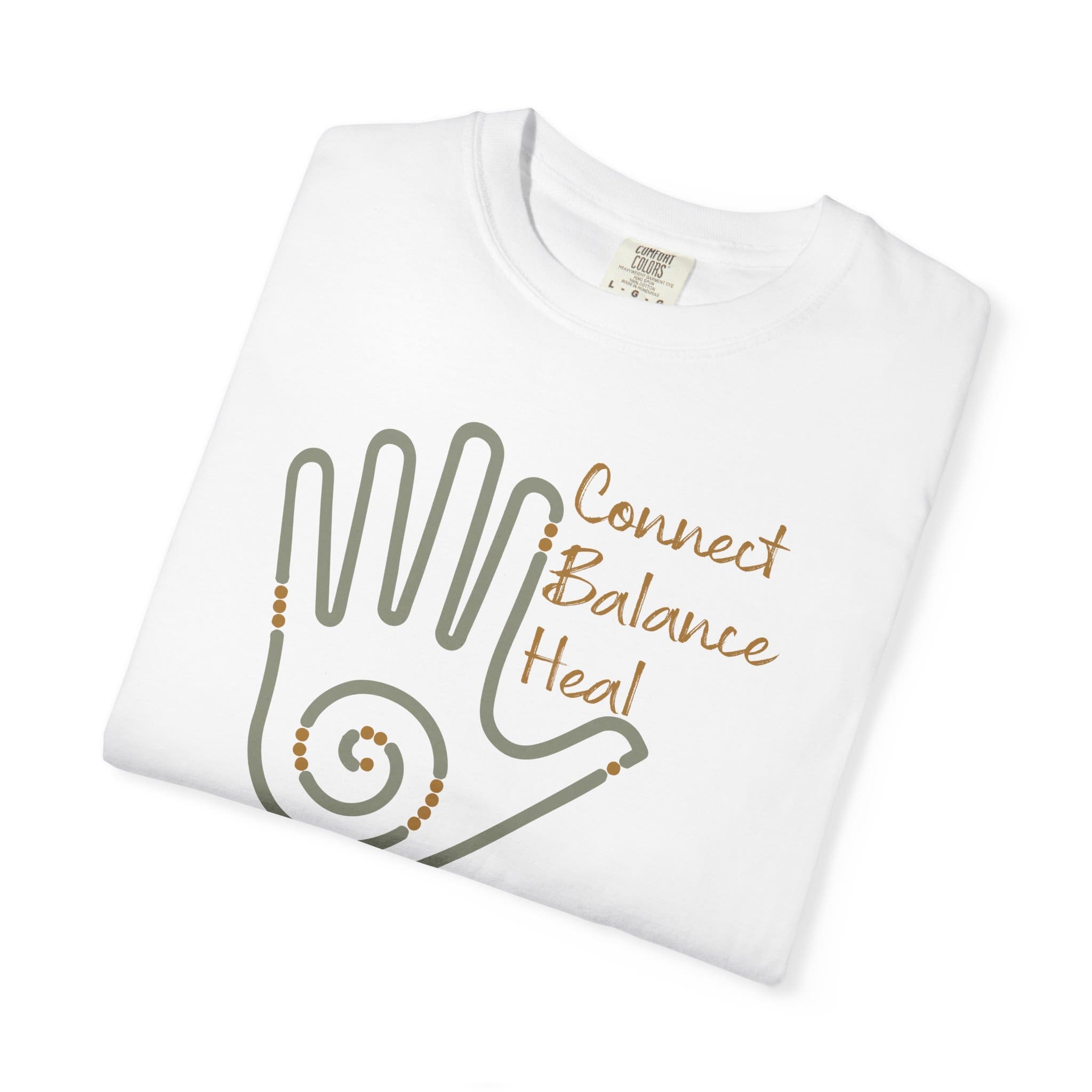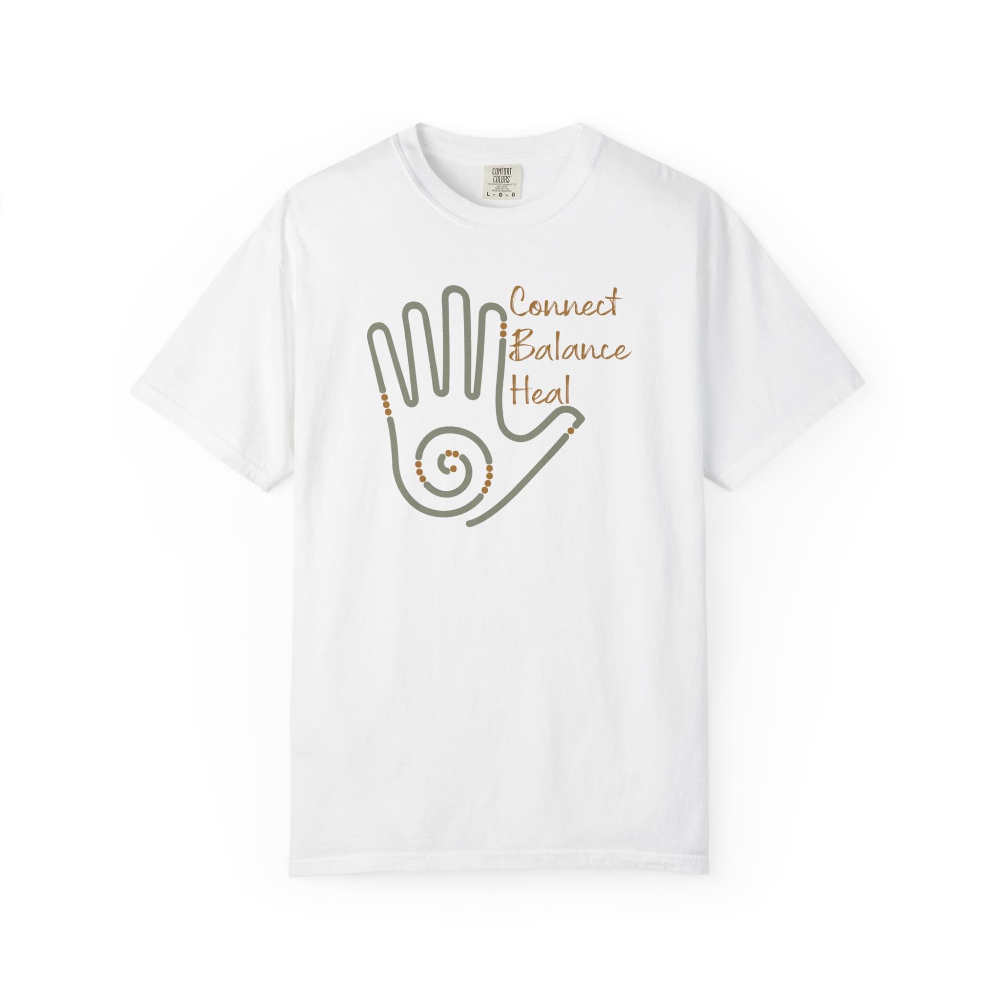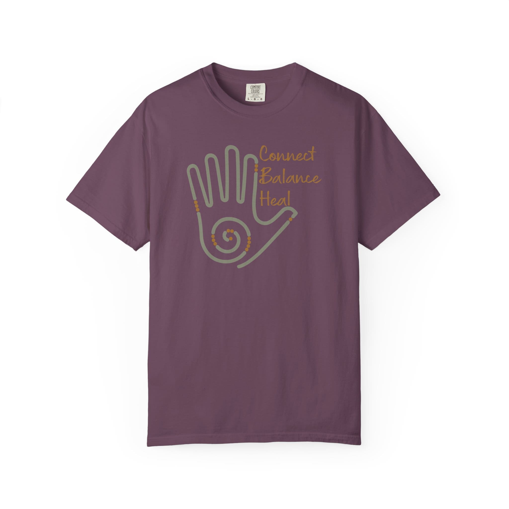 Connect, Balance, Heal – Reiki Hand T-Shirt – an excellent choice for energy healers, self-care, or just because! The Reiki Hand symbol can also represent these inspiring words.