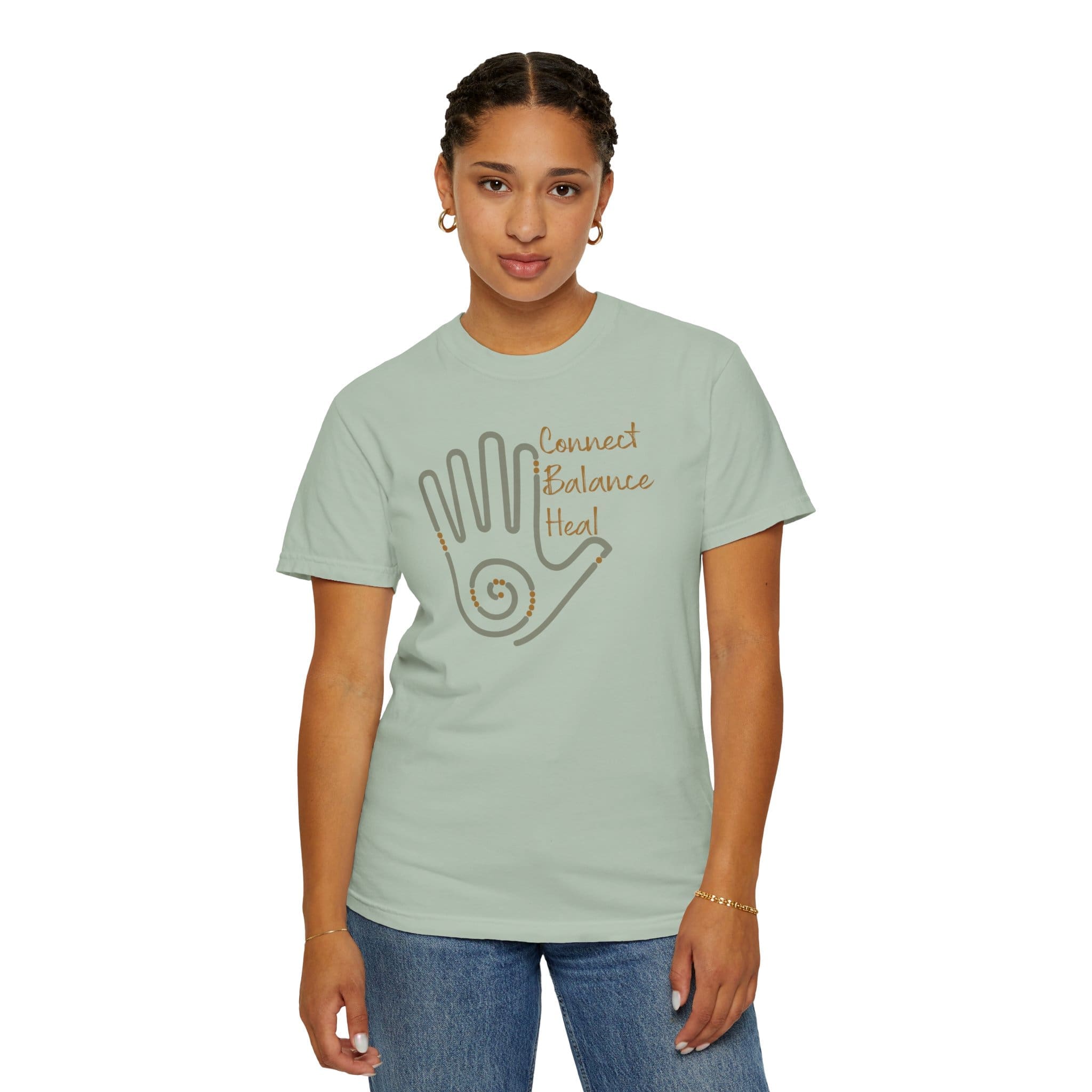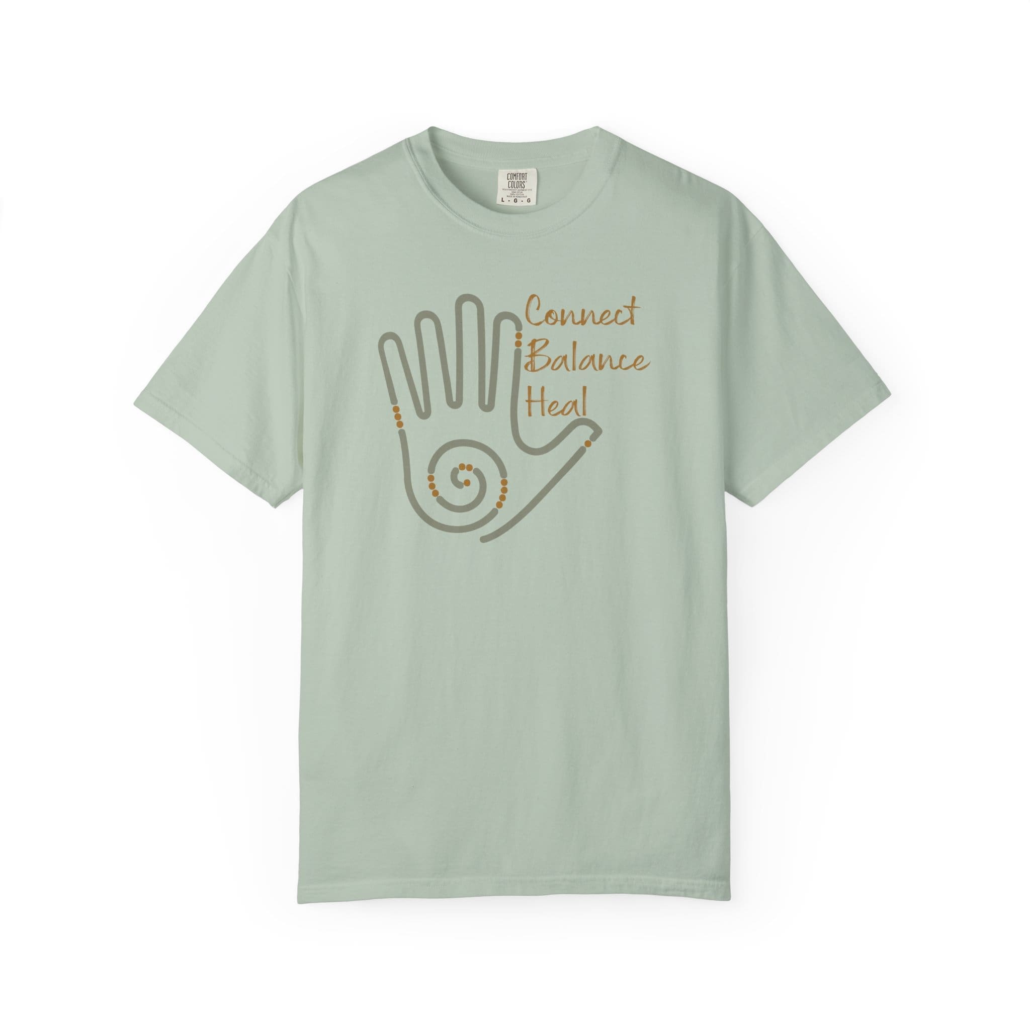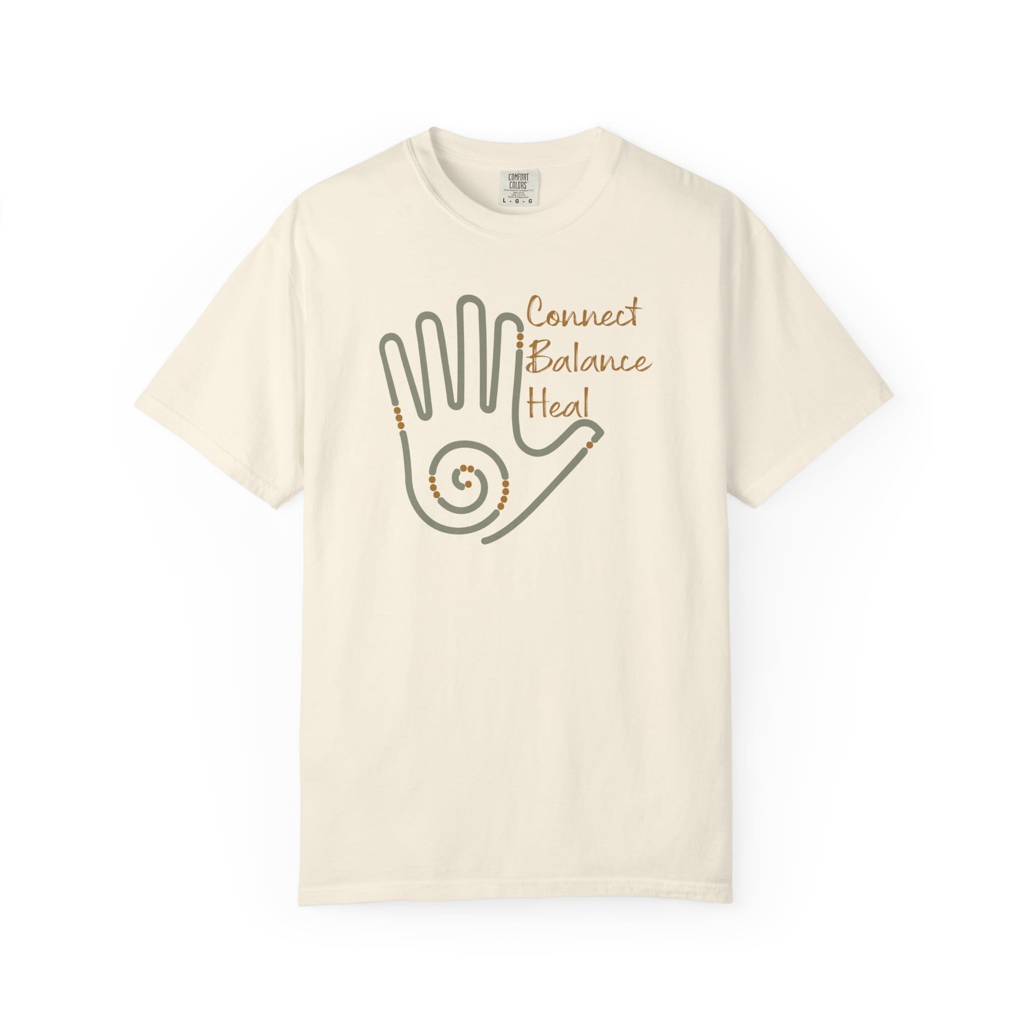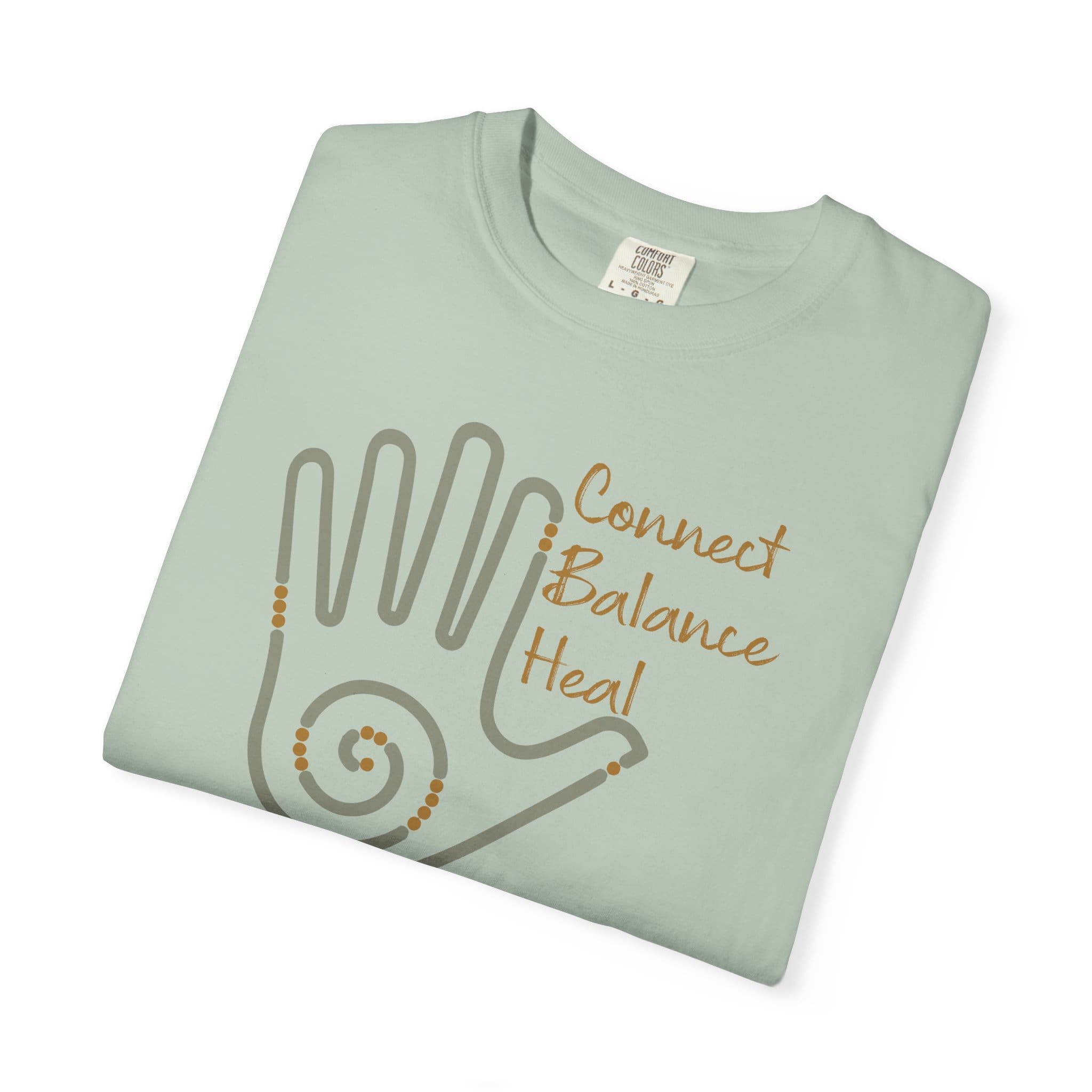 Connect, Balance, Heal – Reiki Hand T-Shirt – an excellent choice for energy healers, self-care, or just because! The Reiki Hand symbol can also represent these inspiring words.