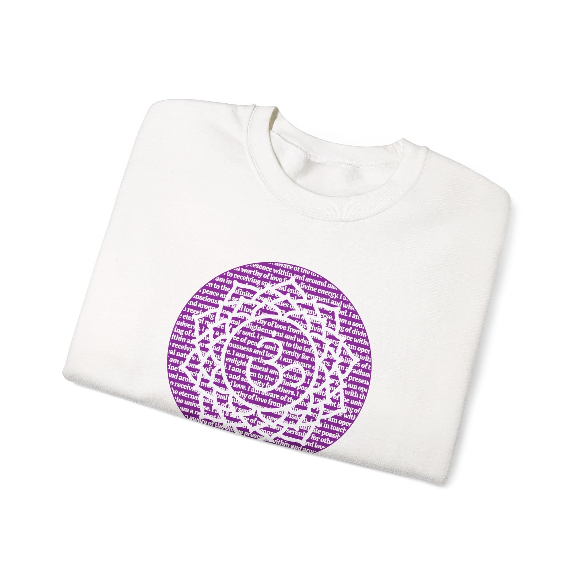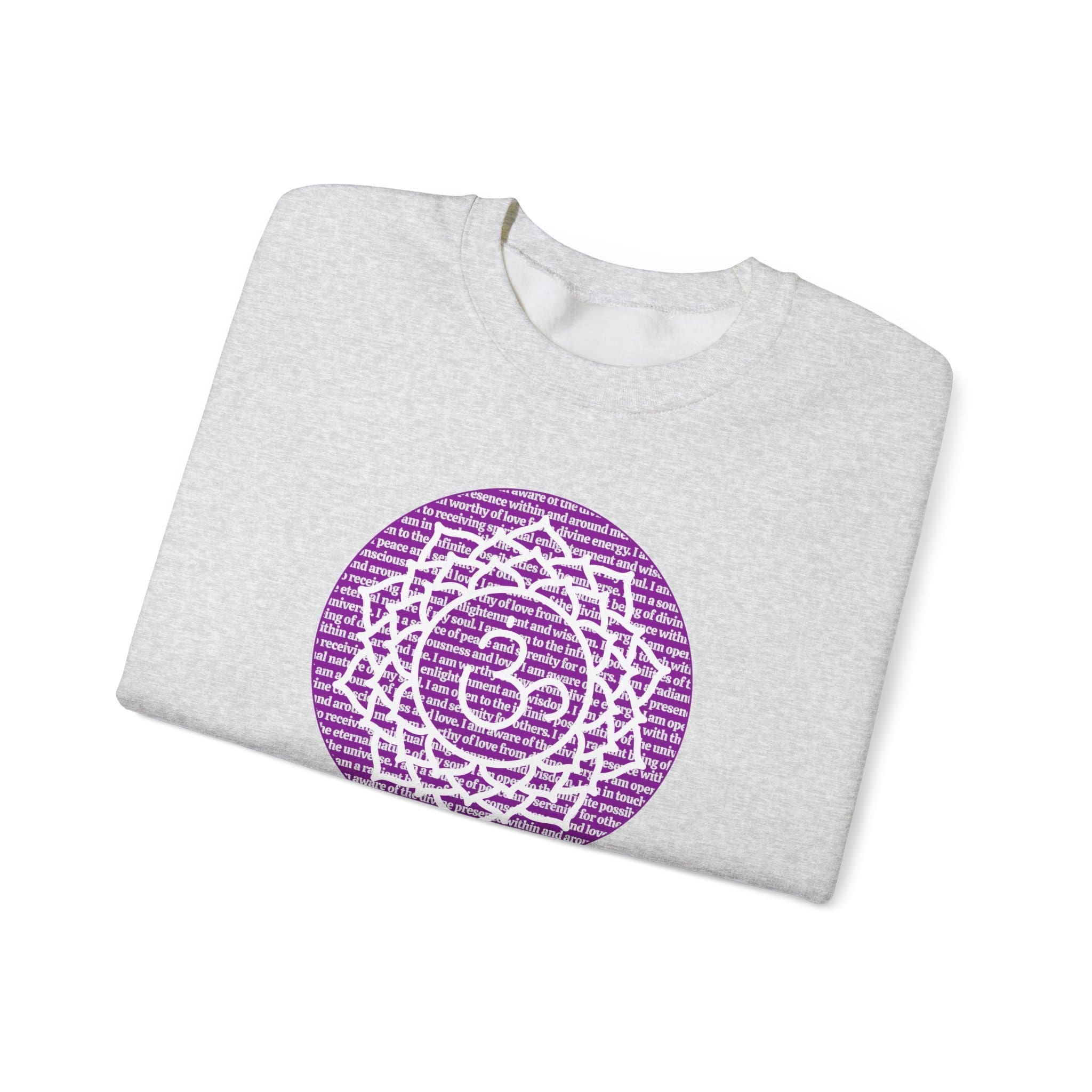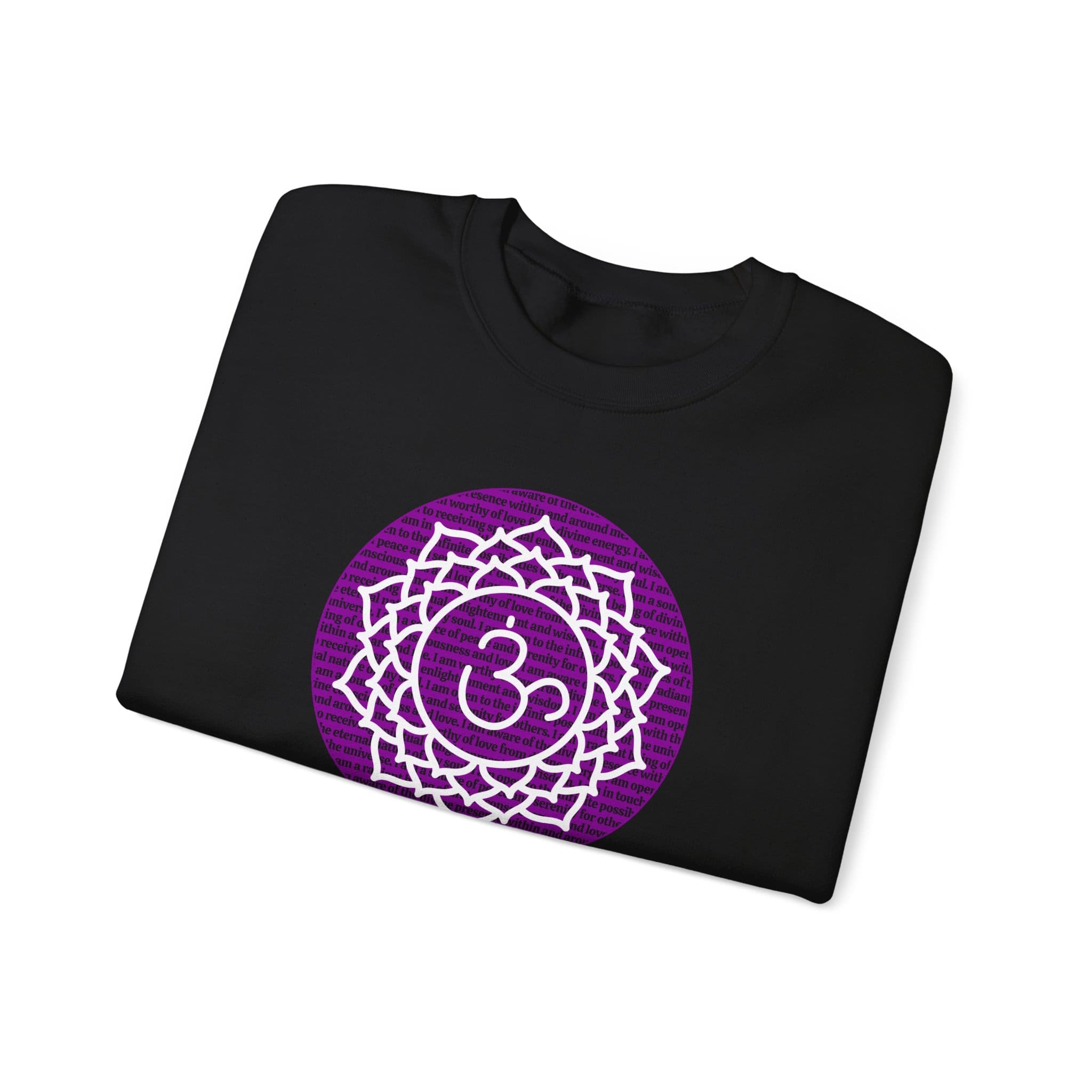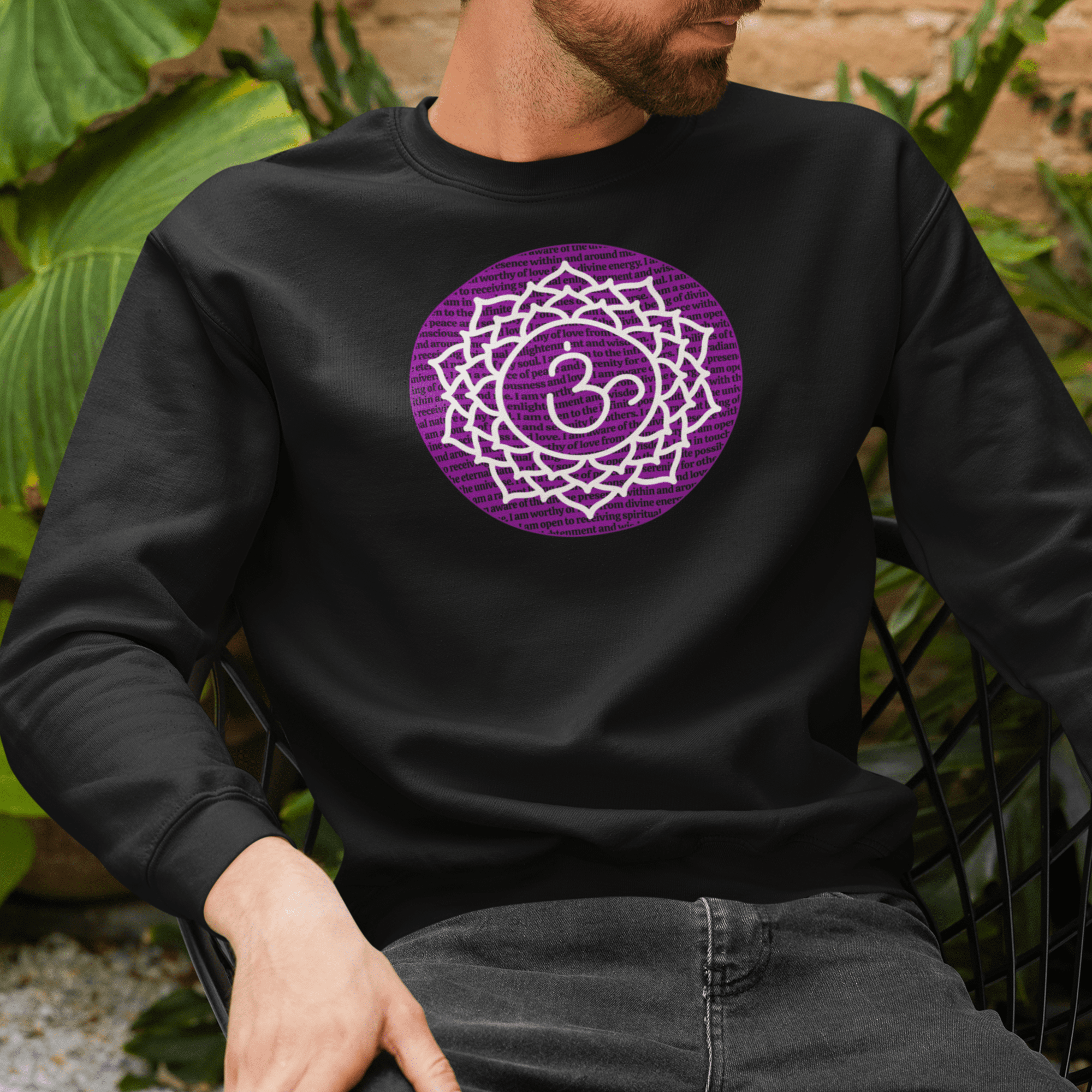 The design on this crewneck is multi-layered, with the chakra symbol in the forefront and crown chakra affirmations typed out in the background. The affirmation text (repeated) is: ‘I am aware of the divine presence within and around me. I am worthy of love from divine energy. I am open to receiving spiritual enlightenment and wisdom. I am in touch with the eternal nature of my soul. I am open to the infinite possibilities of the universe. I am a source of peace and serenity for others. I am a radiant being of divine consciousness and love.’