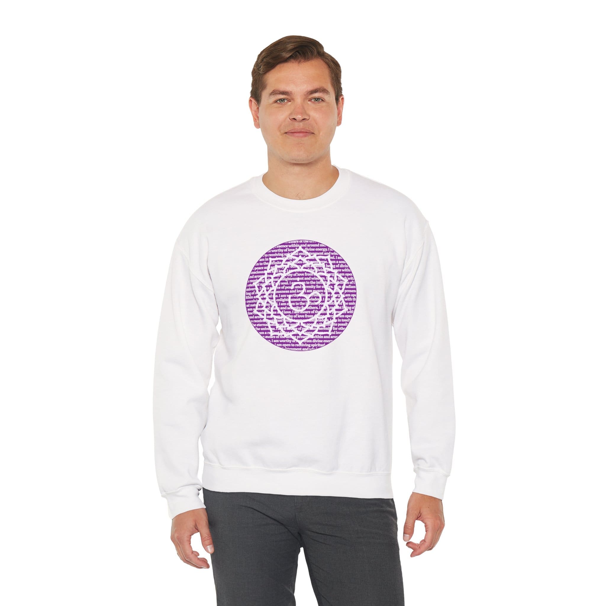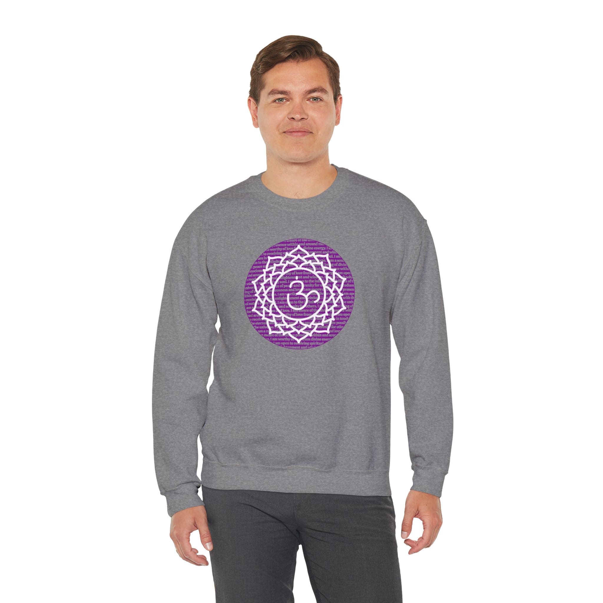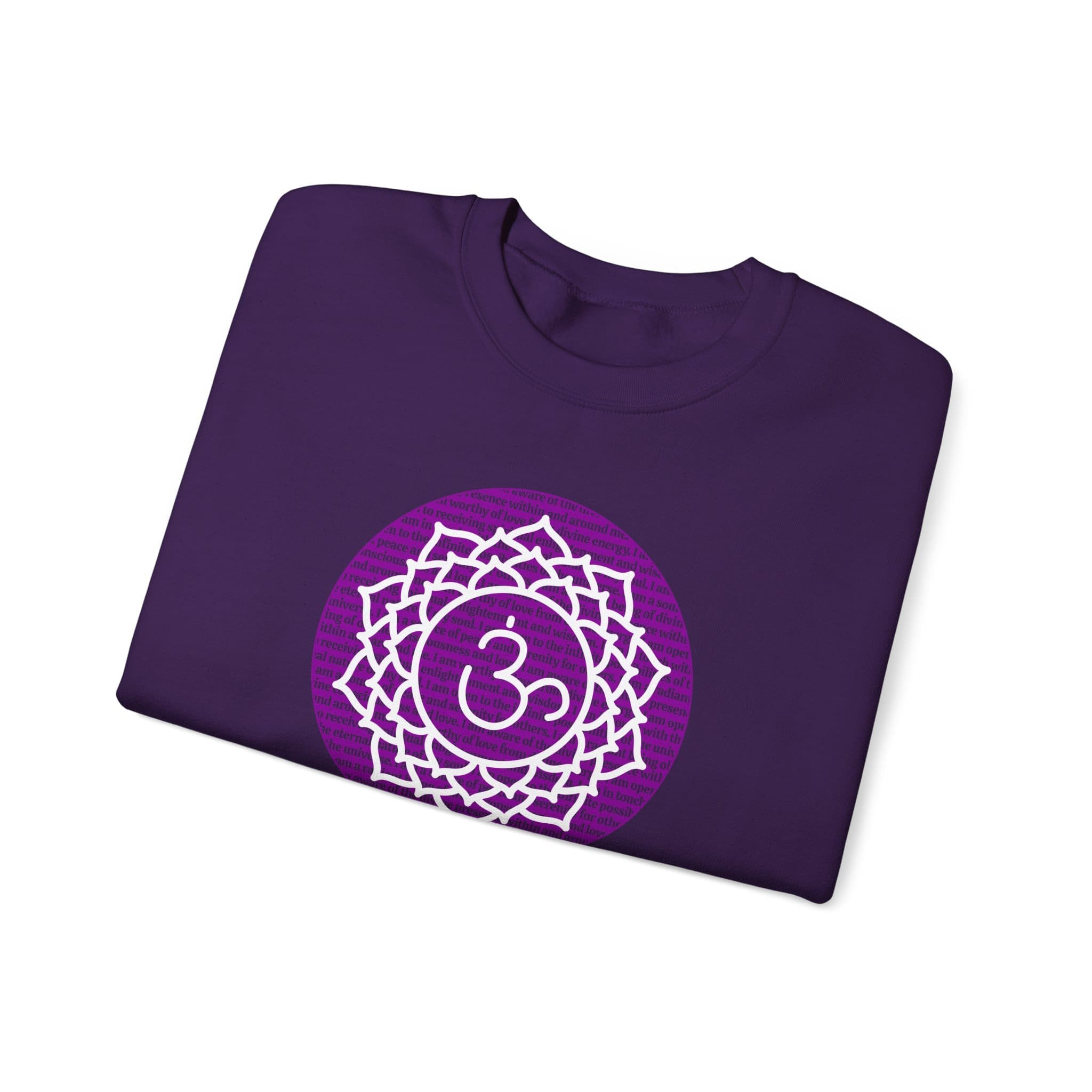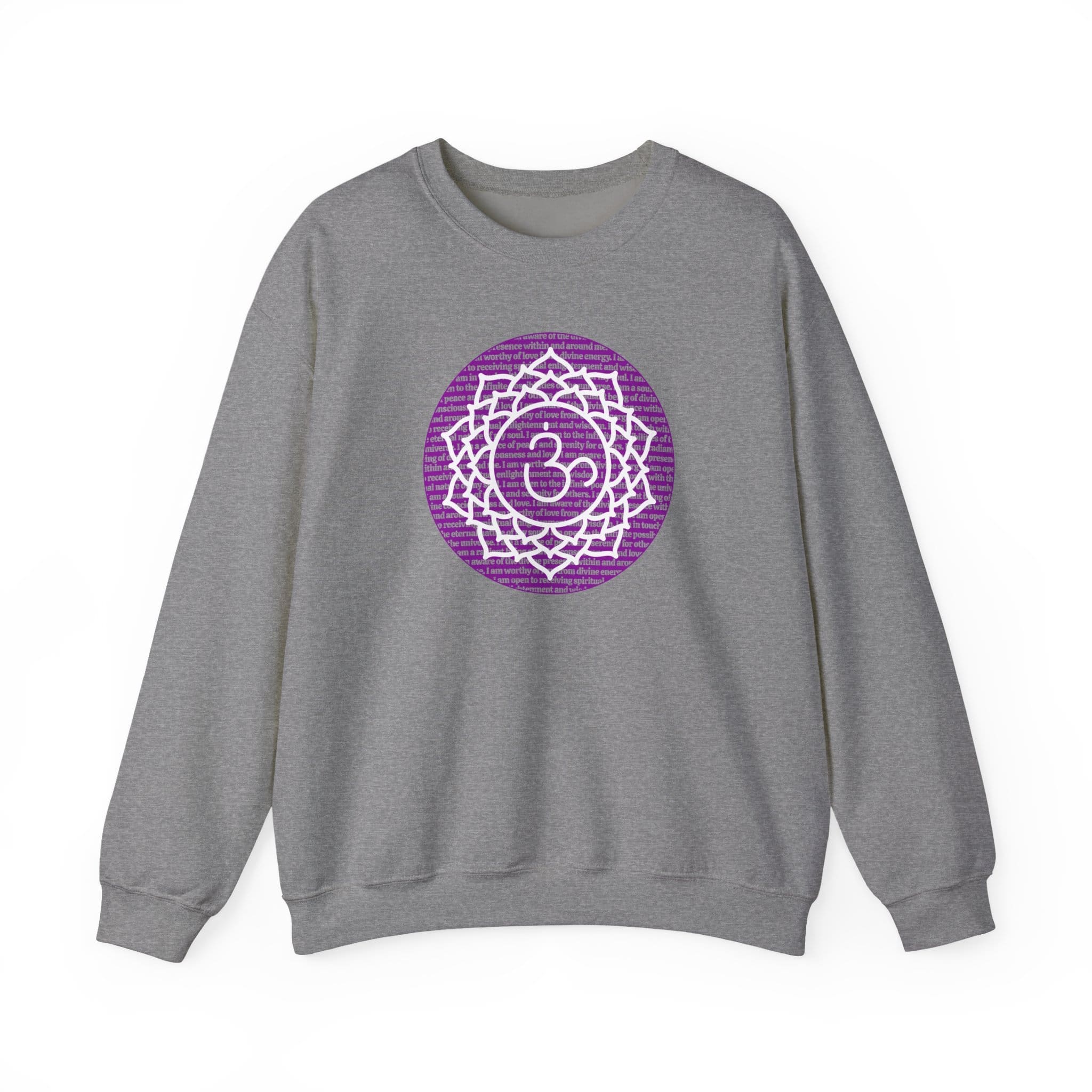 The design on this crewneck is multi-layered, with the chakra symbol in the forefront and crown chakra affirmations typed out in the background. The affirmation text (repeated) is: ‘I am aware of the divine presence within and around me. I am worthy of love from divine energy. I am open to receiving spiritual enlightenment and wisdom. I am in touch with the eternal nature of my soul. I am open to the infinite possibilities of the universe. I am a source of peace and serenity for others. I am a radiant being of divine consciousness and love.’