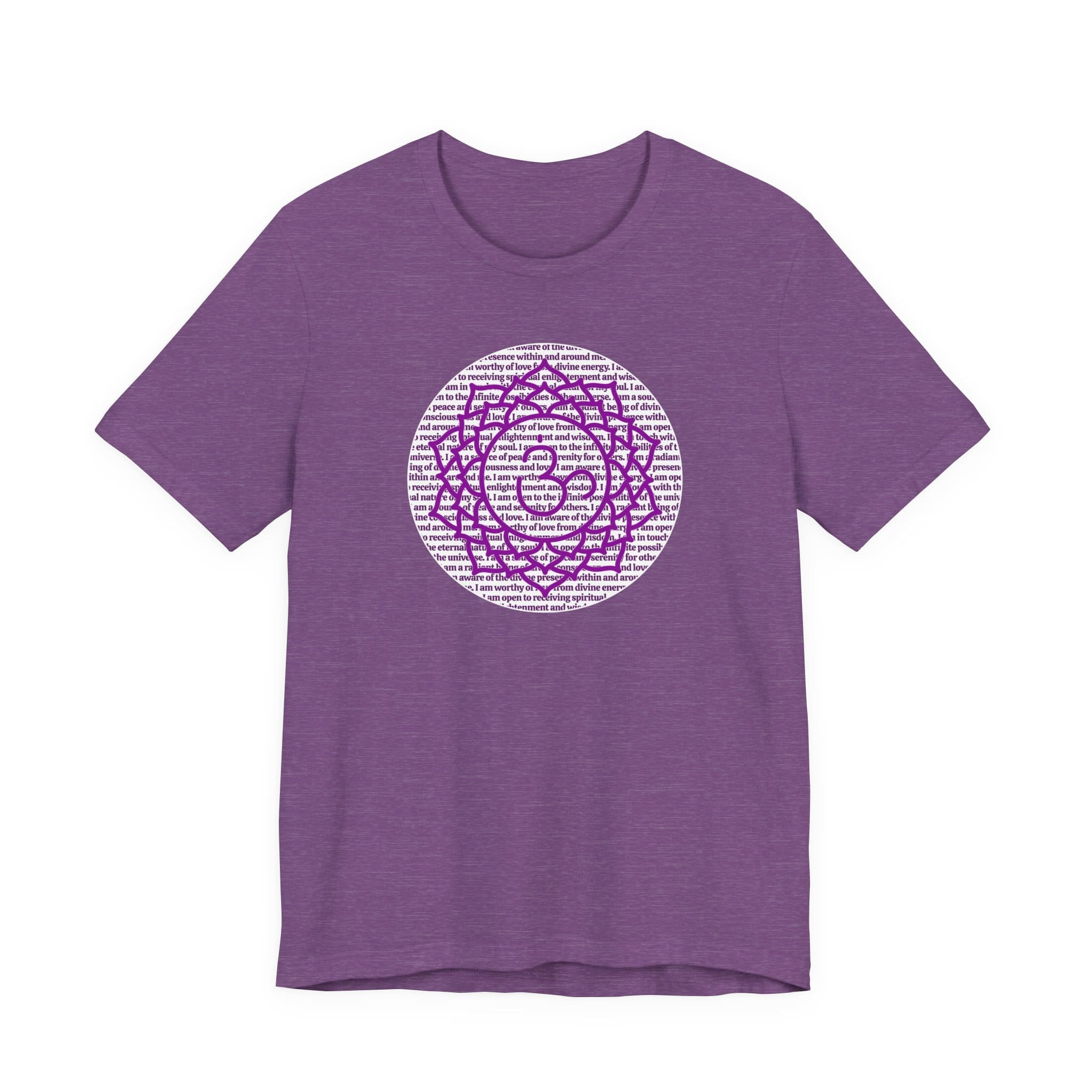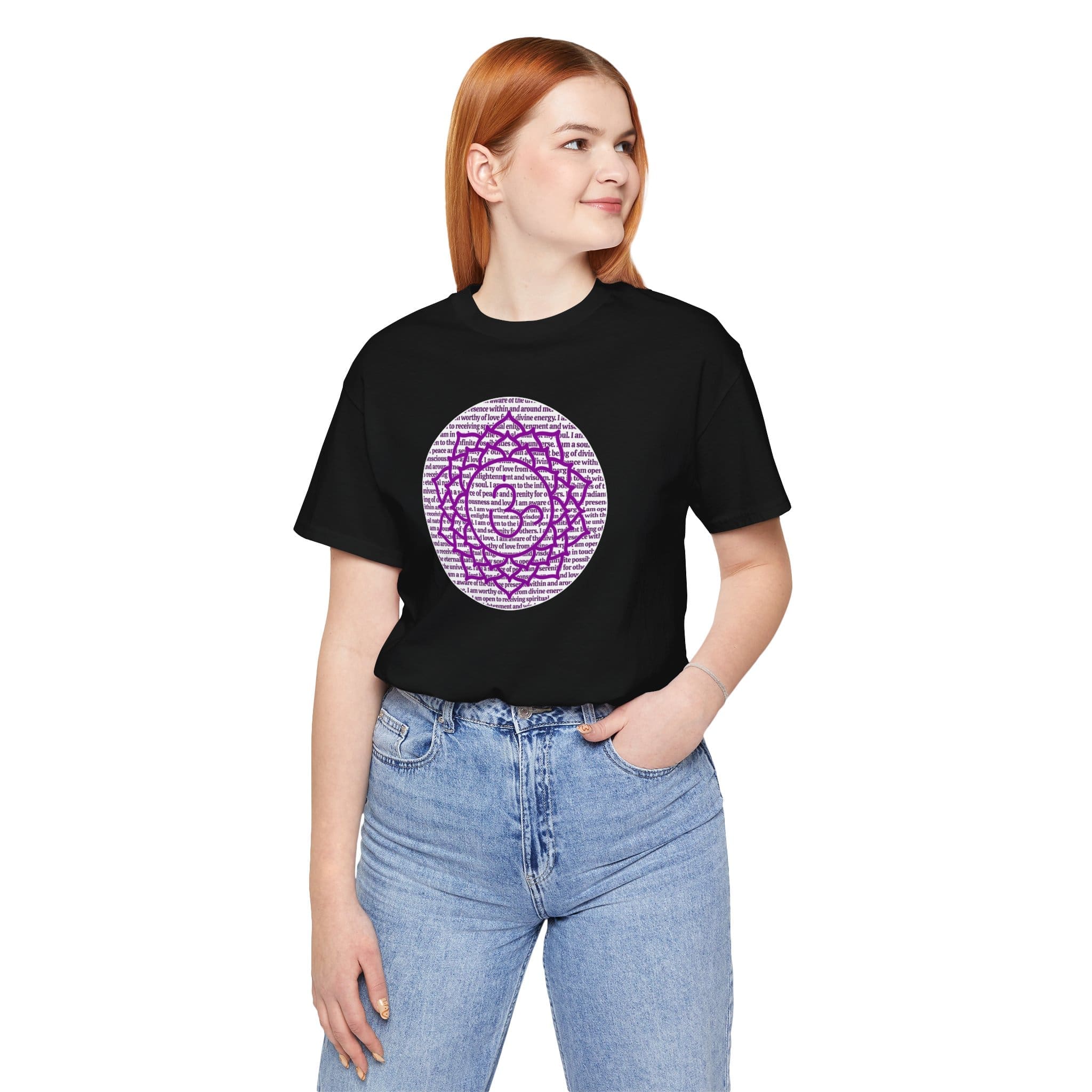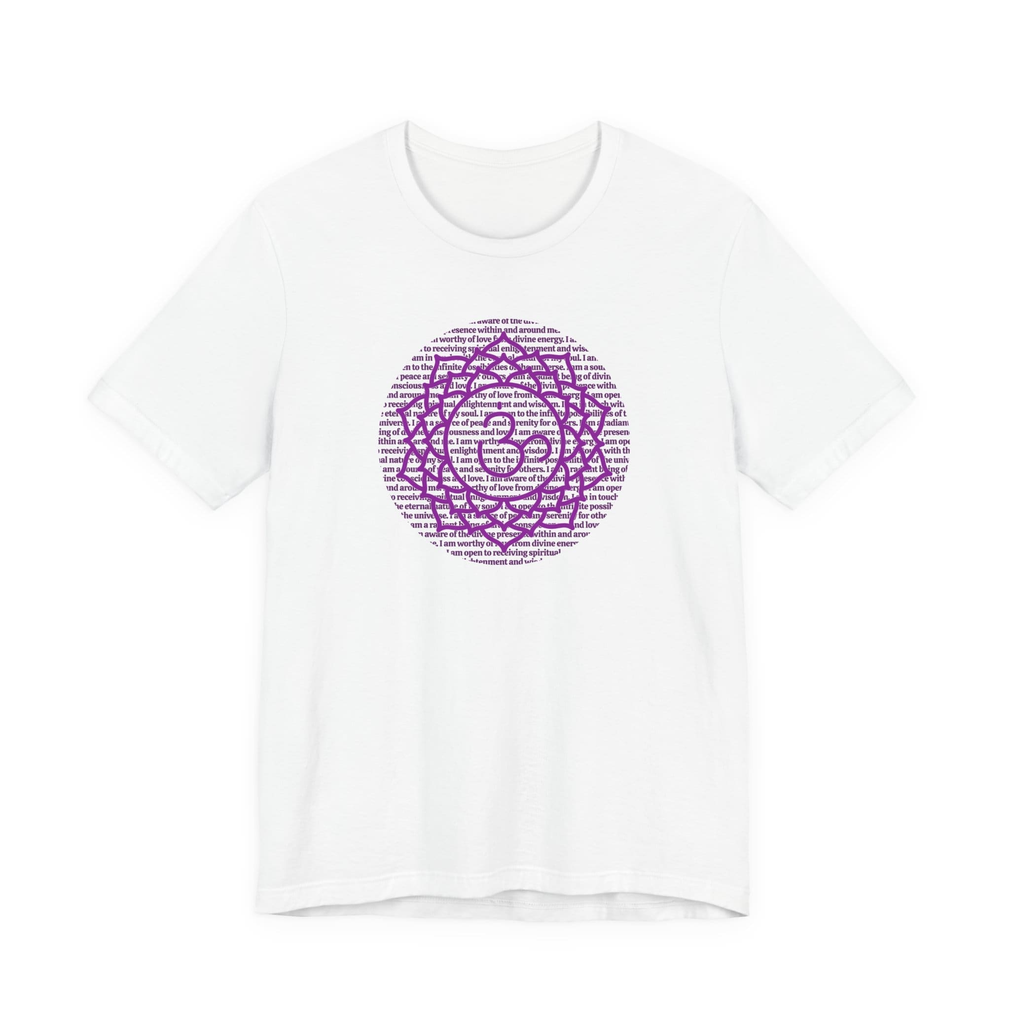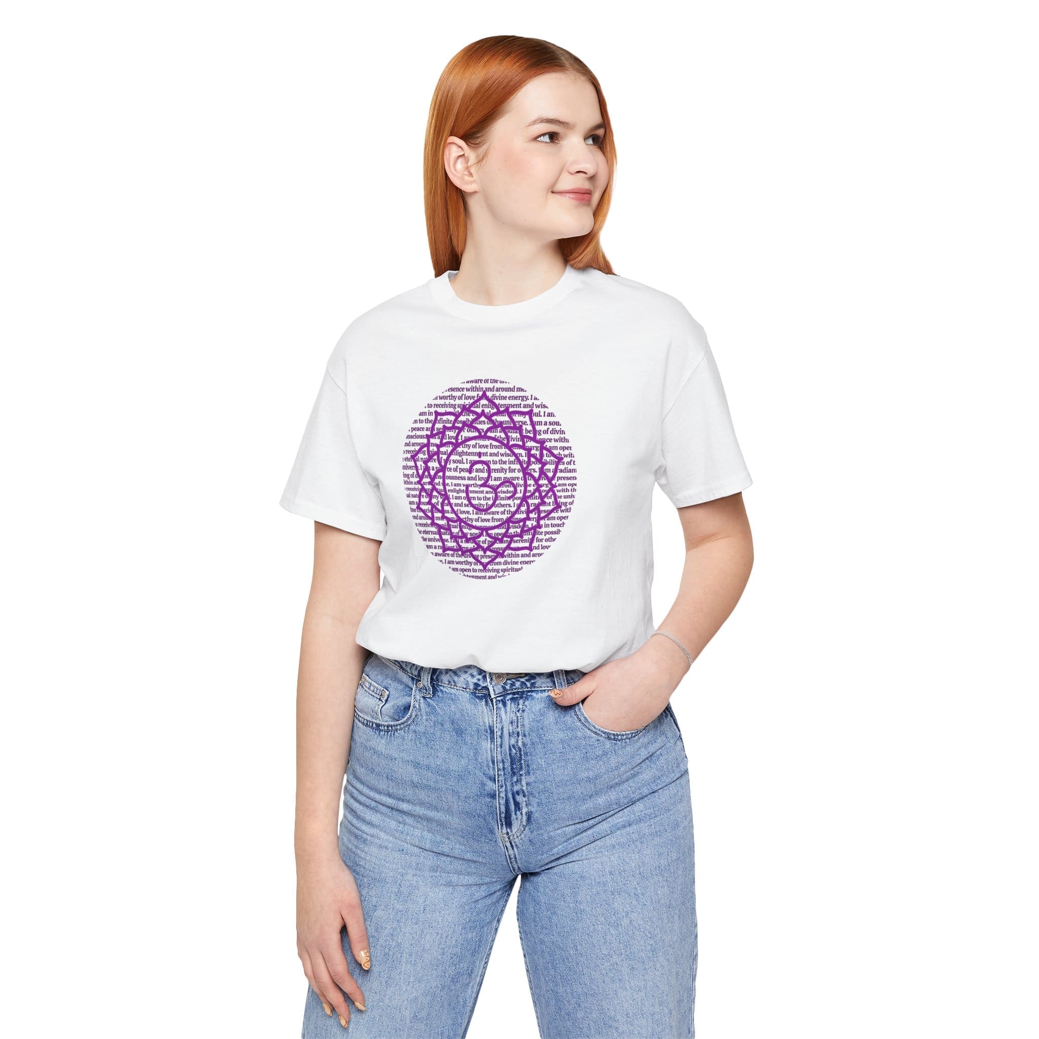 Crown Chakra Affirmations Lightweight T-Shirt with Purple Text – The design on this tee is multi-layered, with the chakra symbol in the forefront and crown chakra affirmations typed out in the background.