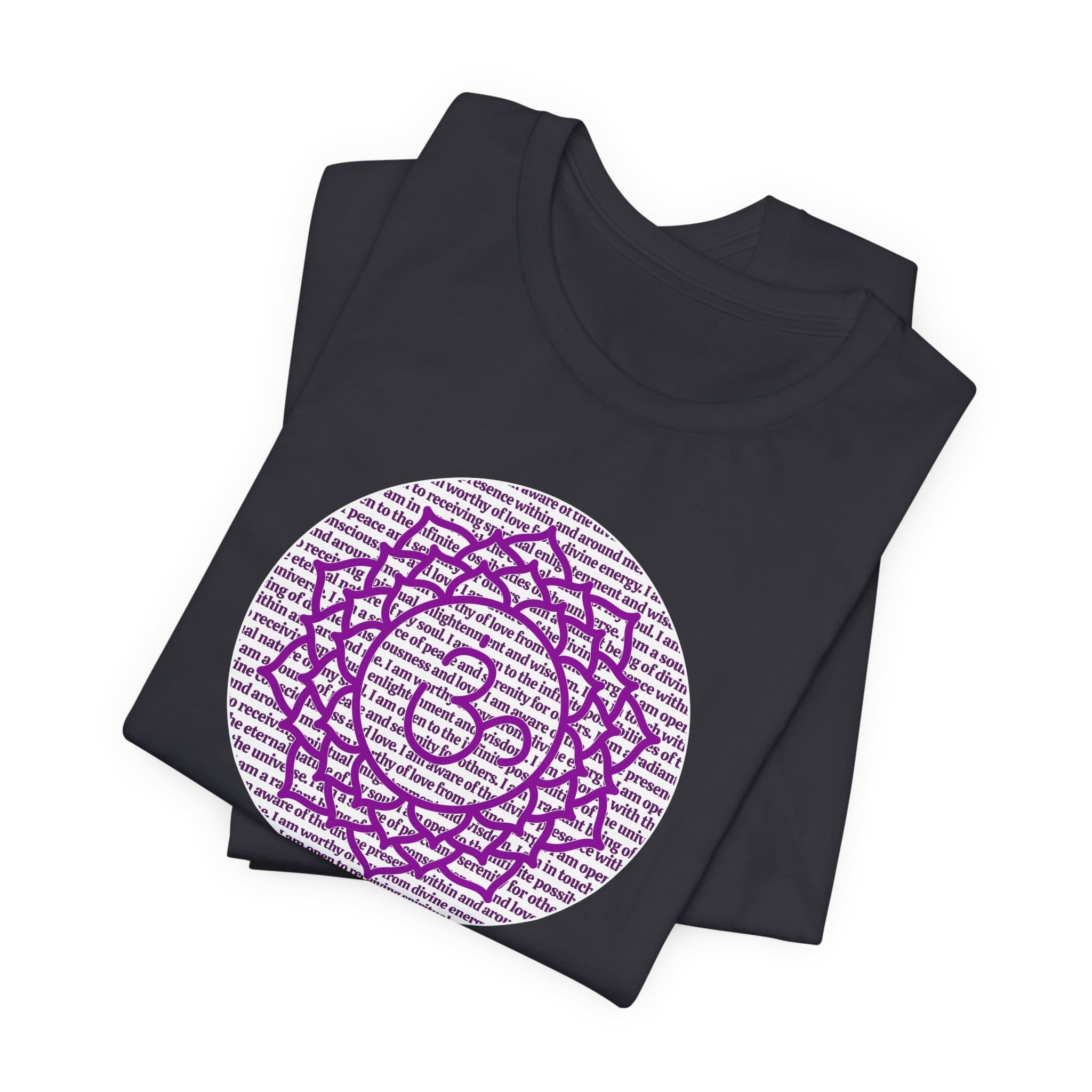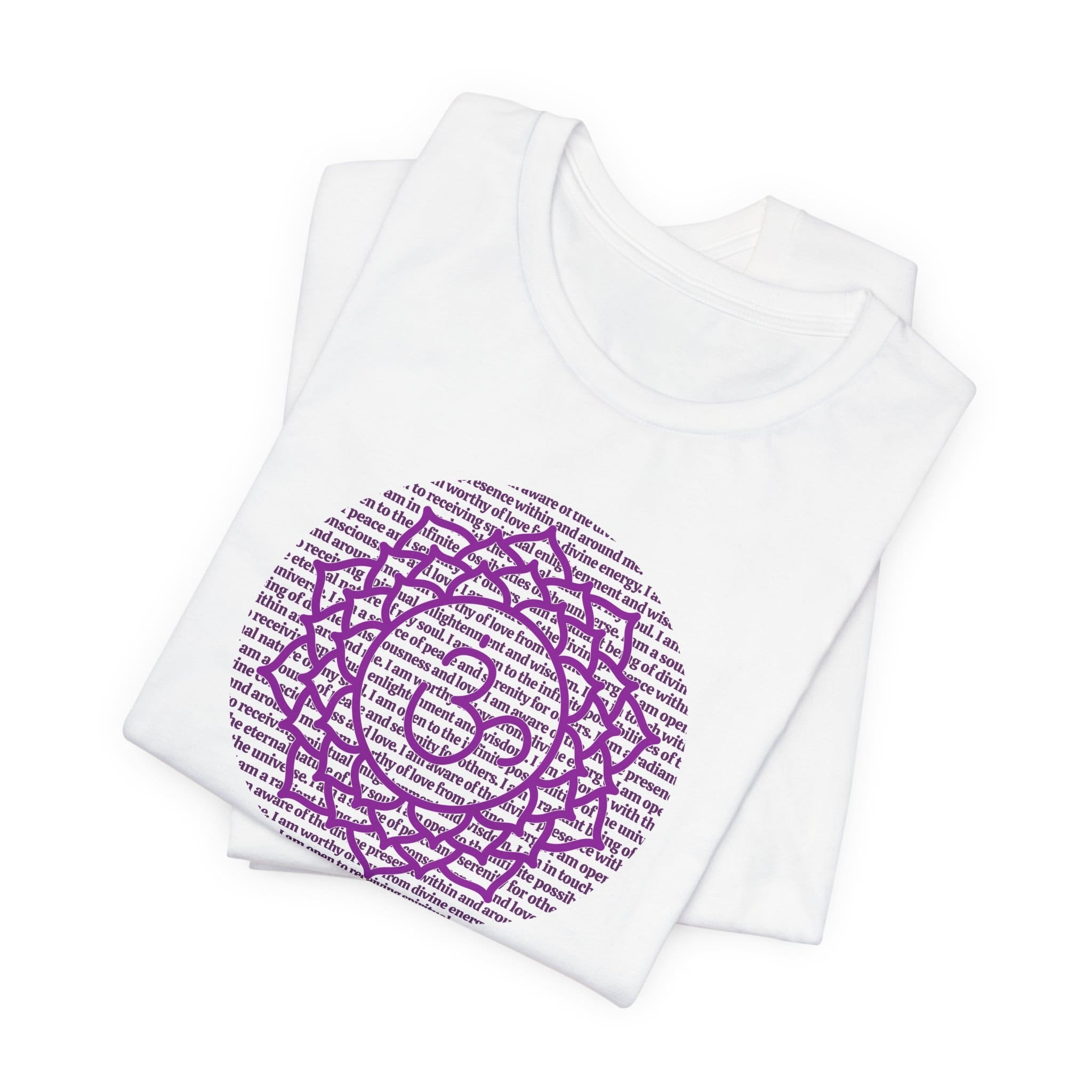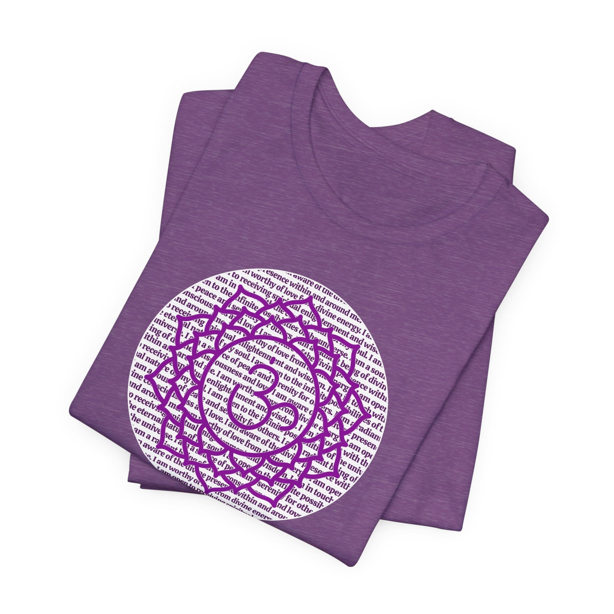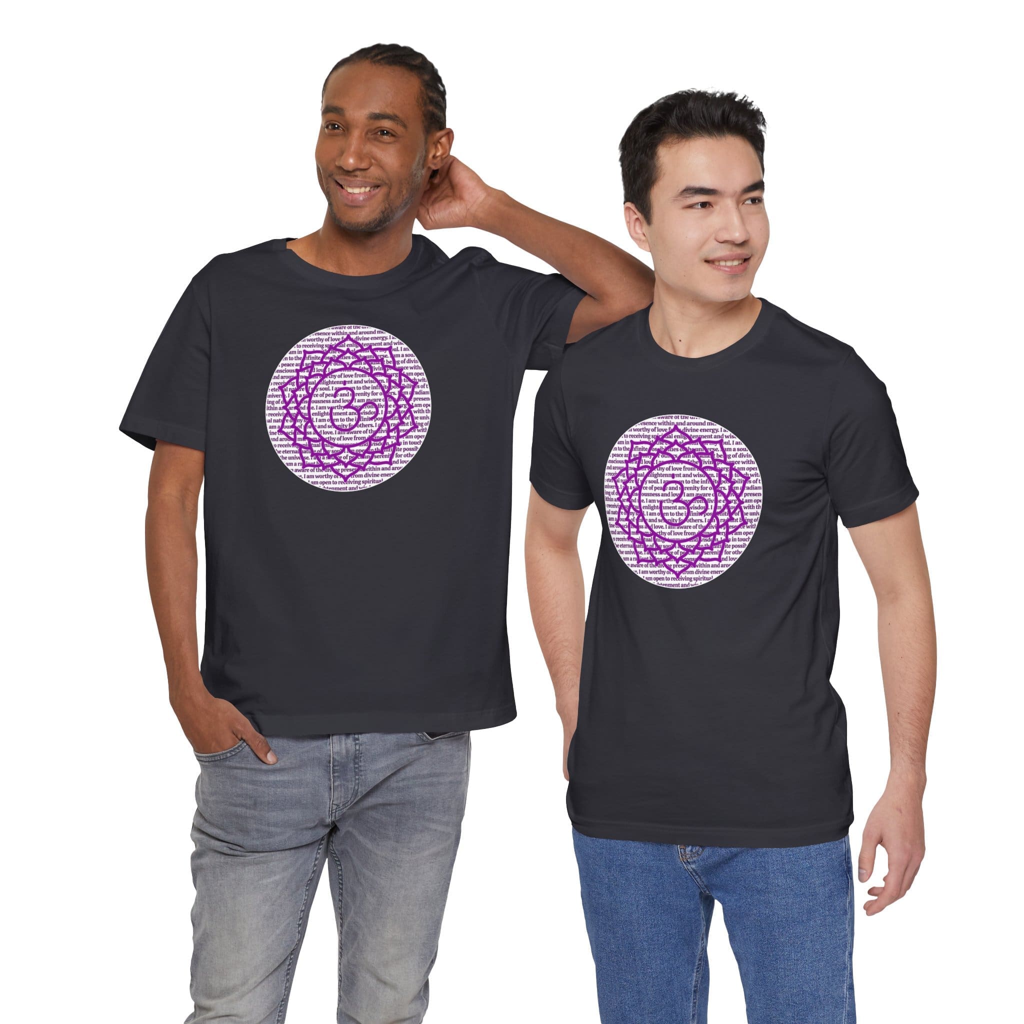 Crown Chakra Affirmations Lightweight T-Shirt with Purple Text – The design on this tee is multi-layered, with the chakra symbol in the forefront and crown chakra affirmations typed out in the background.