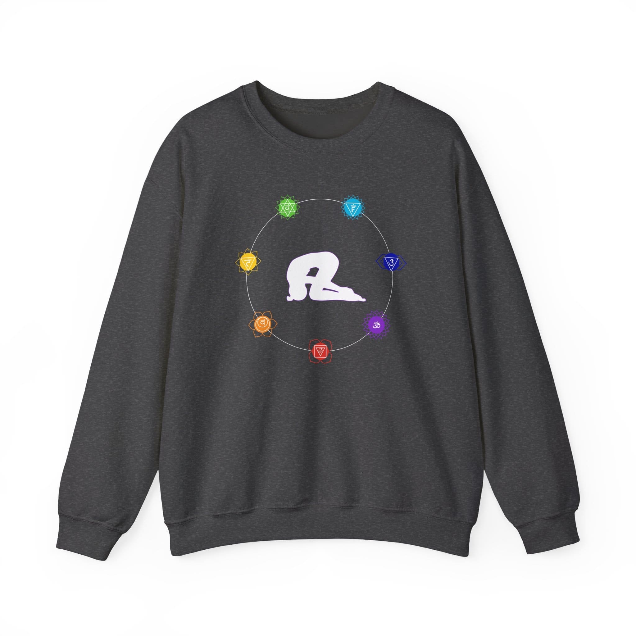 Crown Chakra, Yoga Rabbit Pose Female – Crewneck Sweatshirt – Certain yoga poses are known to help balance and activate the chakras, which are energy centers in the body. One of the poses known to energize and clear blockages in the Crown Chakra is the Rabbit Pose.