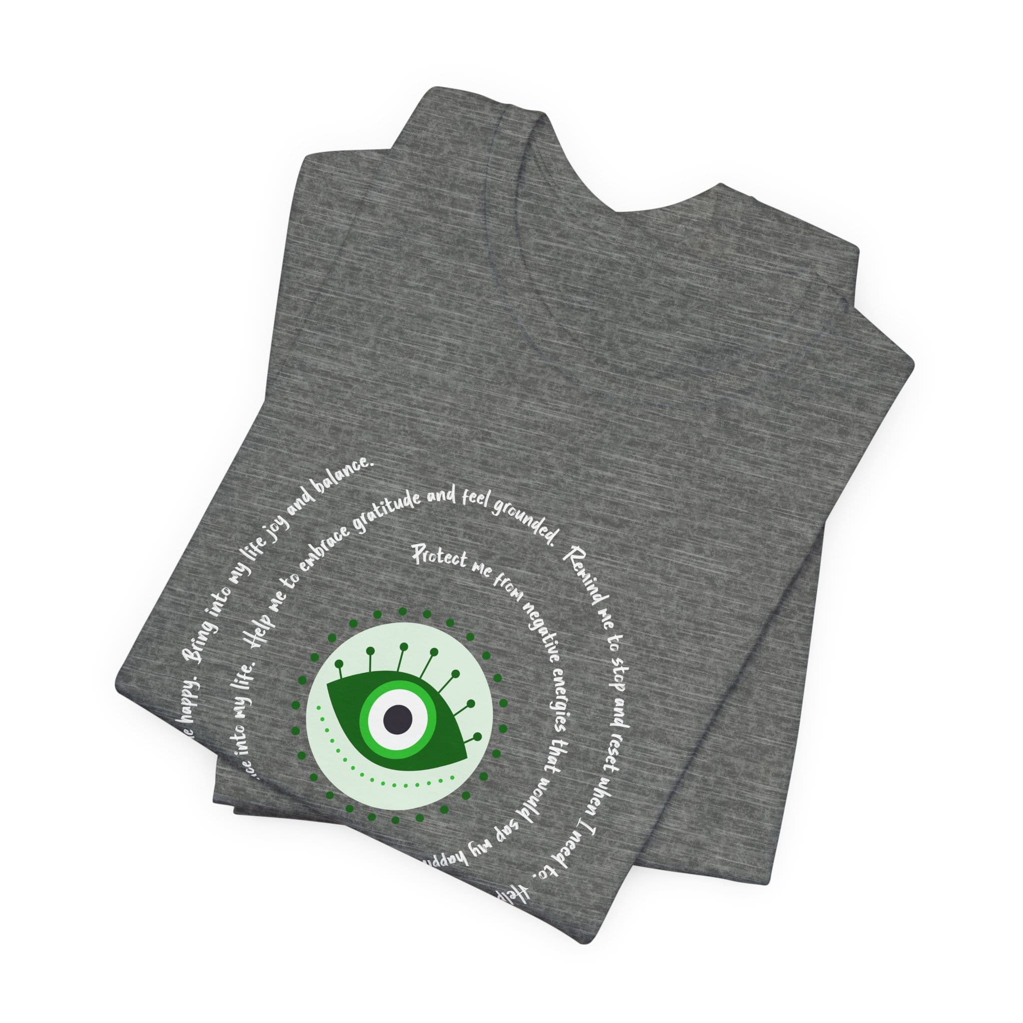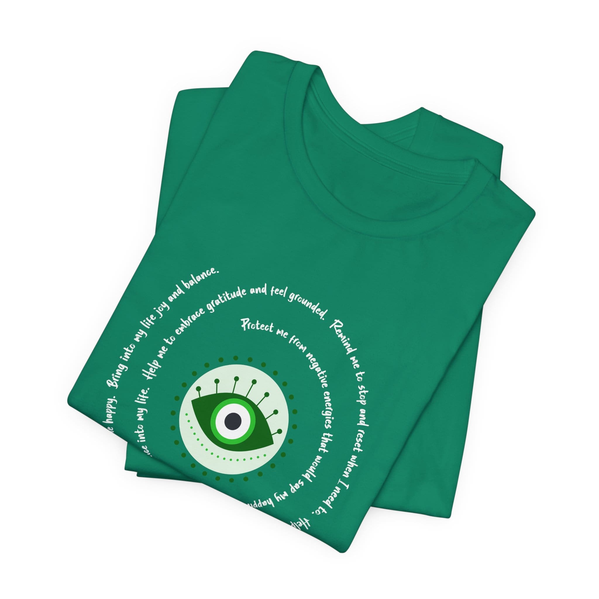 Dark Green Evil Eye Protection Lightweight T-Shirt – White Text – The Evil Eye is an ancient symbol believed to ward off negativity. Many cultures have used this symbol for protection over the ages. It also serves as a reminder to be mindful of our thoughts and radiate positive vibes out into our lives.