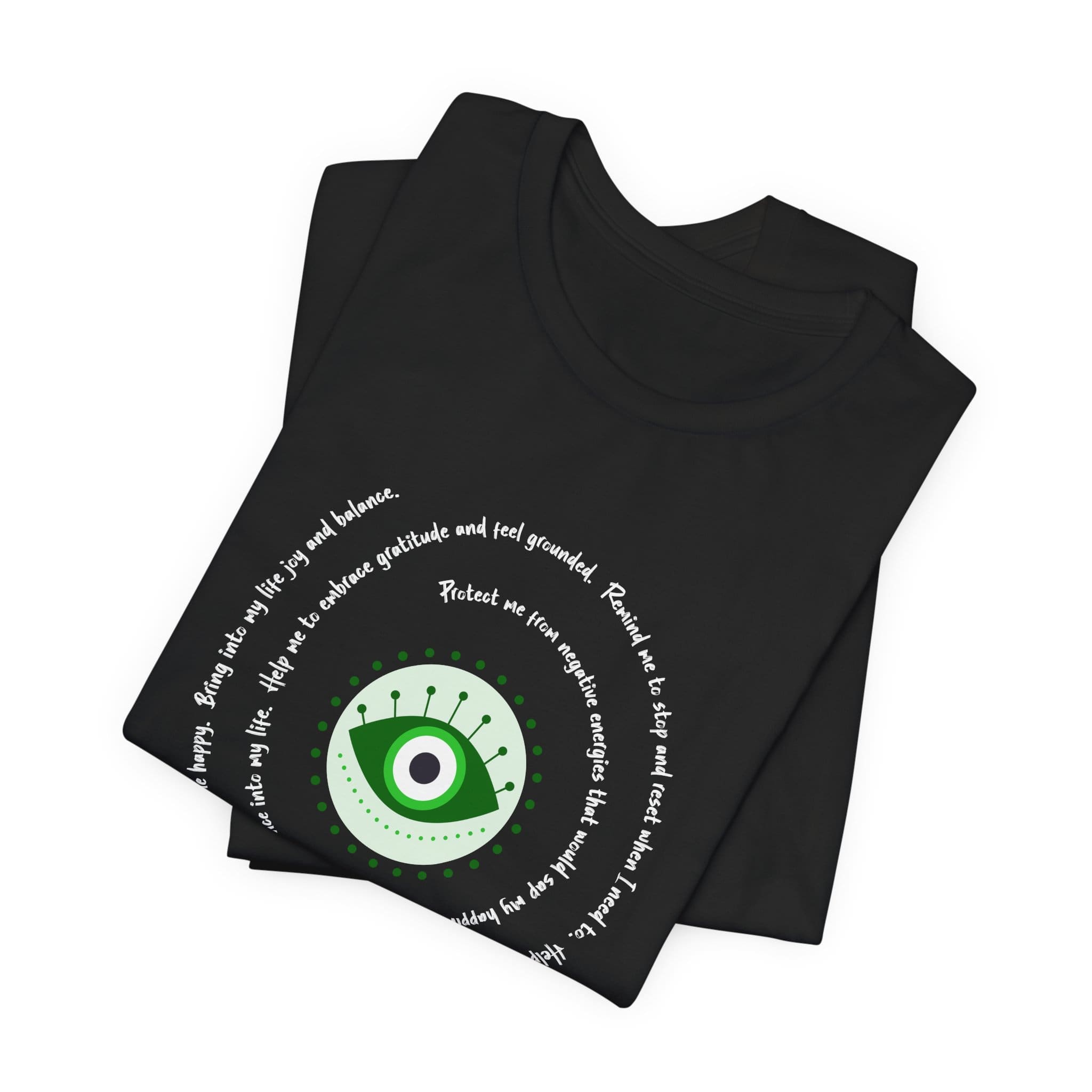 The text printed around the eye in this design is: “Protect me from negative energies that would sap my happiness or seek to bring imbalance into my life. Help me to embrace gratitude and feel grounded. Remind me to stop and reset when I need to. Help me find comfort in engaging in activities that make me happy. Bring into my life joy and balance.”