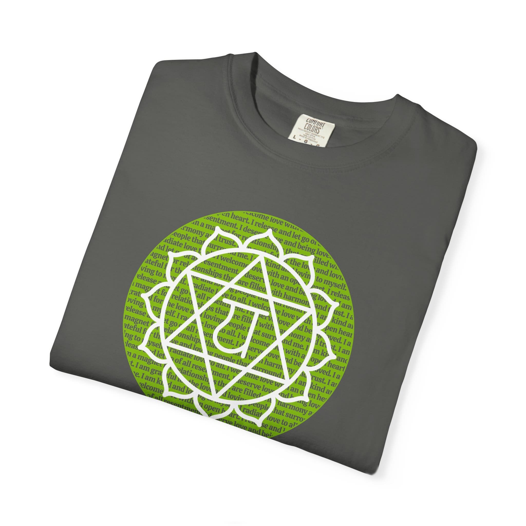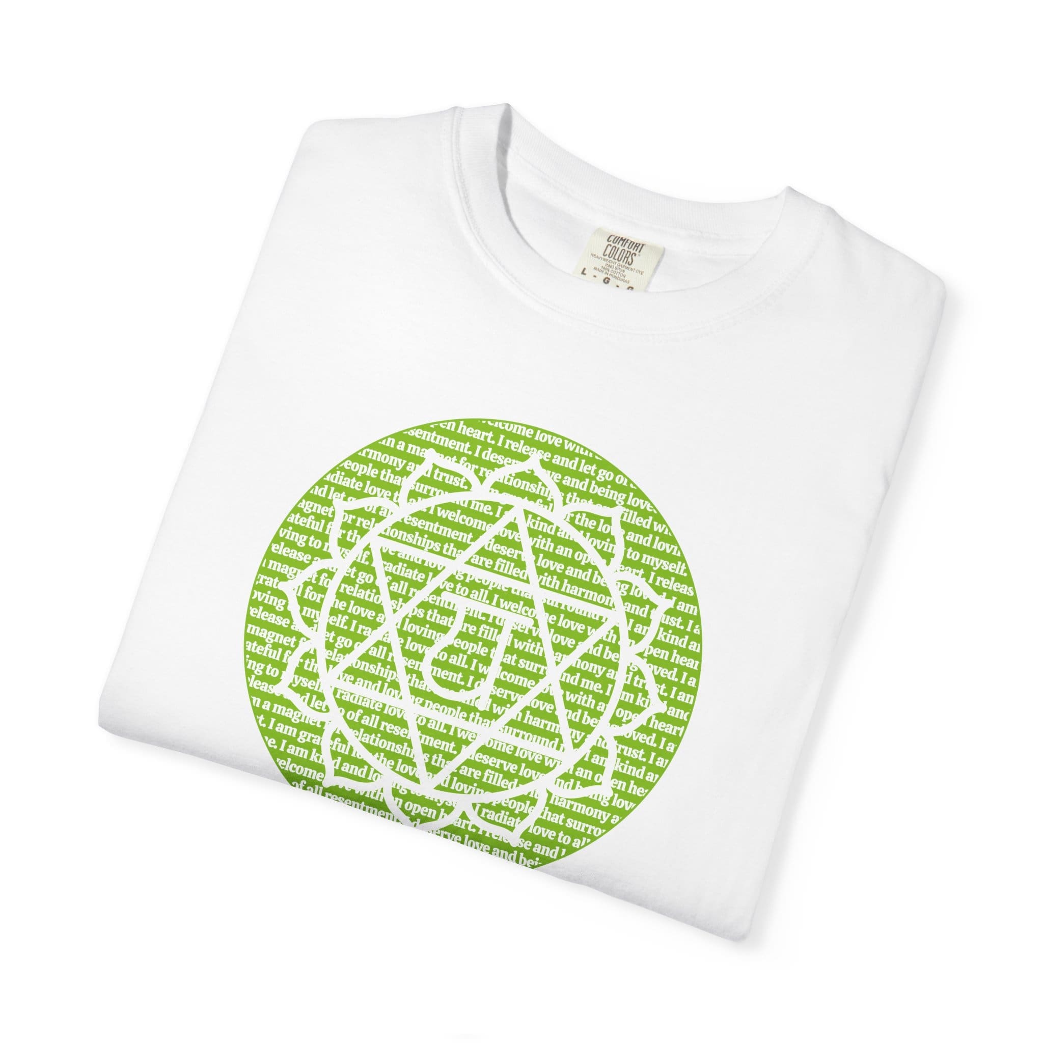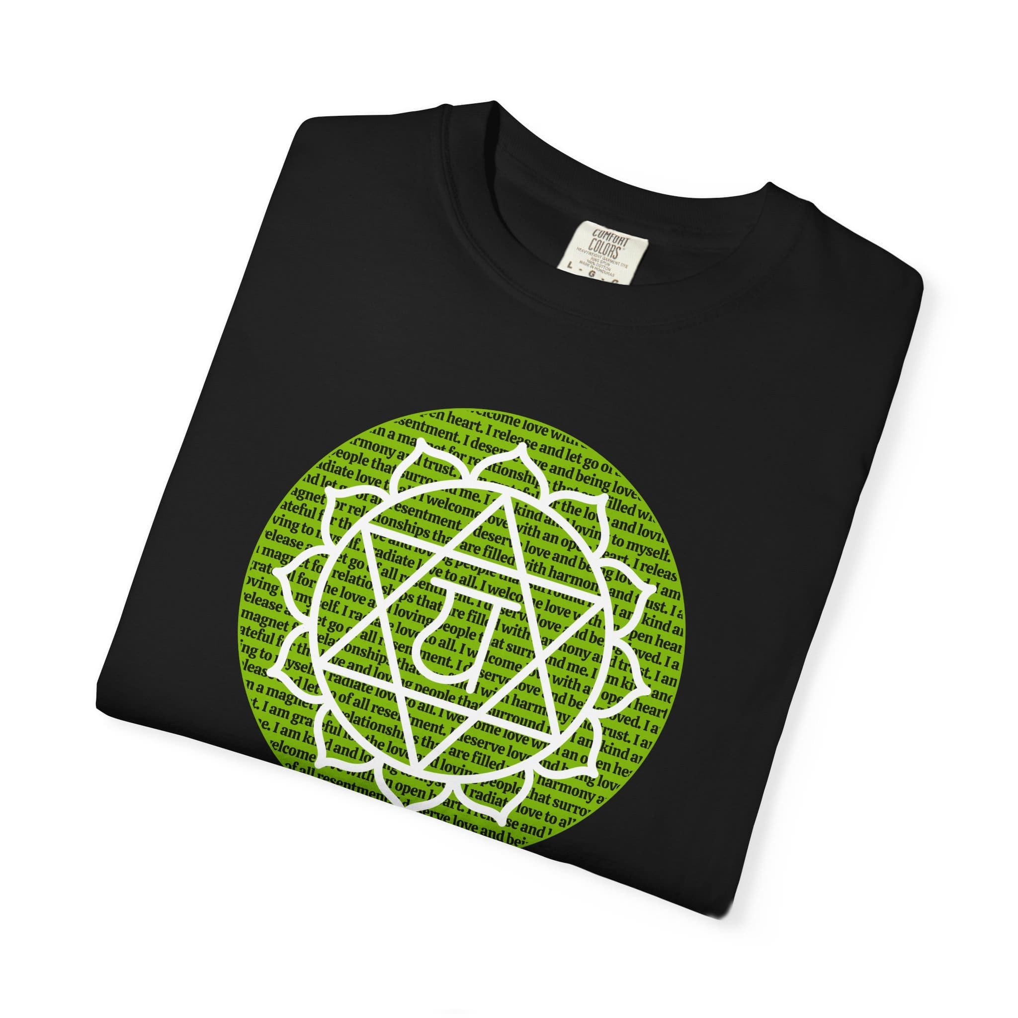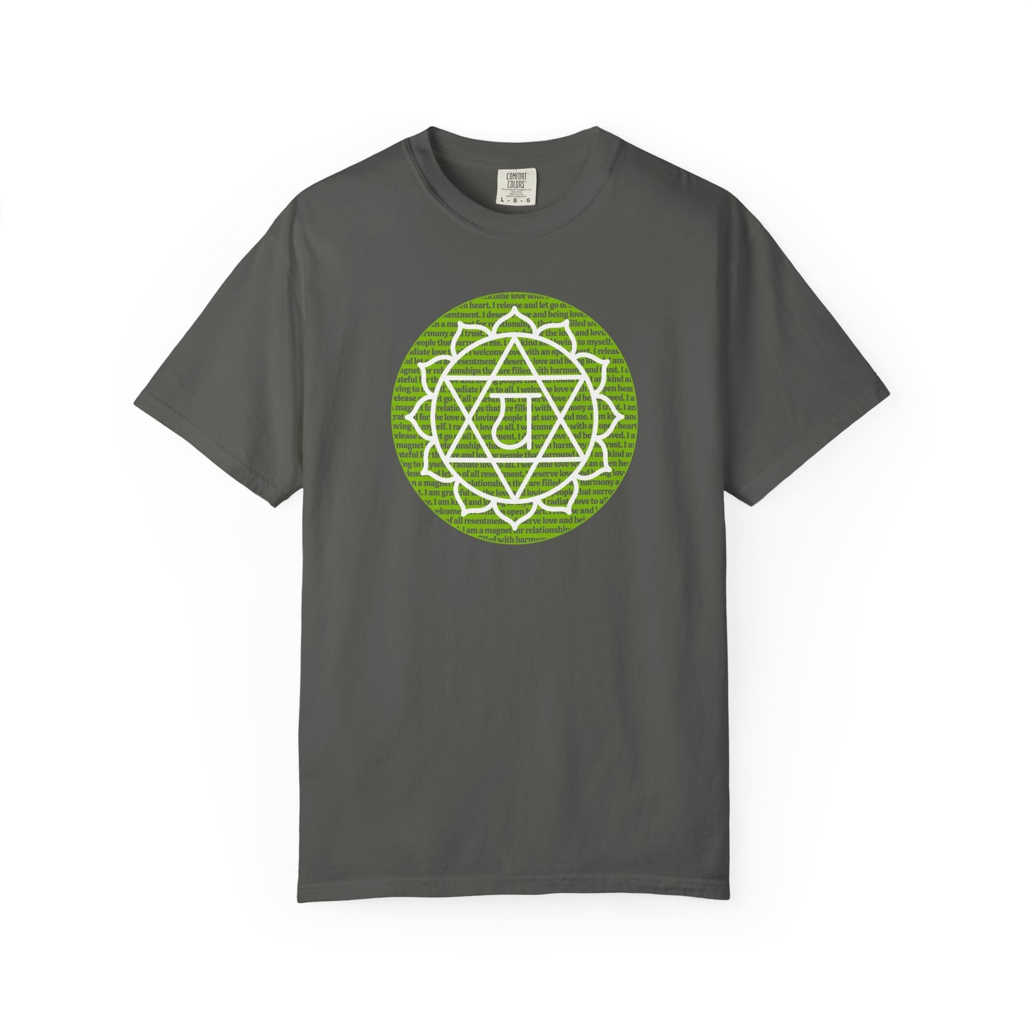 Heart Chakra Affirmations Heavyweight T-Shirt – the background text on this shirt is transparent, allowing the shirt color to show through as the text color. The design on this tee is multi-layered, with the chakra symbol in the forefront and heart chakra affirmations typed out in the background.