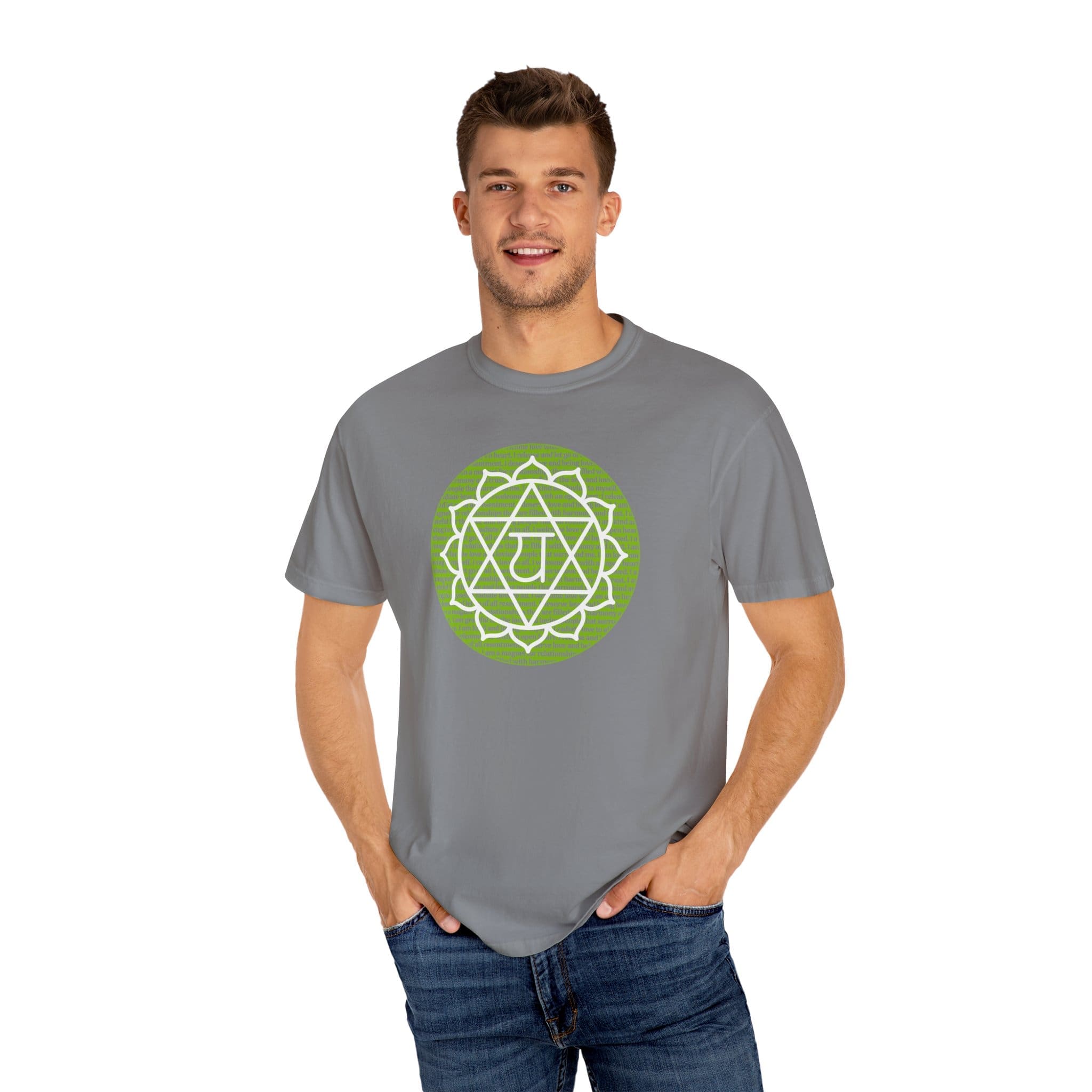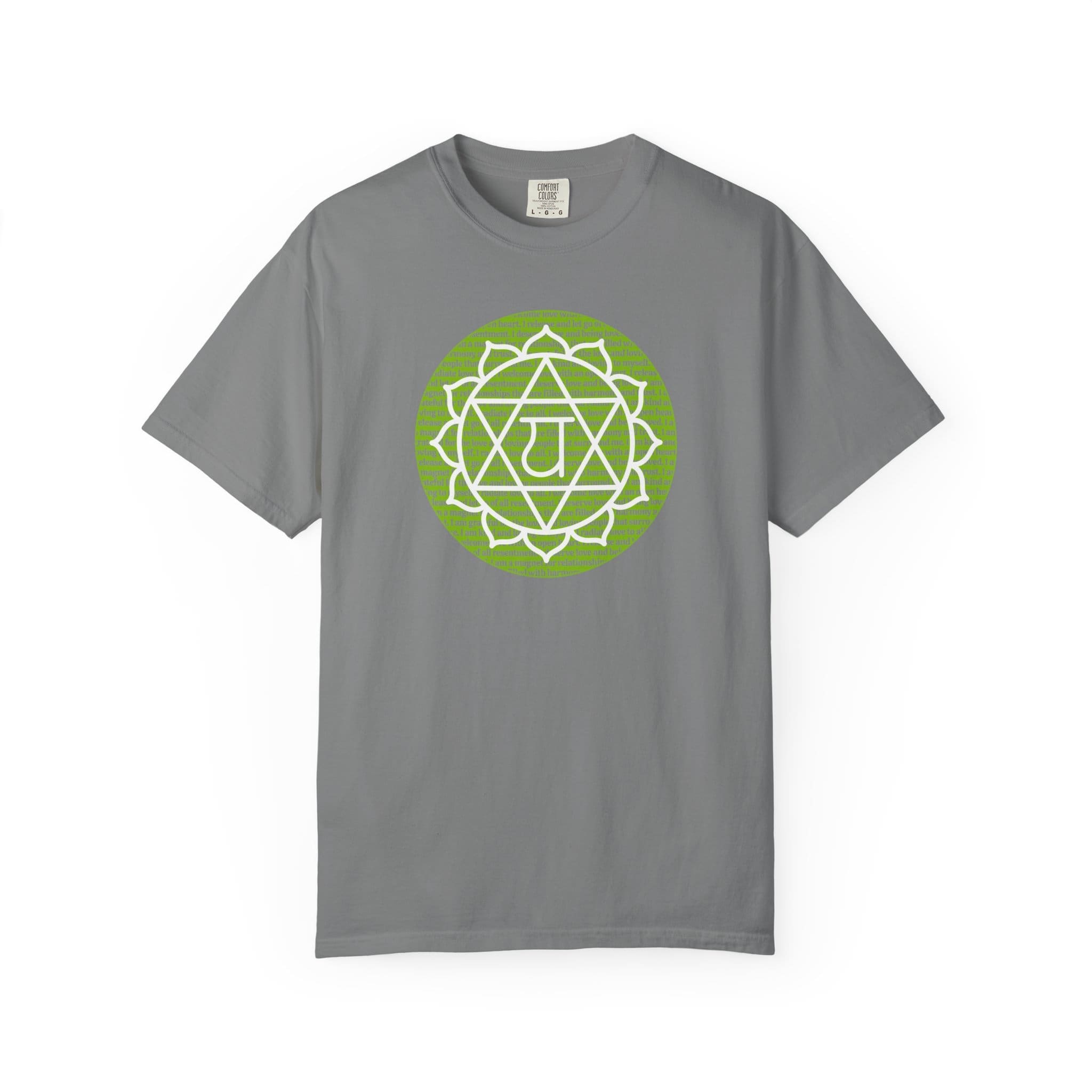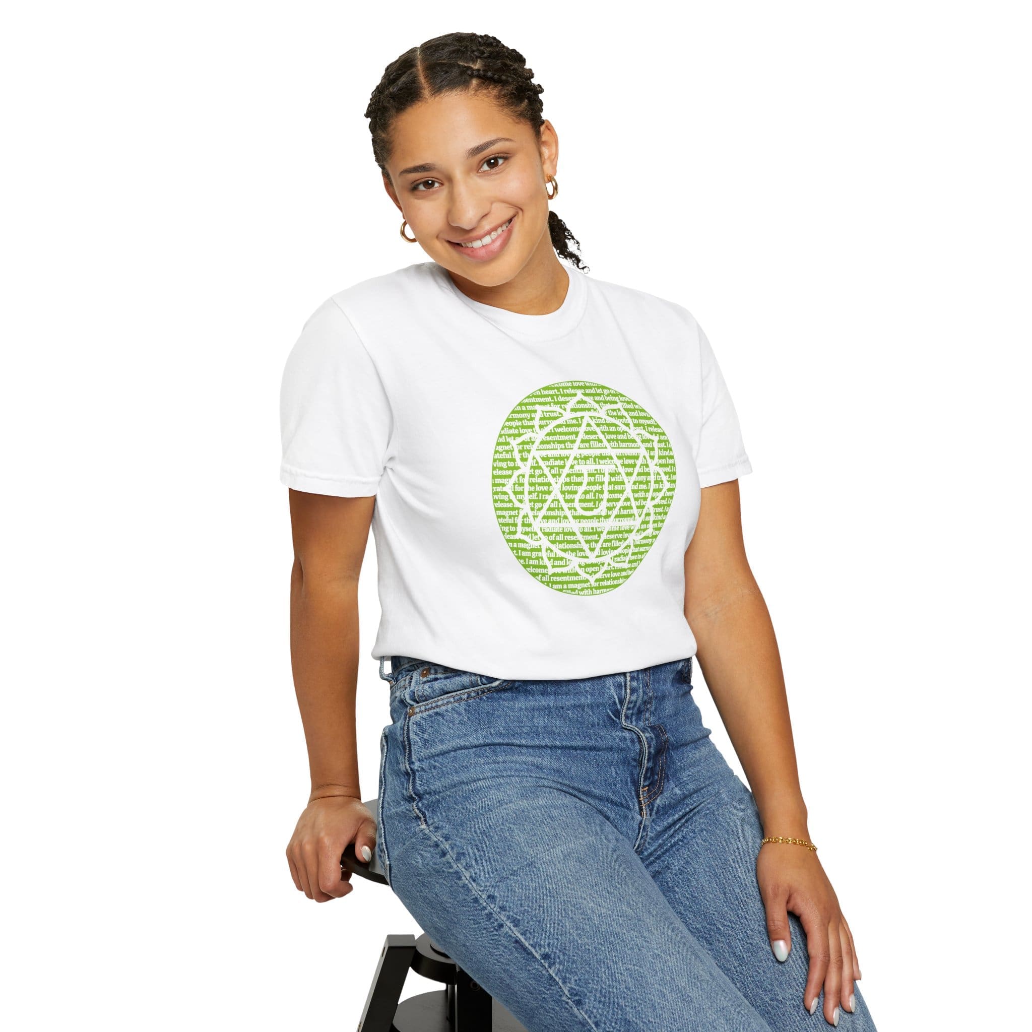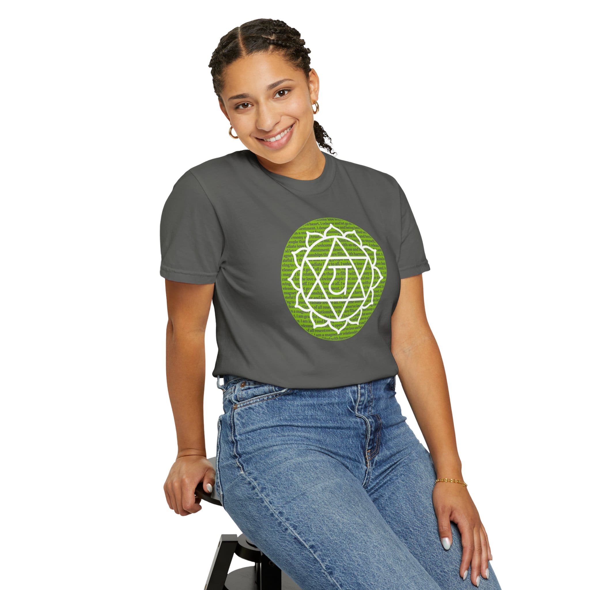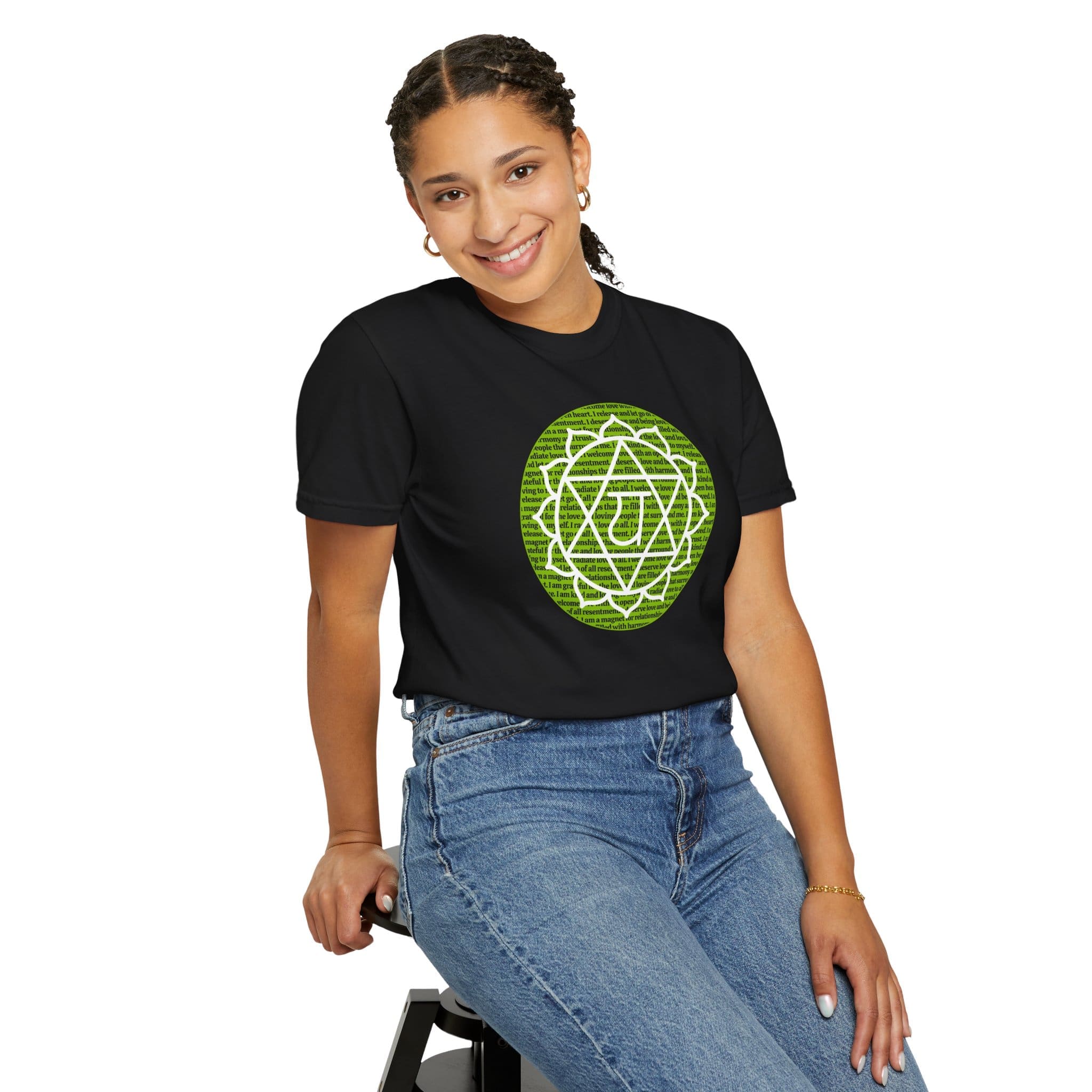 Heart Chakra Affirmations Heavyweight T-Shirt – the background text on this shirt is transparent, allowing the shirt color to show through as the text color. The design on this tee is multi-layered, with the chakra symbol in the forefront and heart chakra affirmations typed out in the background.