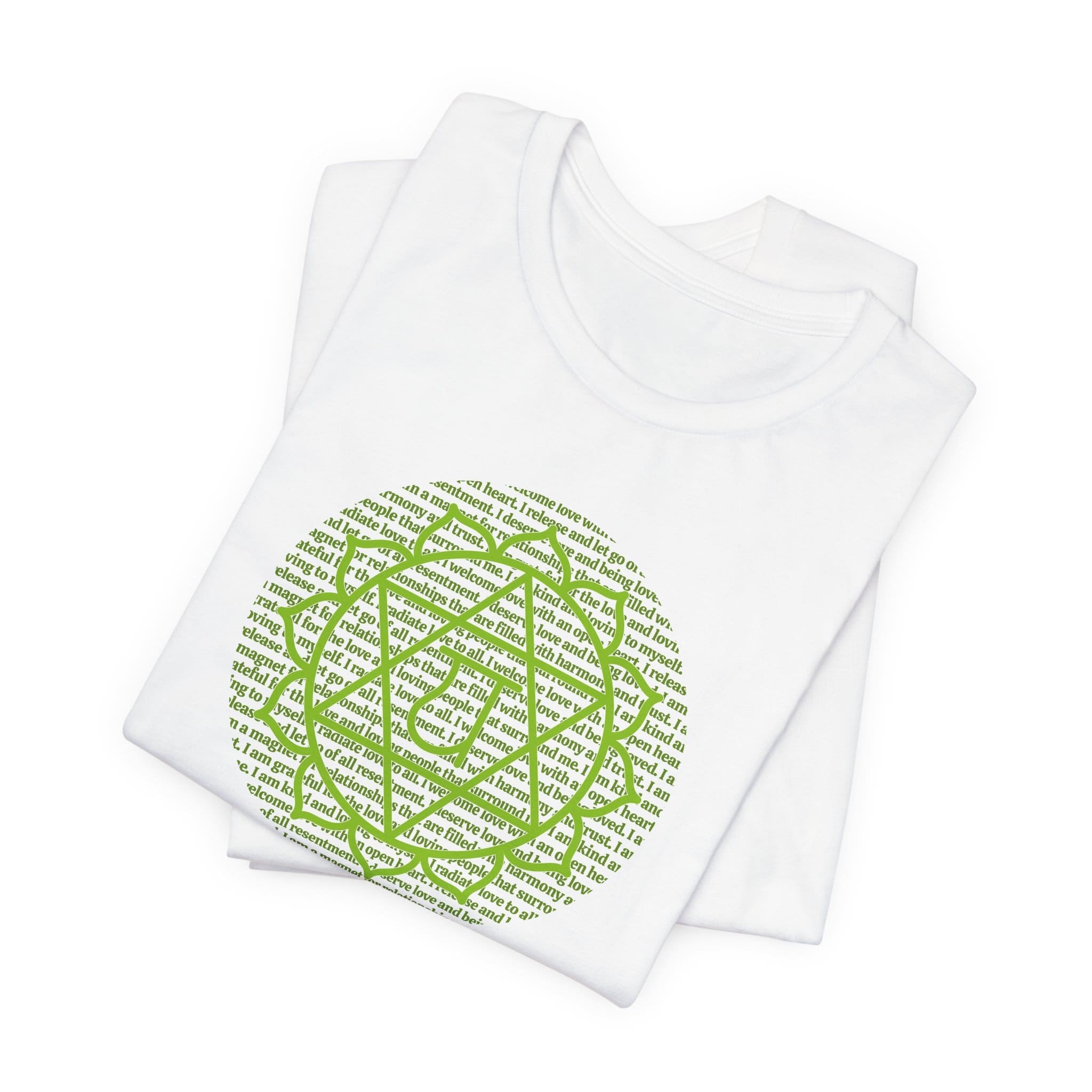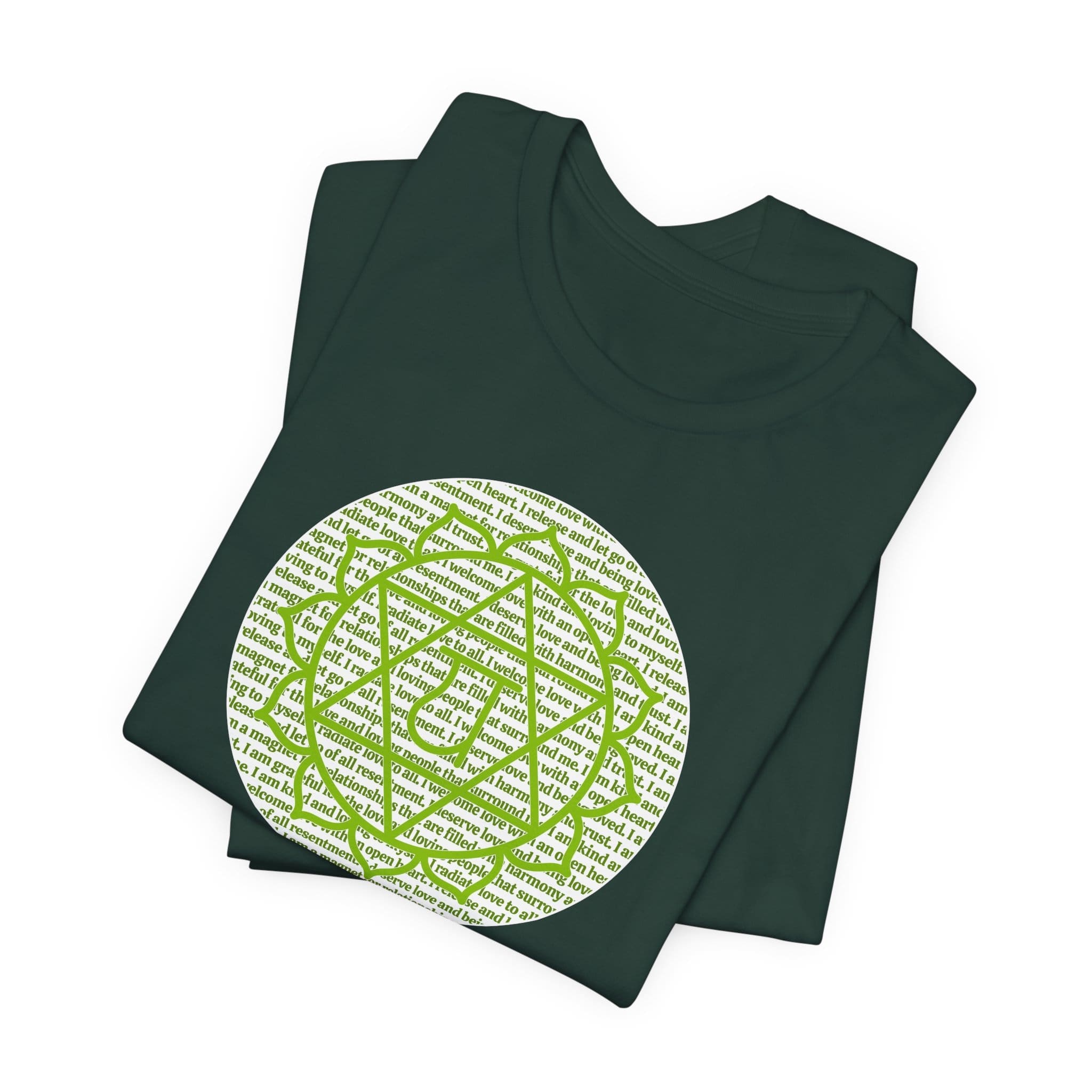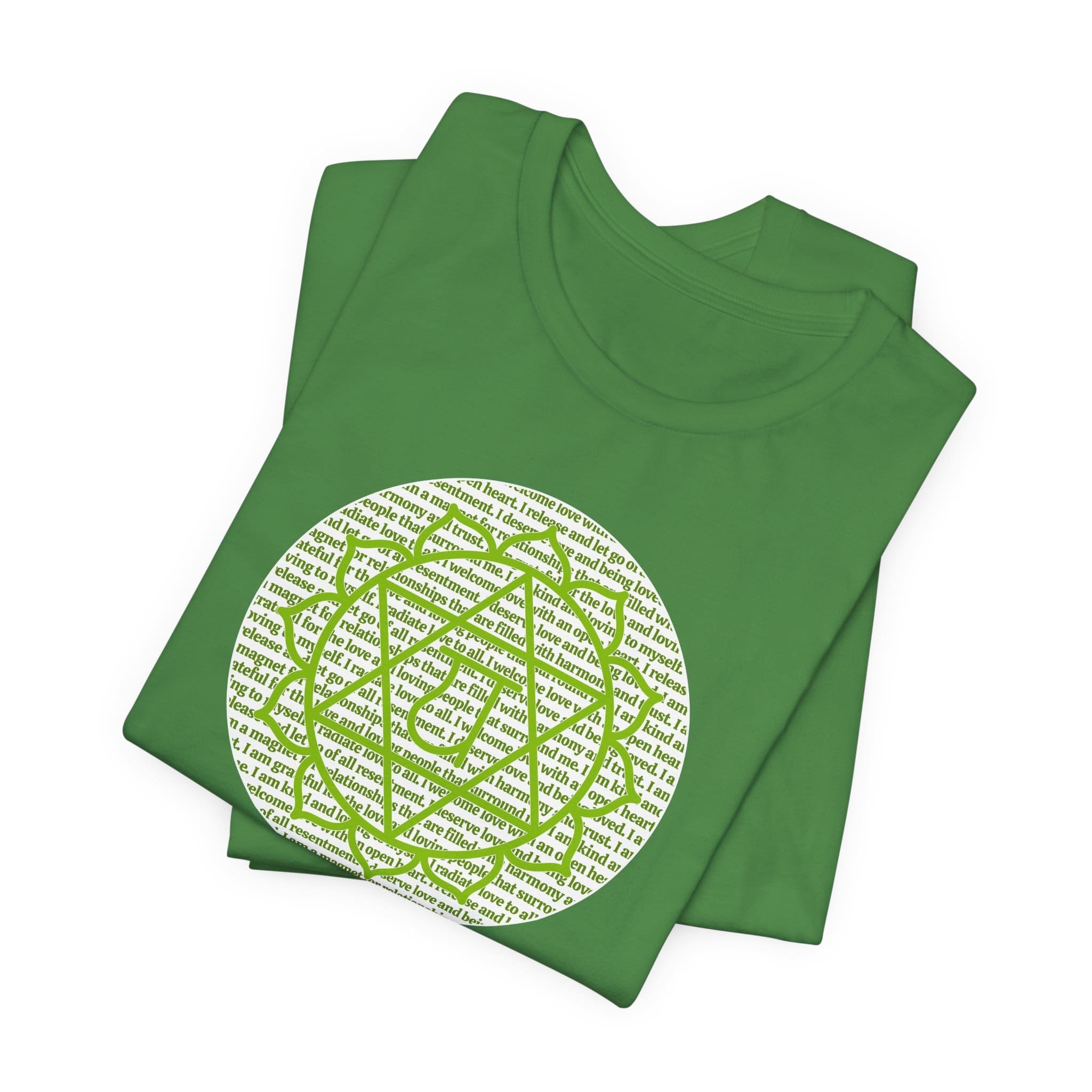 Heart Chakra Affirmations Lightweight T-Shirt with Green Text – The design on this tee is multi-layered, with the chakra symbol in the forefront and heart chakra affirmations typed out in the background.
