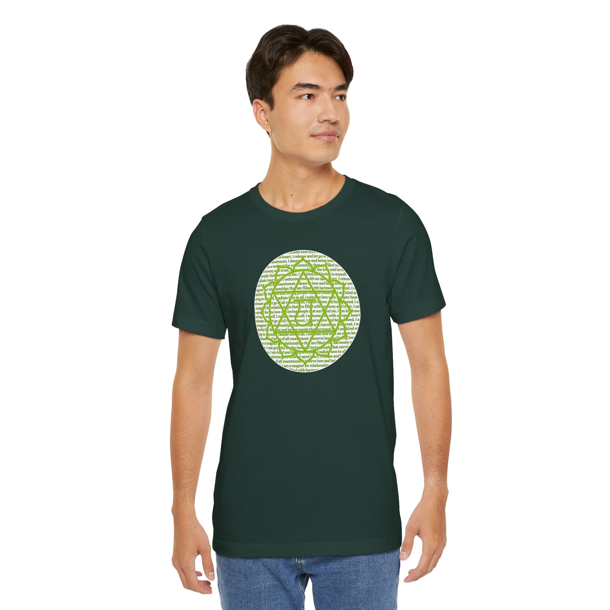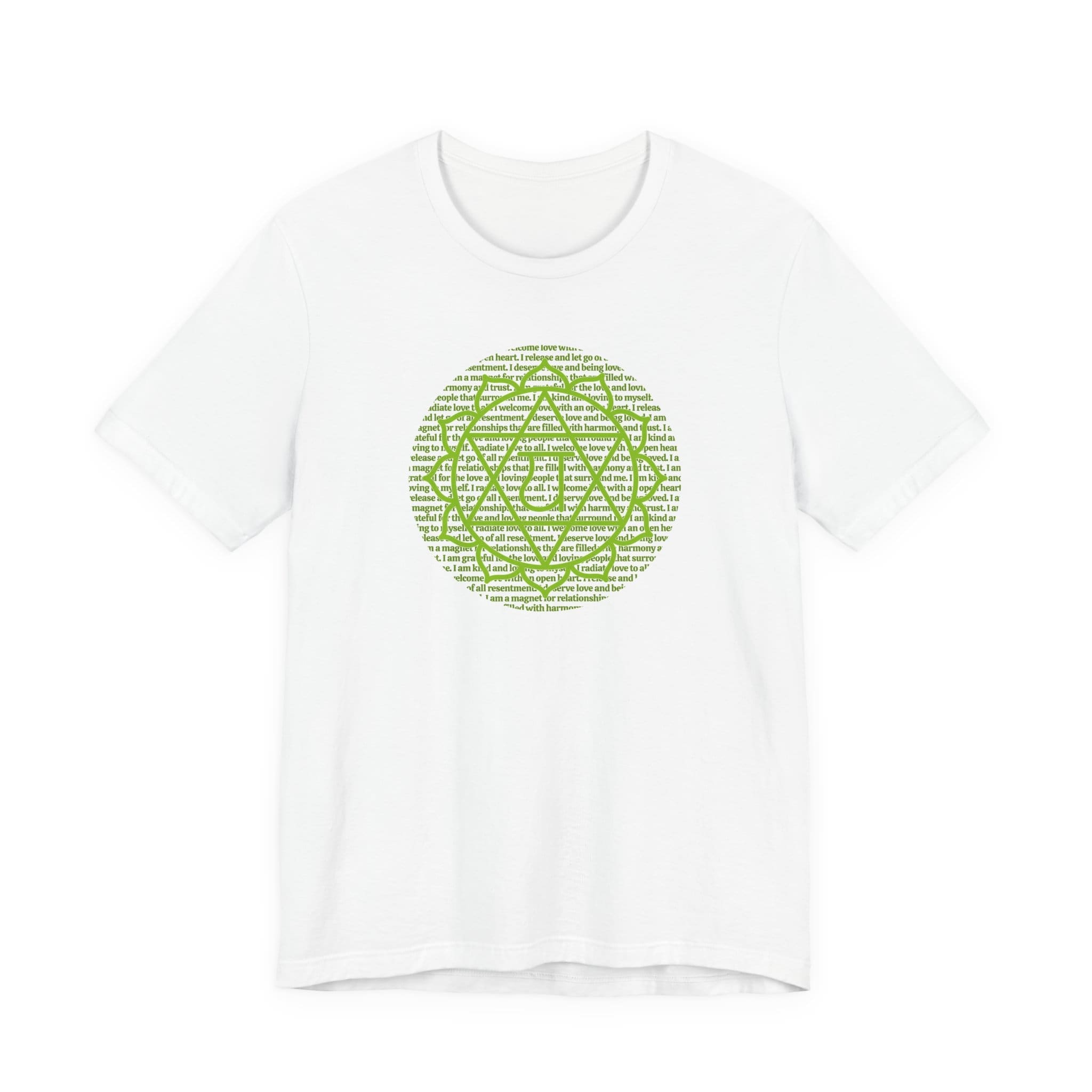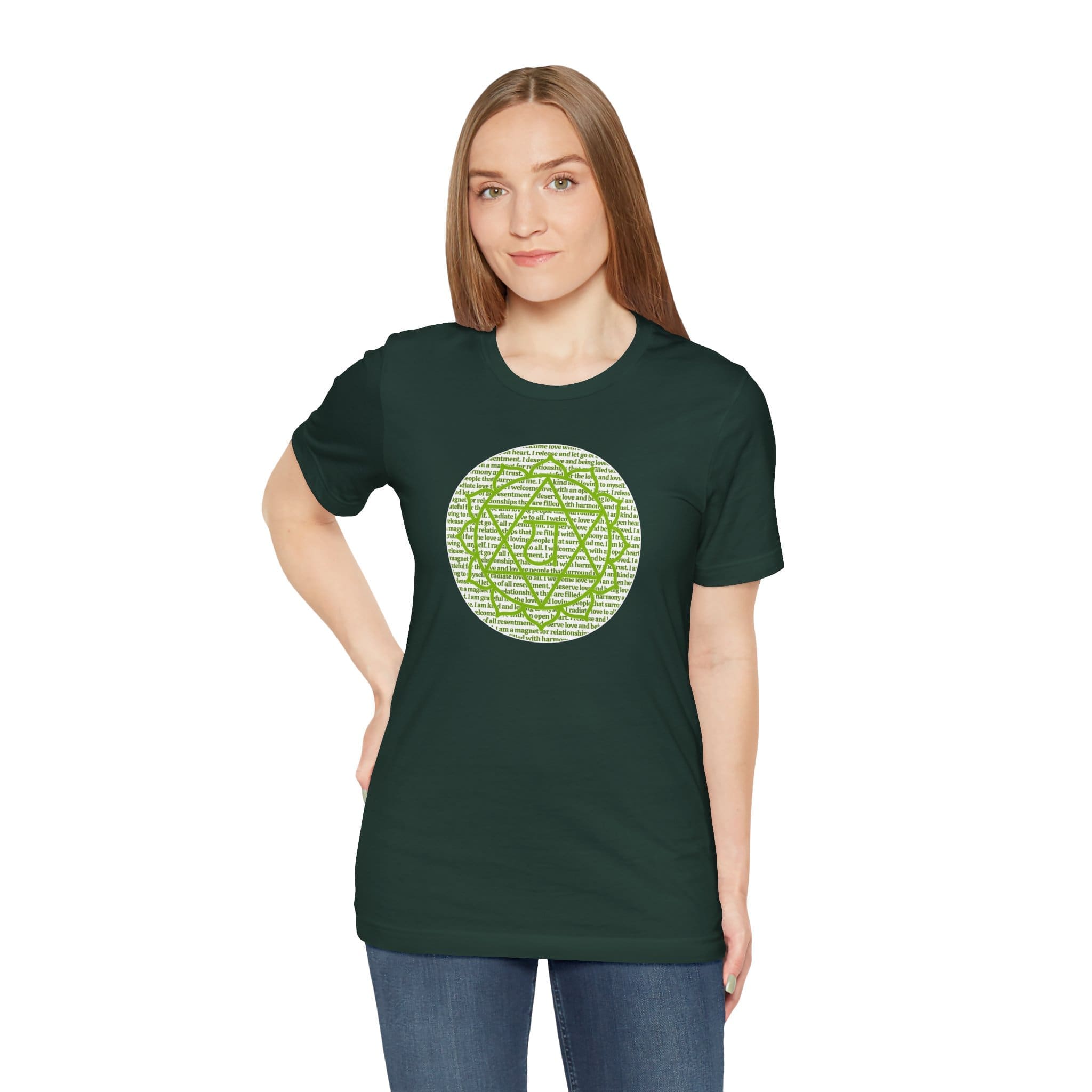 Heart Chakra Affirmations Lightweight T-Shirt with Green Text – The design on this tee is multi-layered, with the chakra symbol in the forefront and heart chakra affirmations typed out in the background.