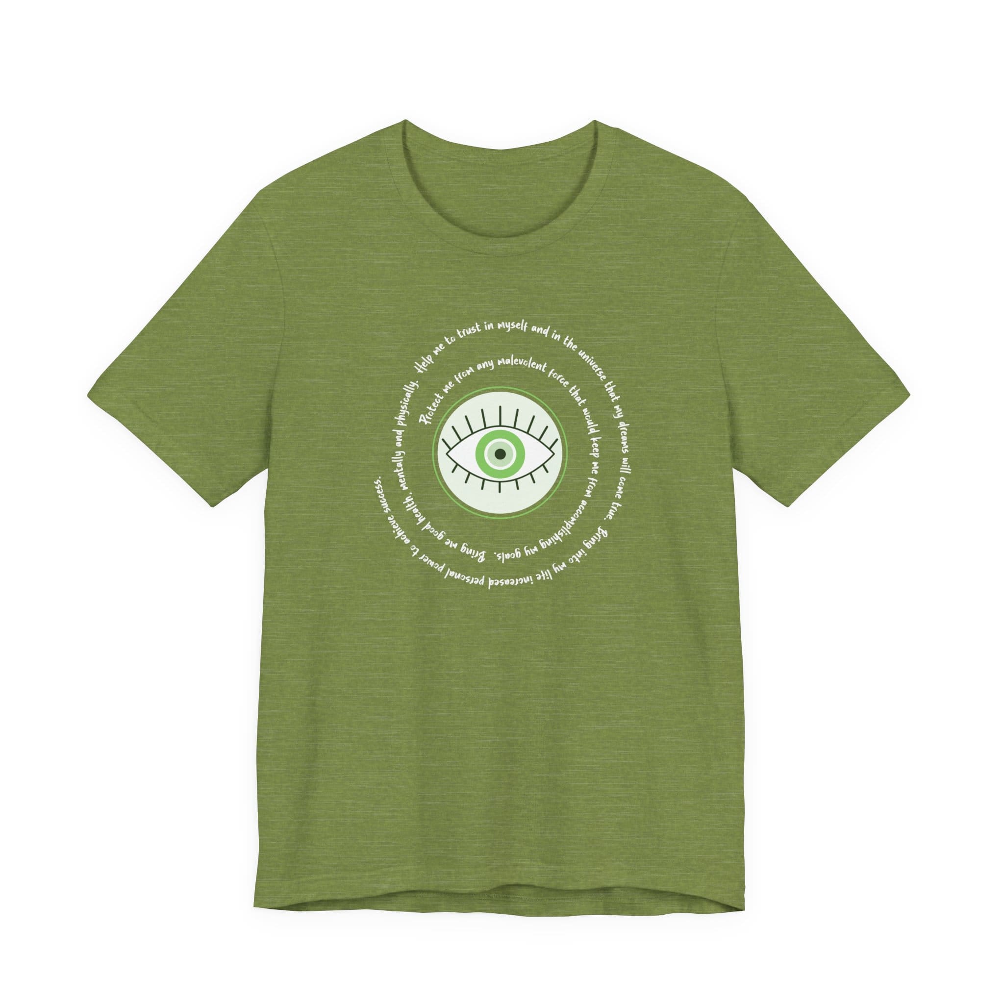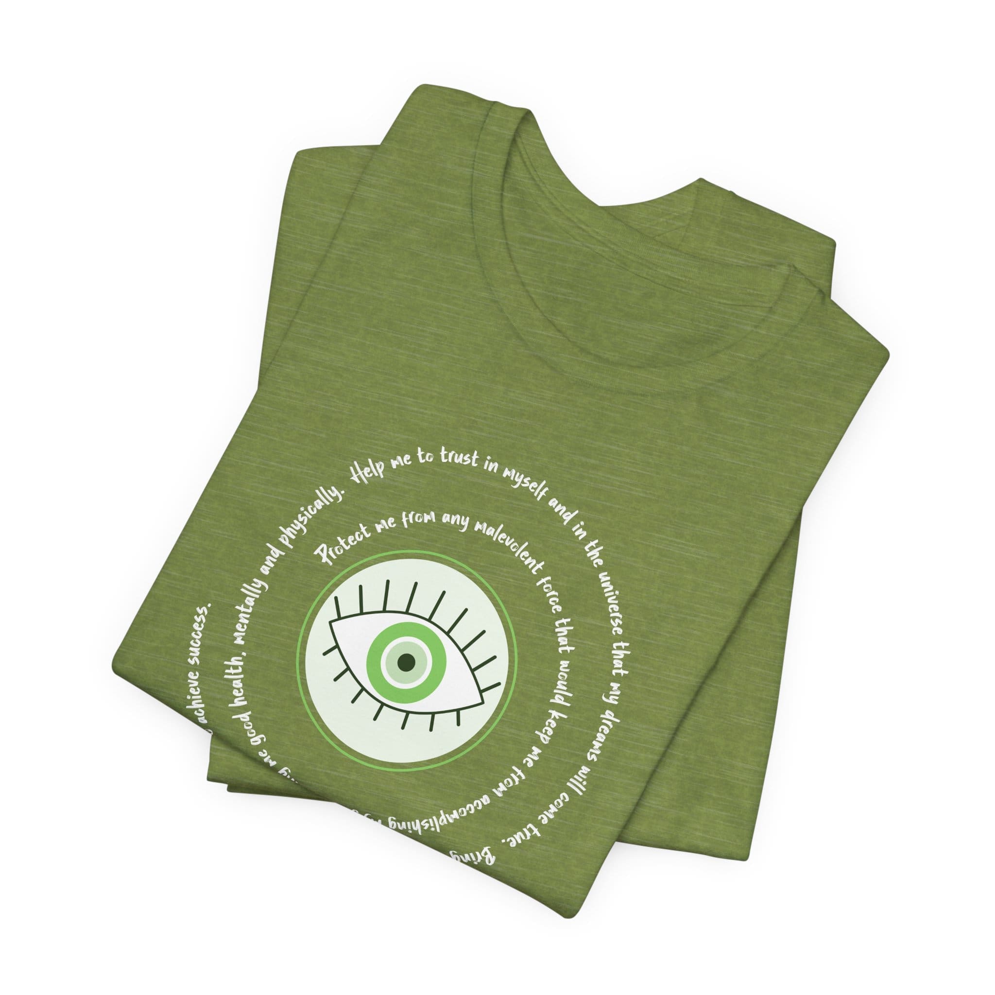 Light Green Evil Eye Protection Lightweight T-Shirt – White Text – The Evil Eye is an ancient symbol believed to ward off negativity. Many cultures have used this symbol for protection over the ages. It also serves as a reminder to be mindful of our thoughts and radiate positive vibes out into our lives.