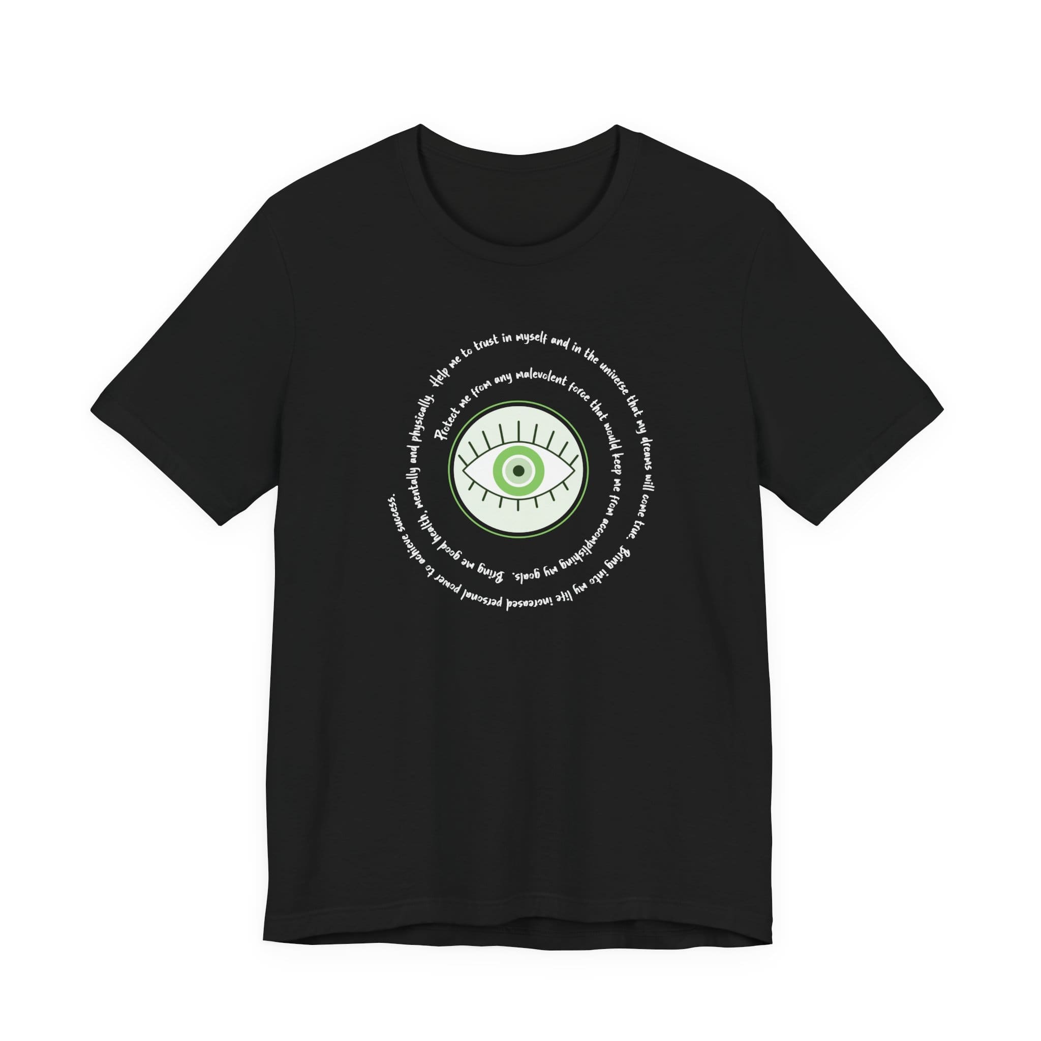 The text printed around the eye in this design is: “Protect me from any malevolent force that would keep me from accomplishing my goals. Bring me good health, mentally and physically. Help me to trust in myself and in the universe that my dreams will come true. Bring into my life increased personal power to achieve success.”