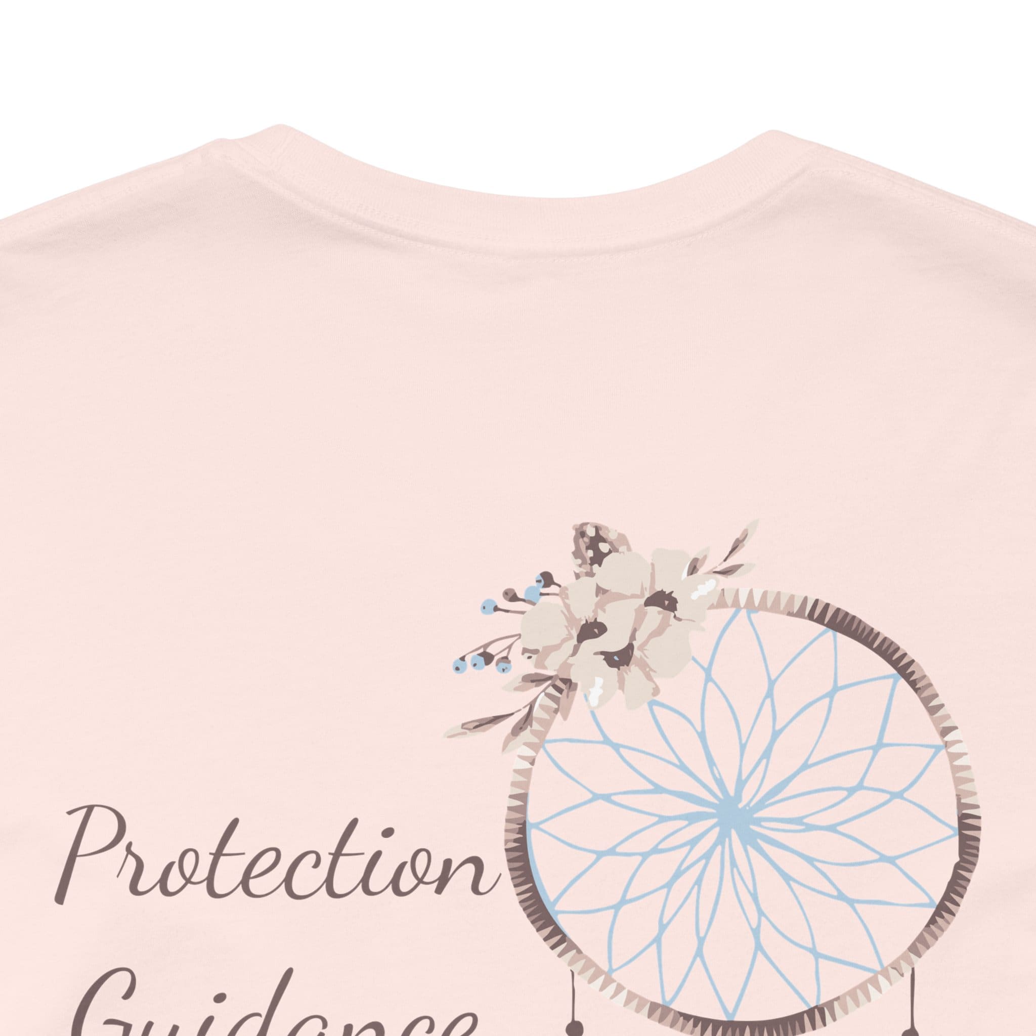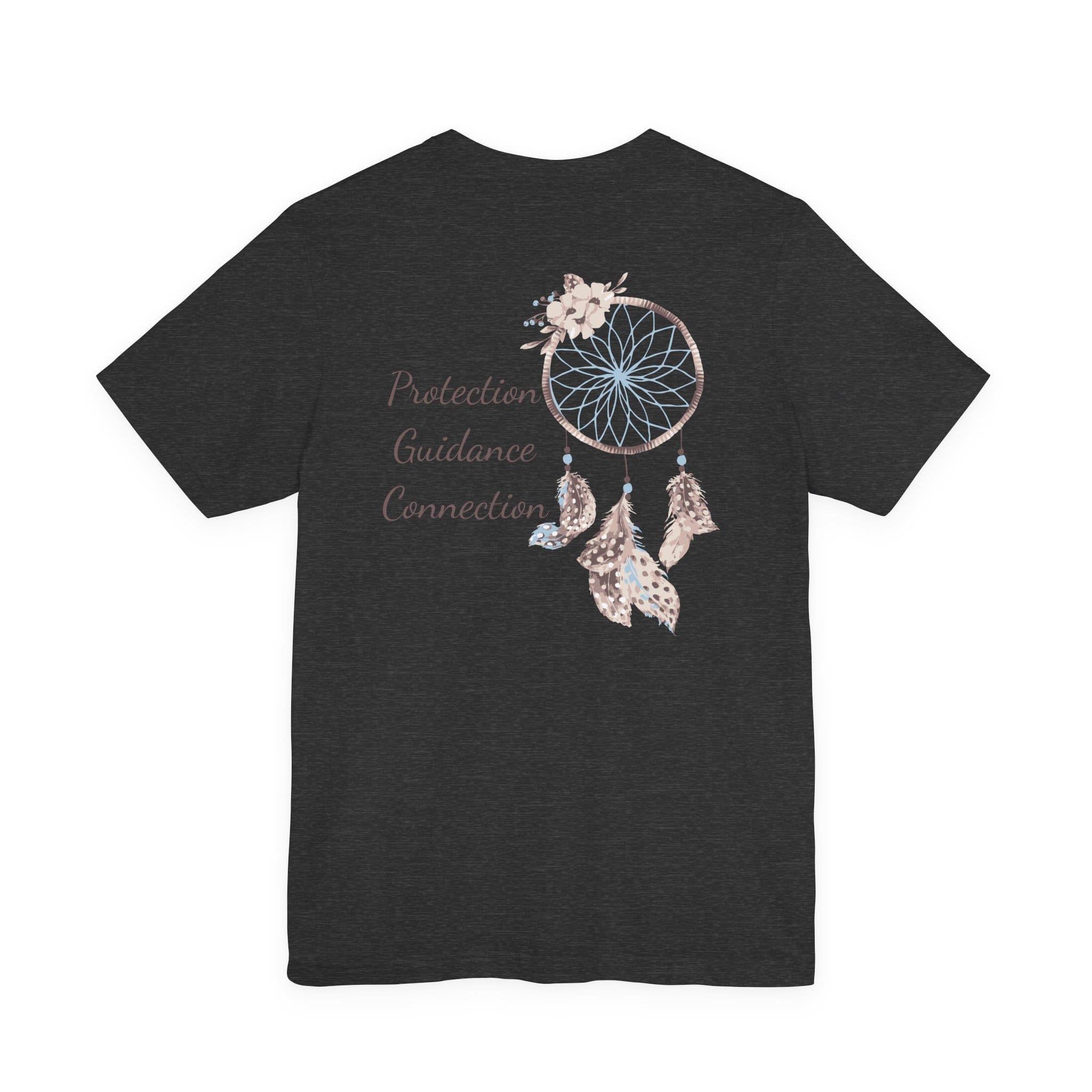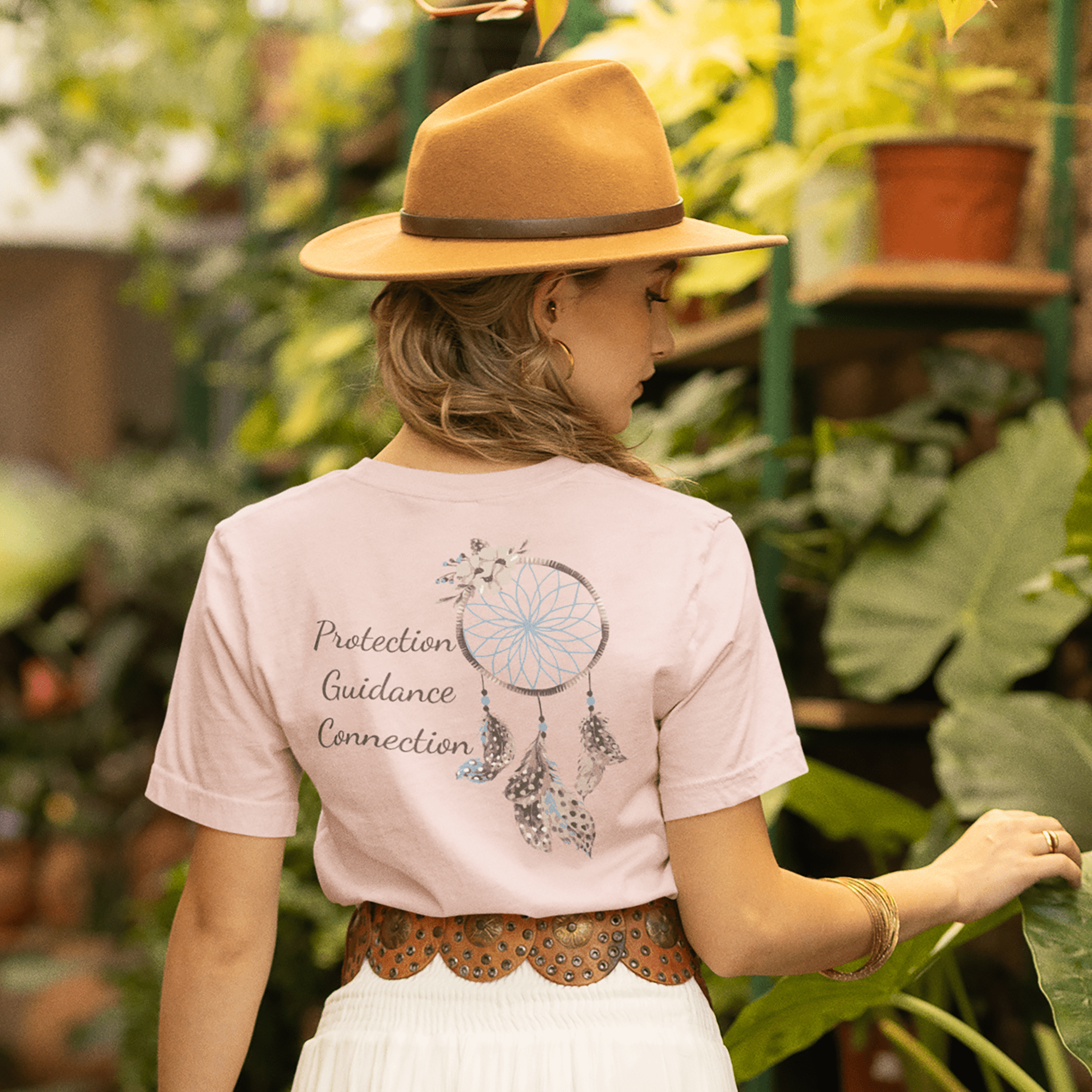 Protection, Guidance, Connection Dreamcatcher Tee – this is an excellent shirt for cultivating a positive attitude about personal growth & spirituality, or just because! A Dreamcatcher can also represent these inspiring words.