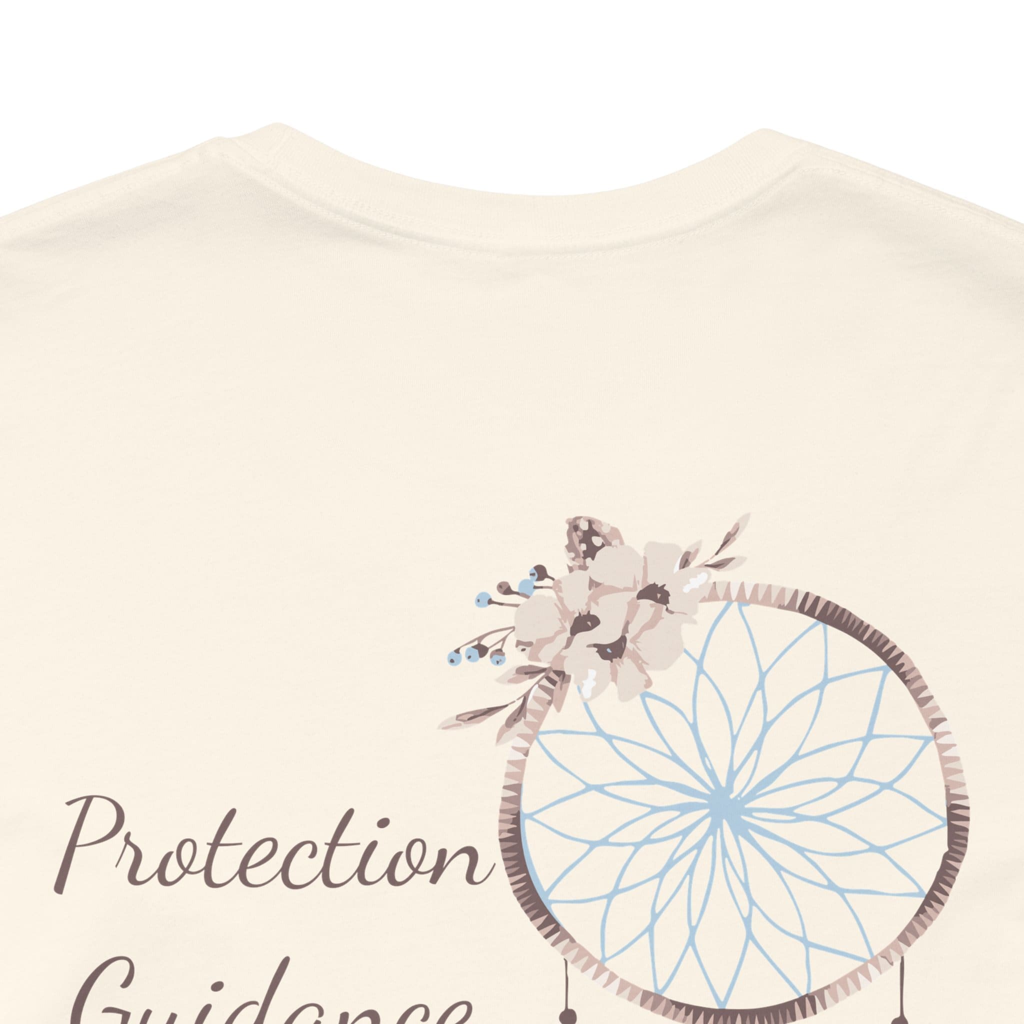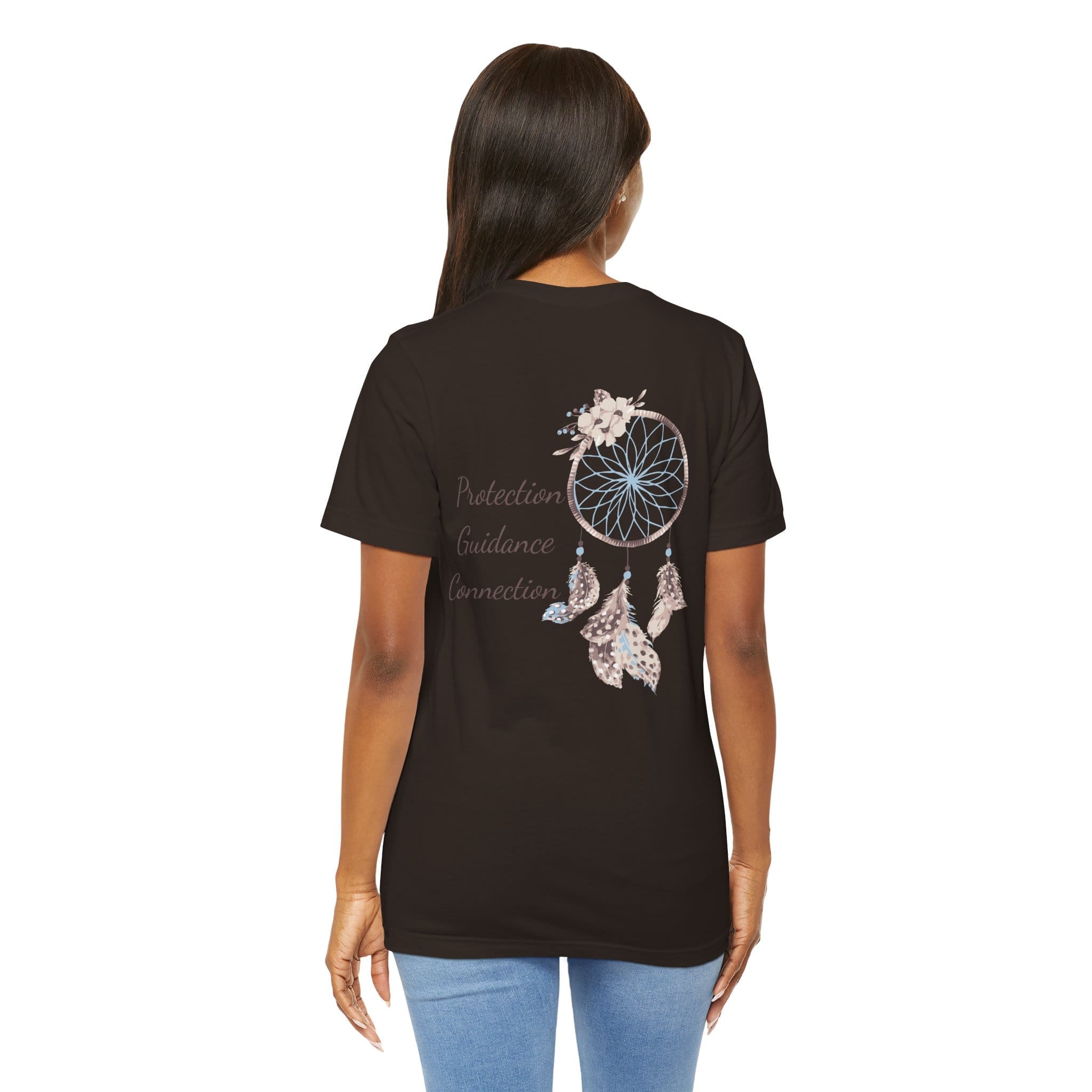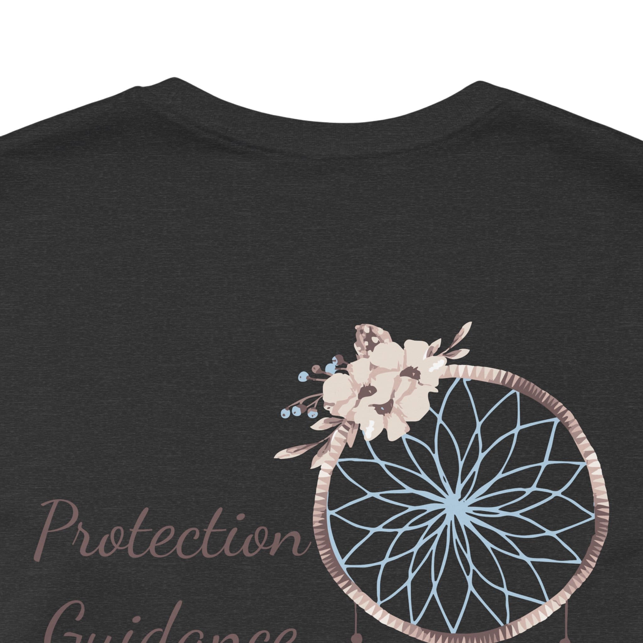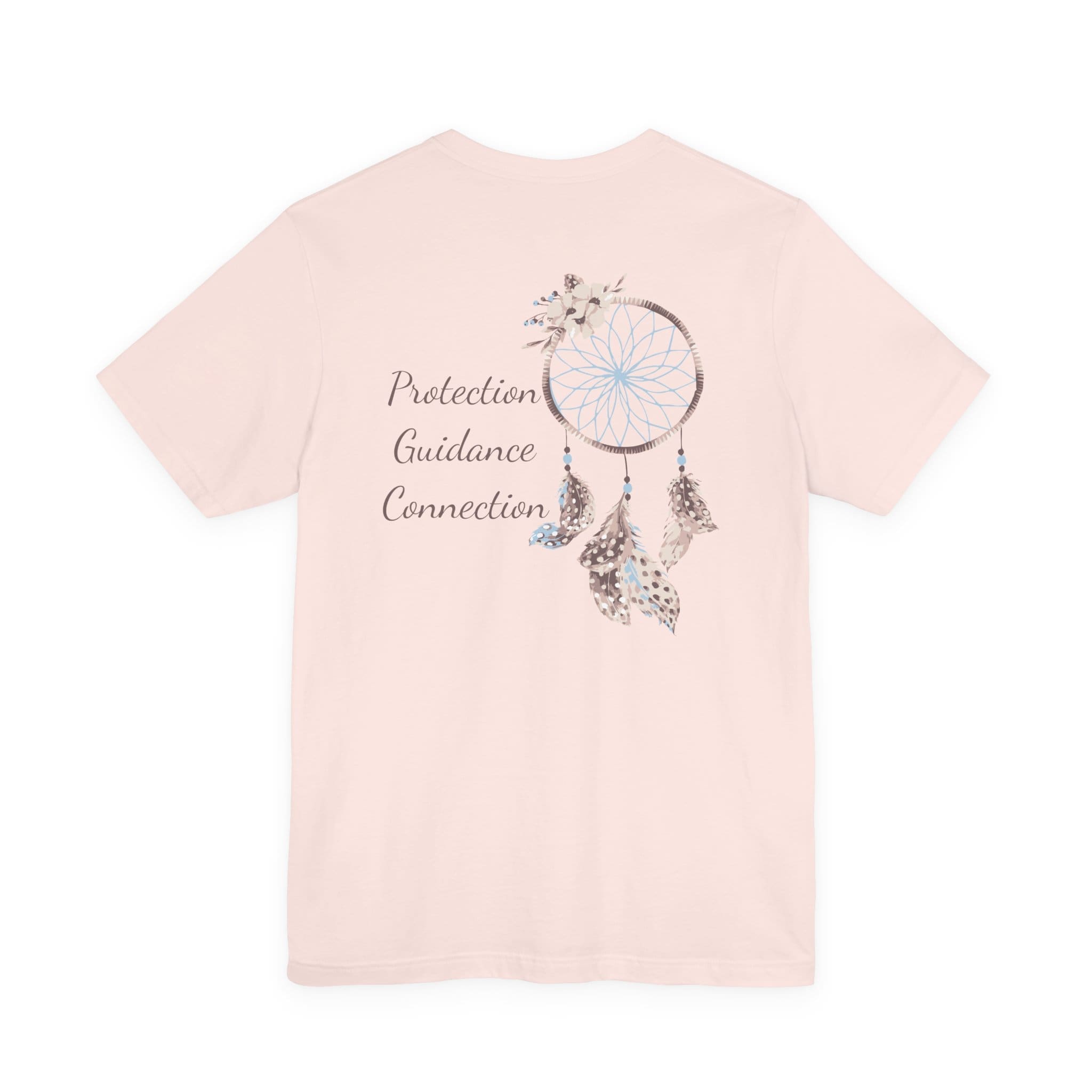 Protection, Guidance, Connection Dreamcatcher Tee – this is an excellent shirt for cultivating a positive attitude about personal growth & spirituality, or just because! A Dreamcatcher can also represent these inspiring words.