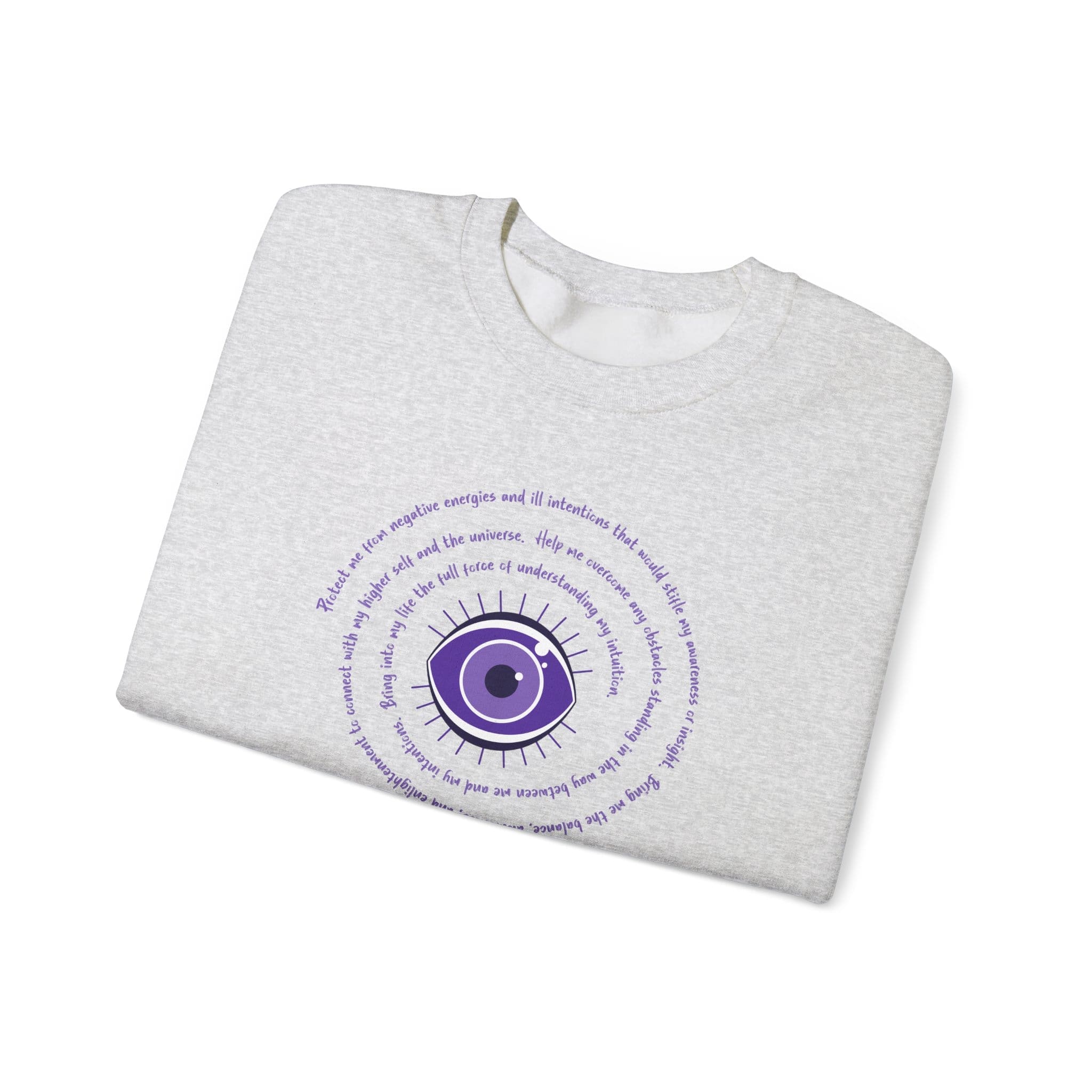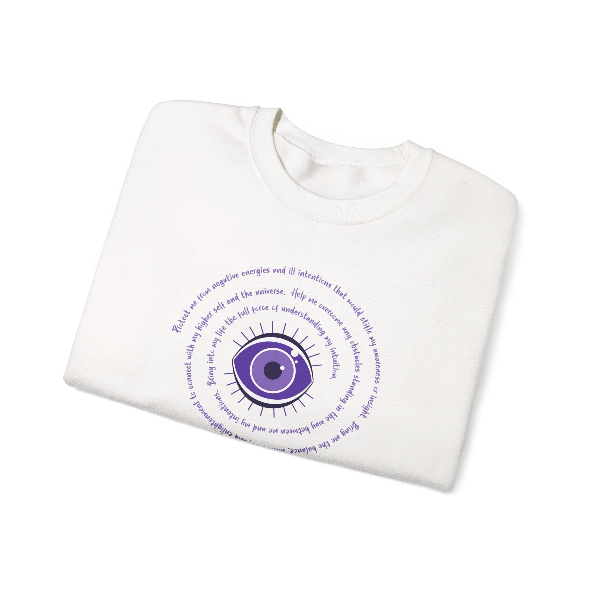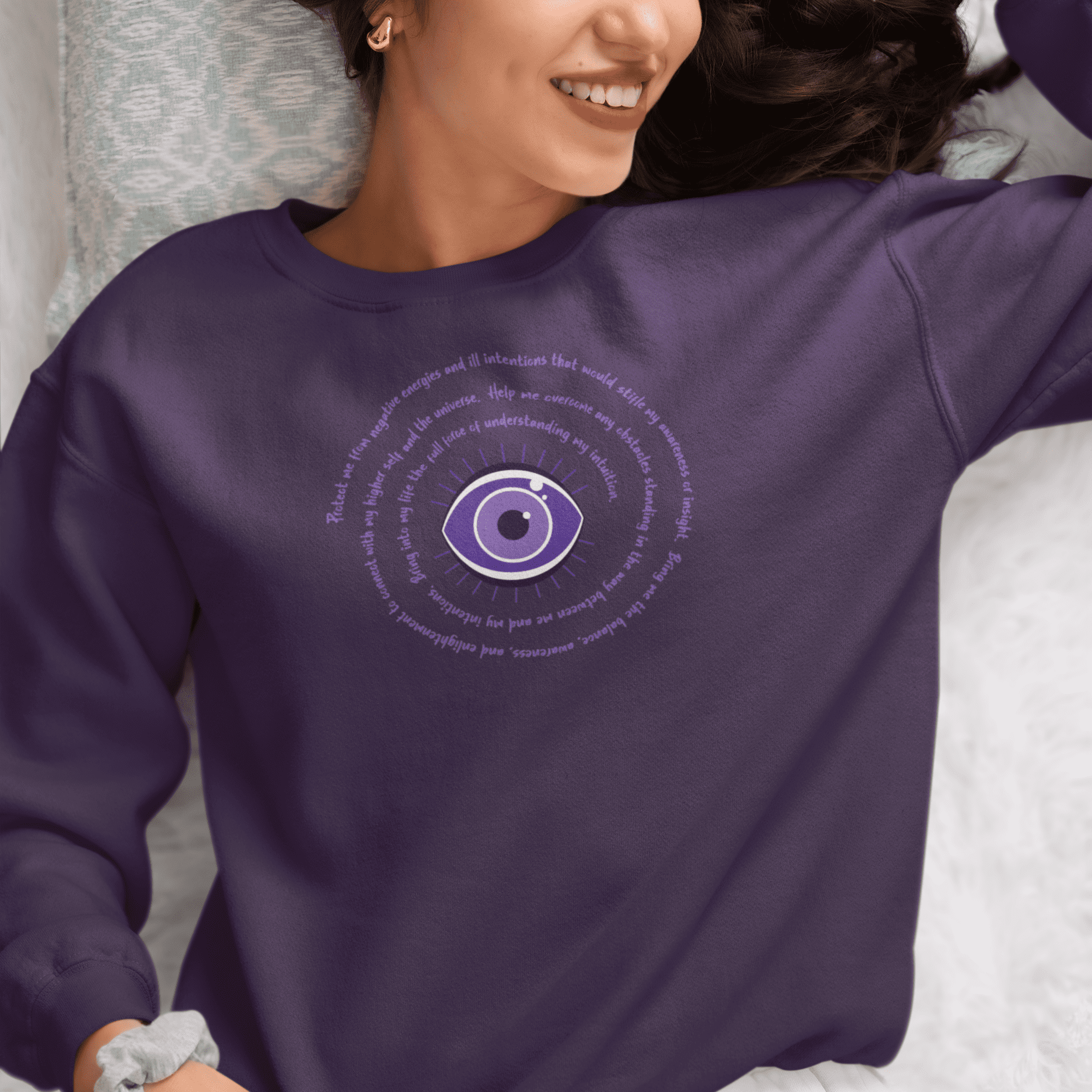 Purple Evil Eye Protection Sweatshirt – The Evil Eye is an ancient symbol believed to ward off negativity. Many cultures have used this symbol for protection over the ages. It also serves as a reminder to be mindful of our thoughts and radiate positive vibes out into our lives.
