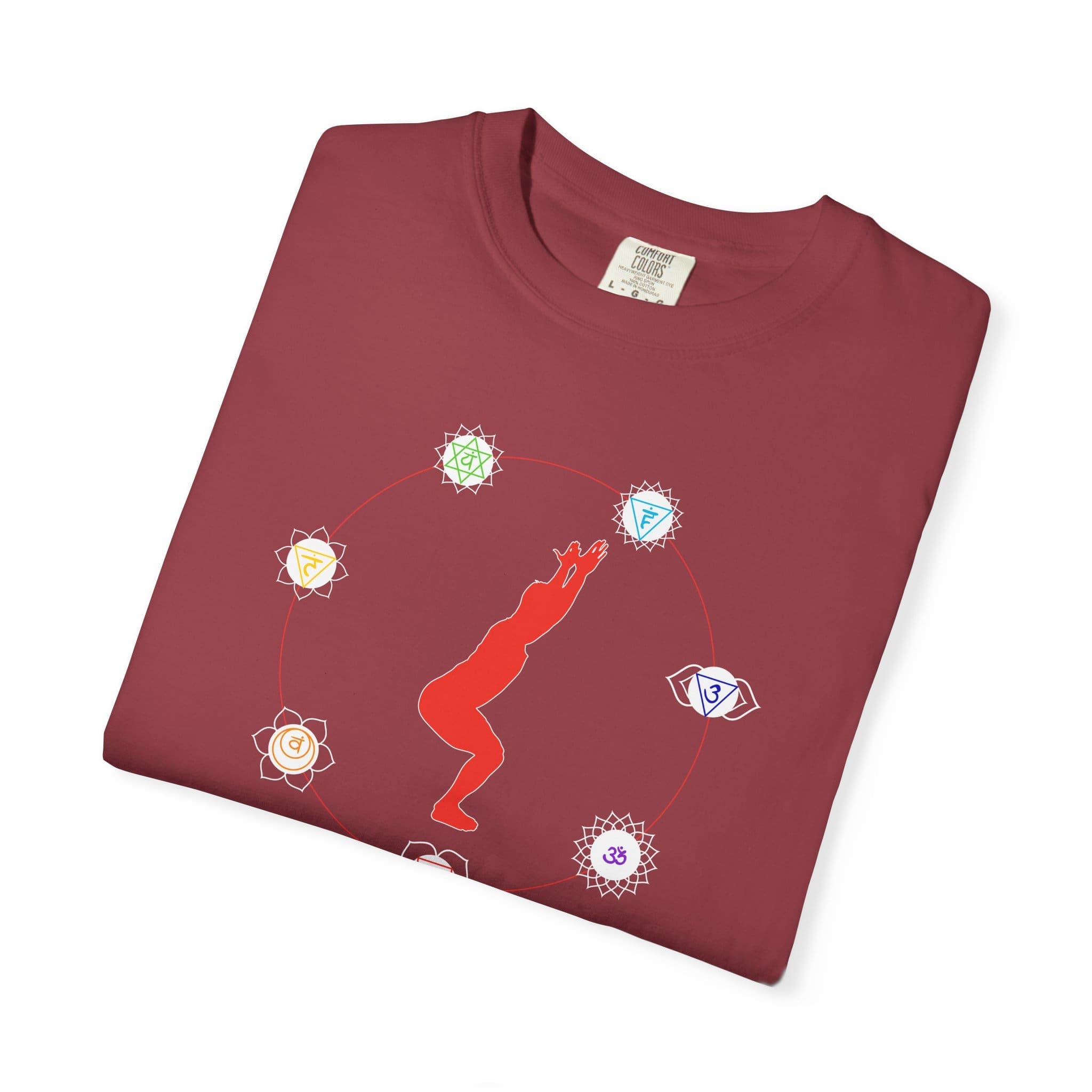 This shirt features the symbols for the seven main chakras surrounding a male silhouette in the chair pose – a helpful reminder and mindfulness gift (for yourself or others) to promote harmony and enhance emotional well-being.