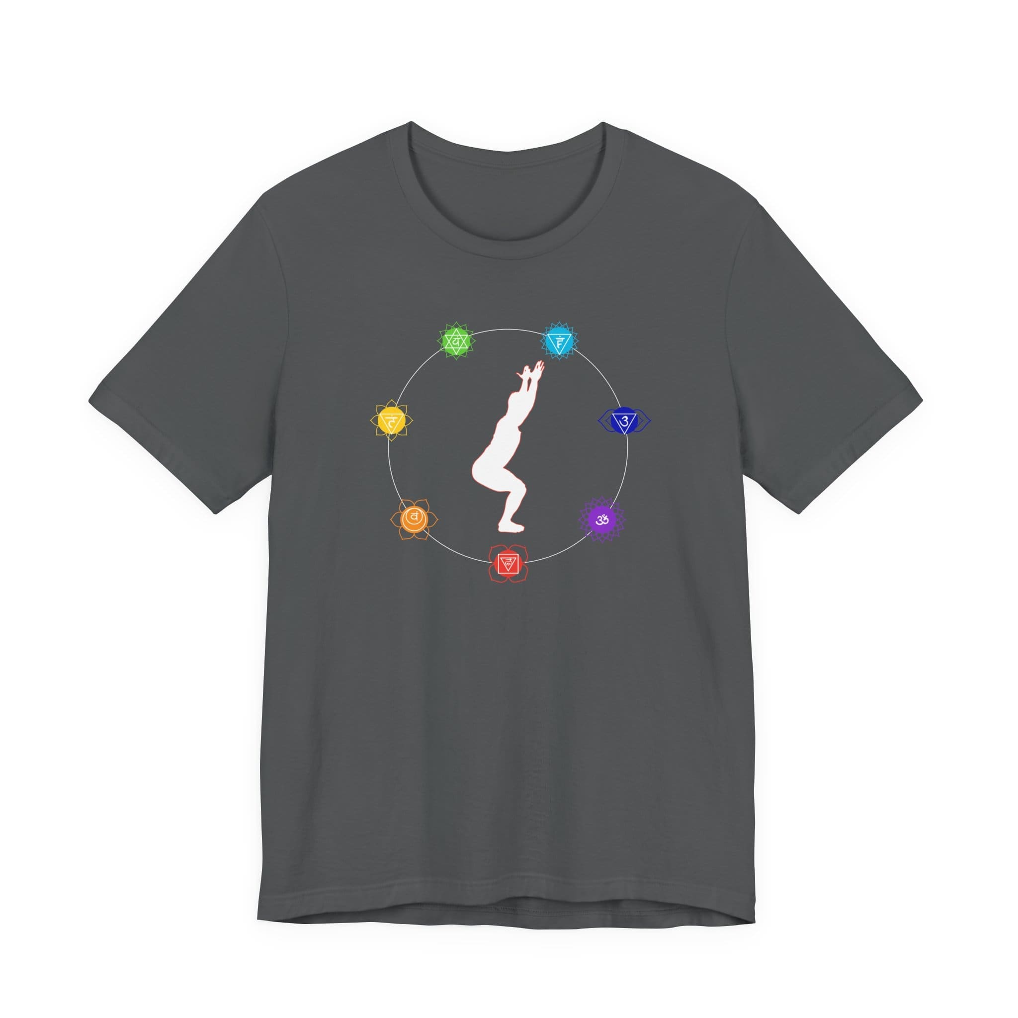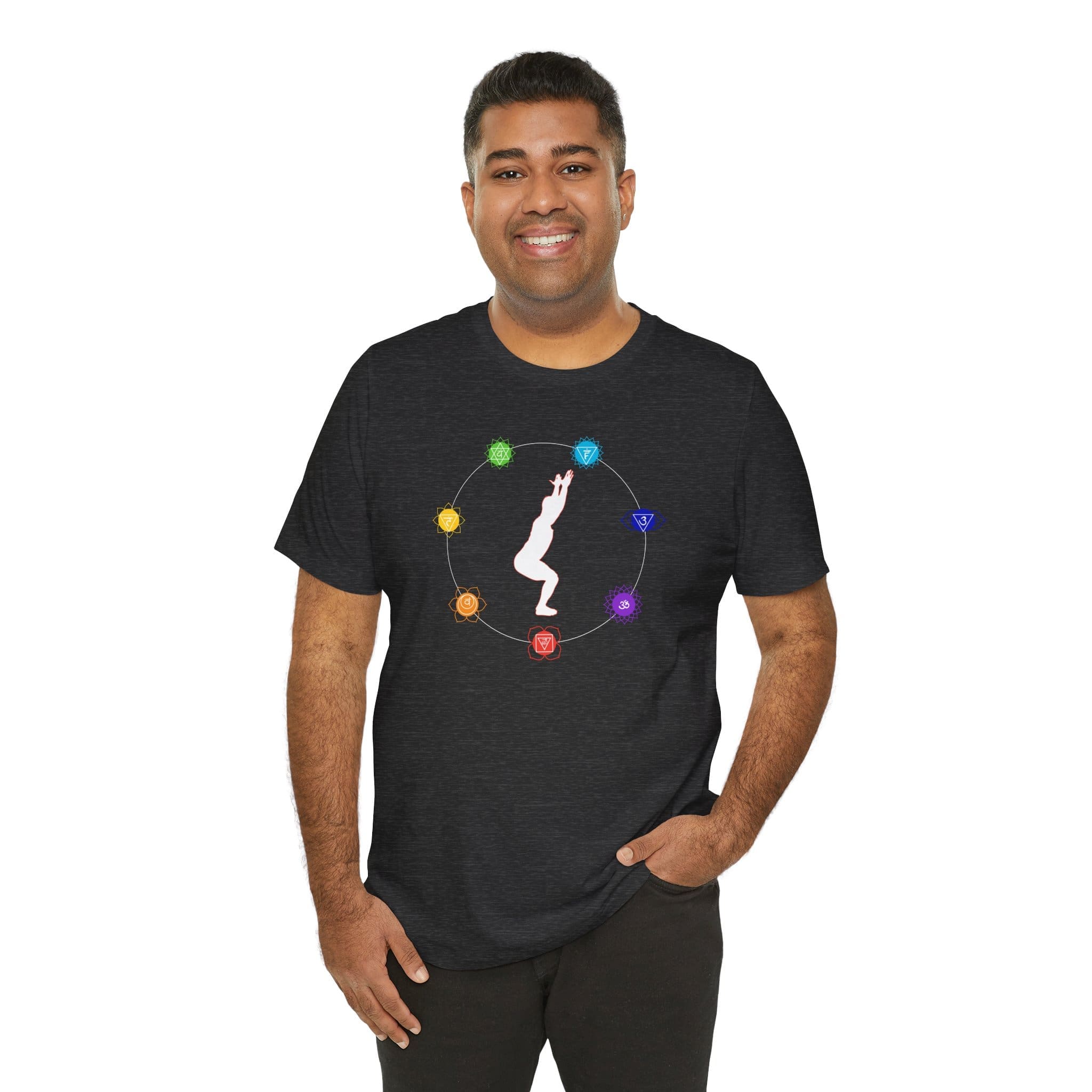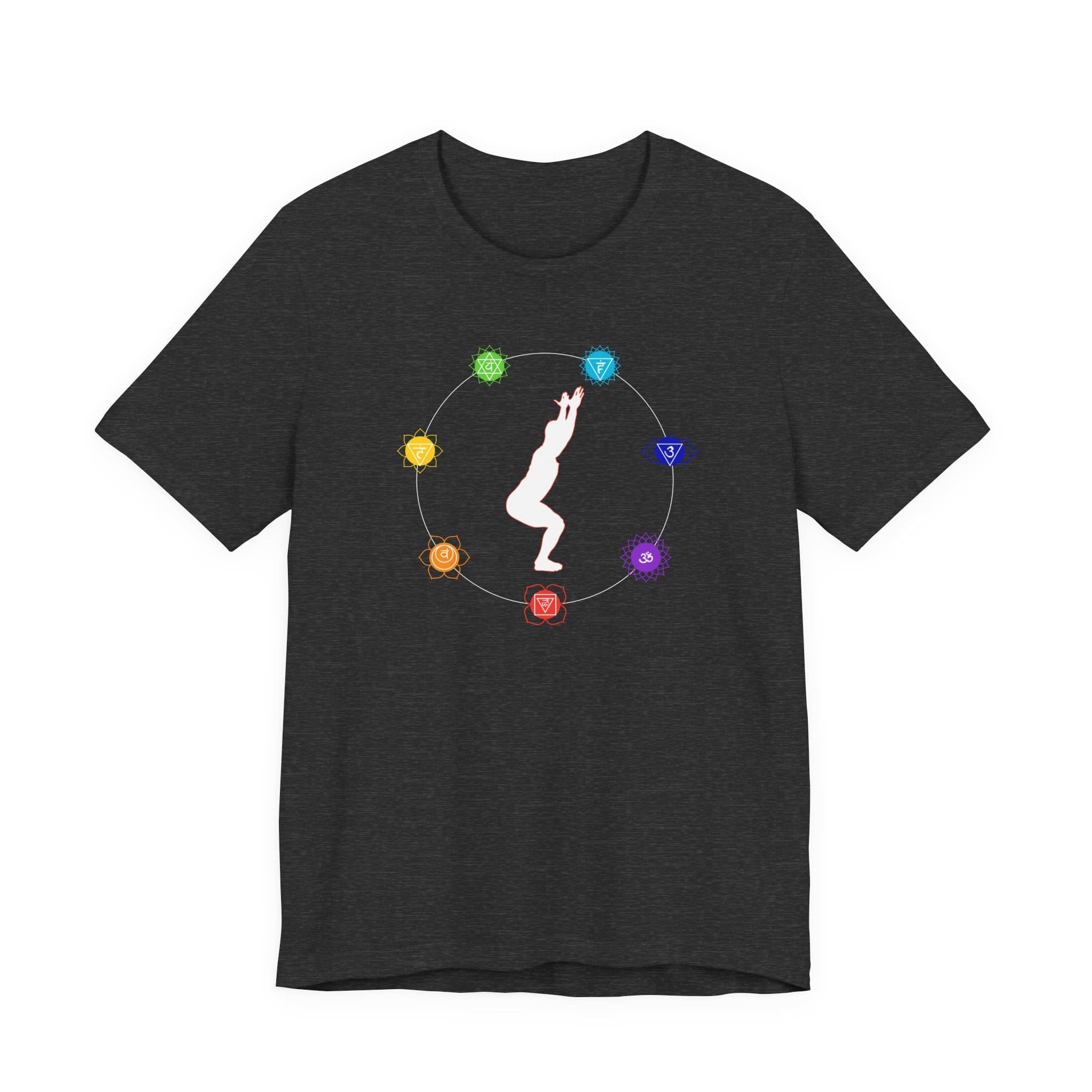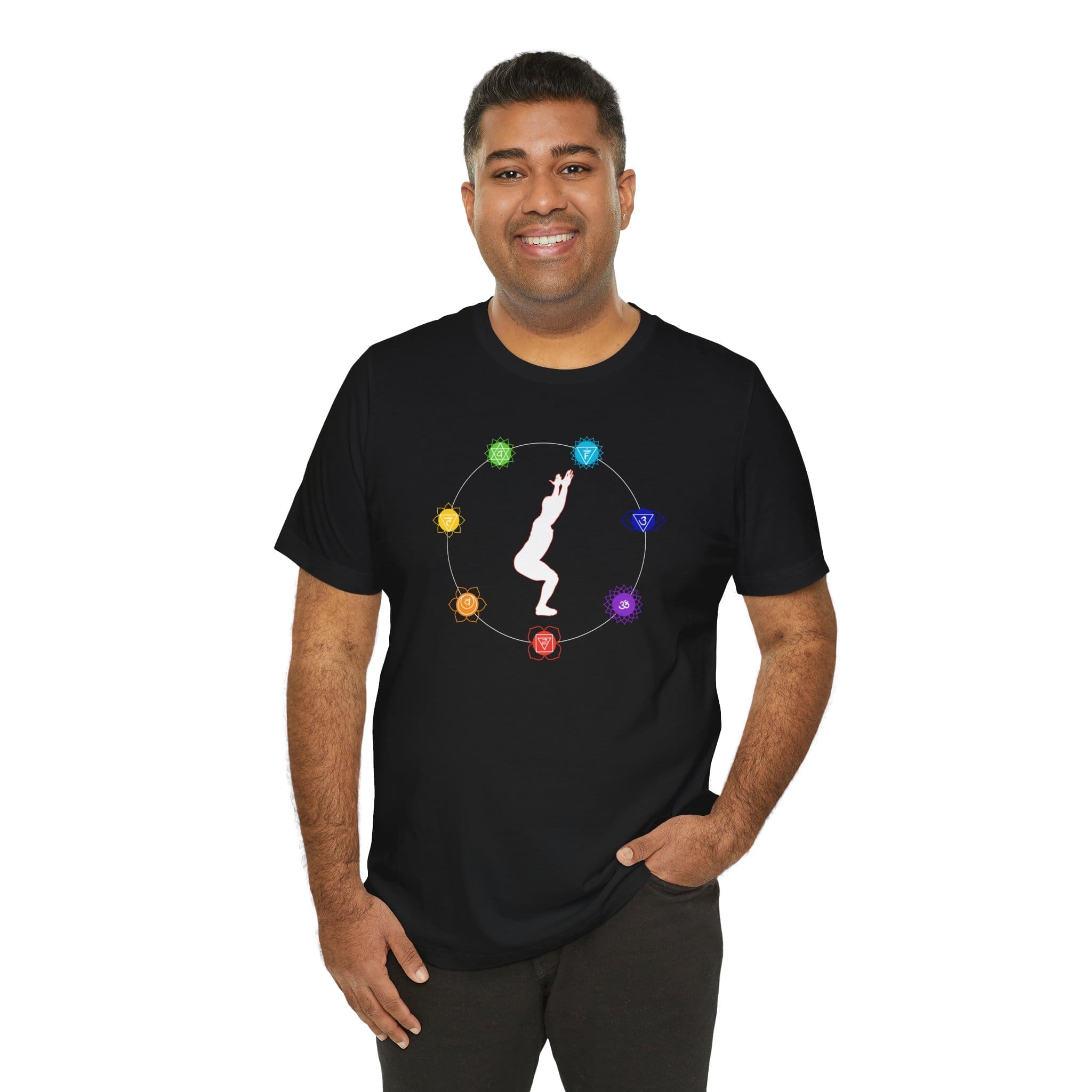 A lightweight, breathable cotton tee designed for movement and mindful style. The black jersey tee features a centered, vibrant chakra-inspired design: a white silhouette in a squat pose surrounded by seven luminous, color-coded energy points linked in a subtle circular flow. It reads calm and intentional — at once casual and quietly spiritual — making it easy to wear during yoga flows, studio classes, or relaxed weekends. The retail crew neckline and tear-away label keep focus on comfort. Sustainably made from Airlume combed and ring-spun cotton with reinforced side seams and shoulder tape for lasting shape, it layers cleanly under jackets or stands alone as a statement for anyone who values mindful movement and low-key, meaningful design.