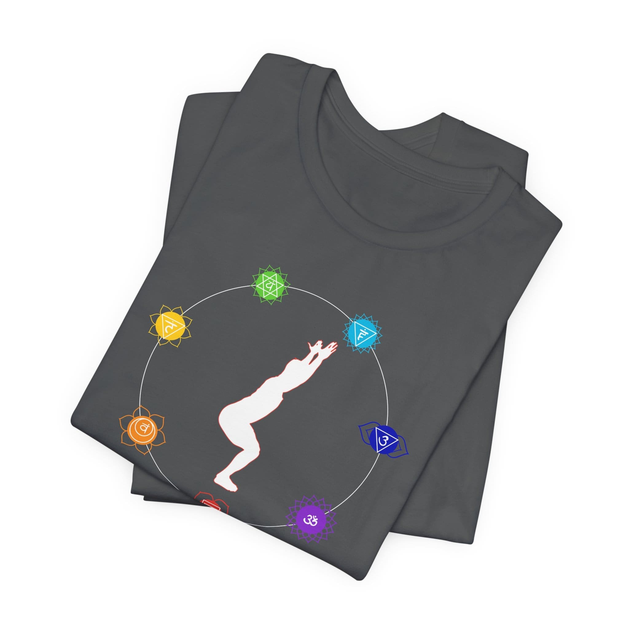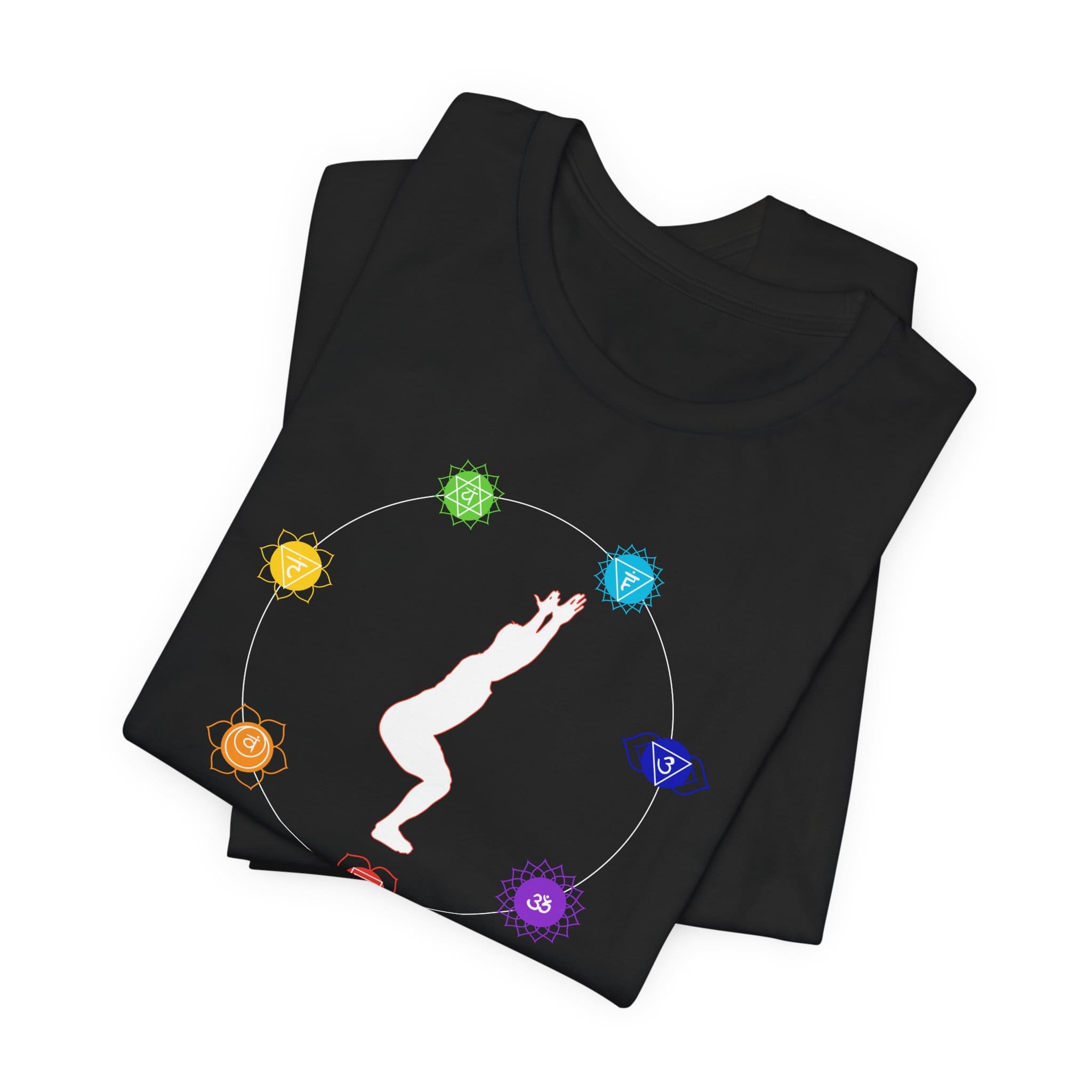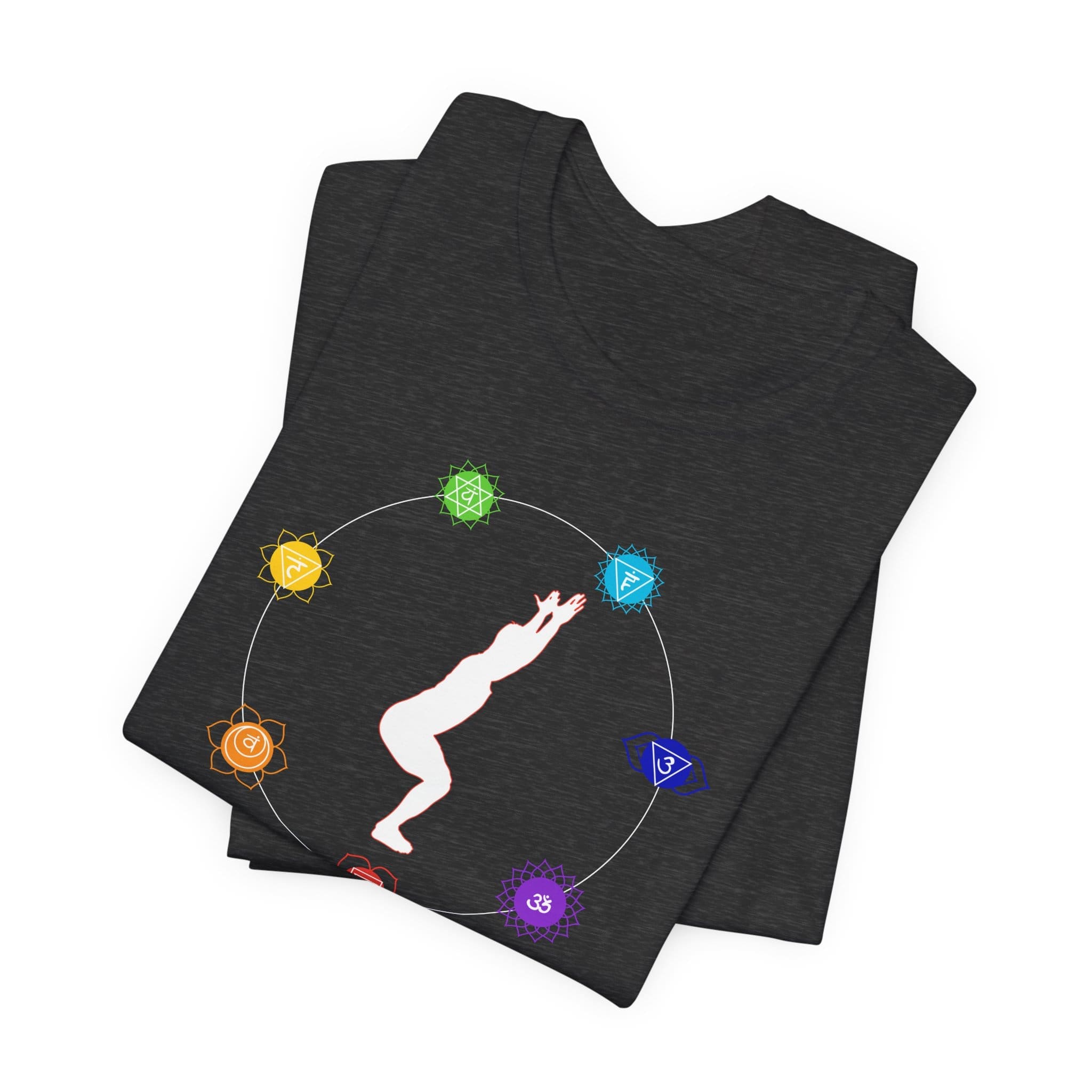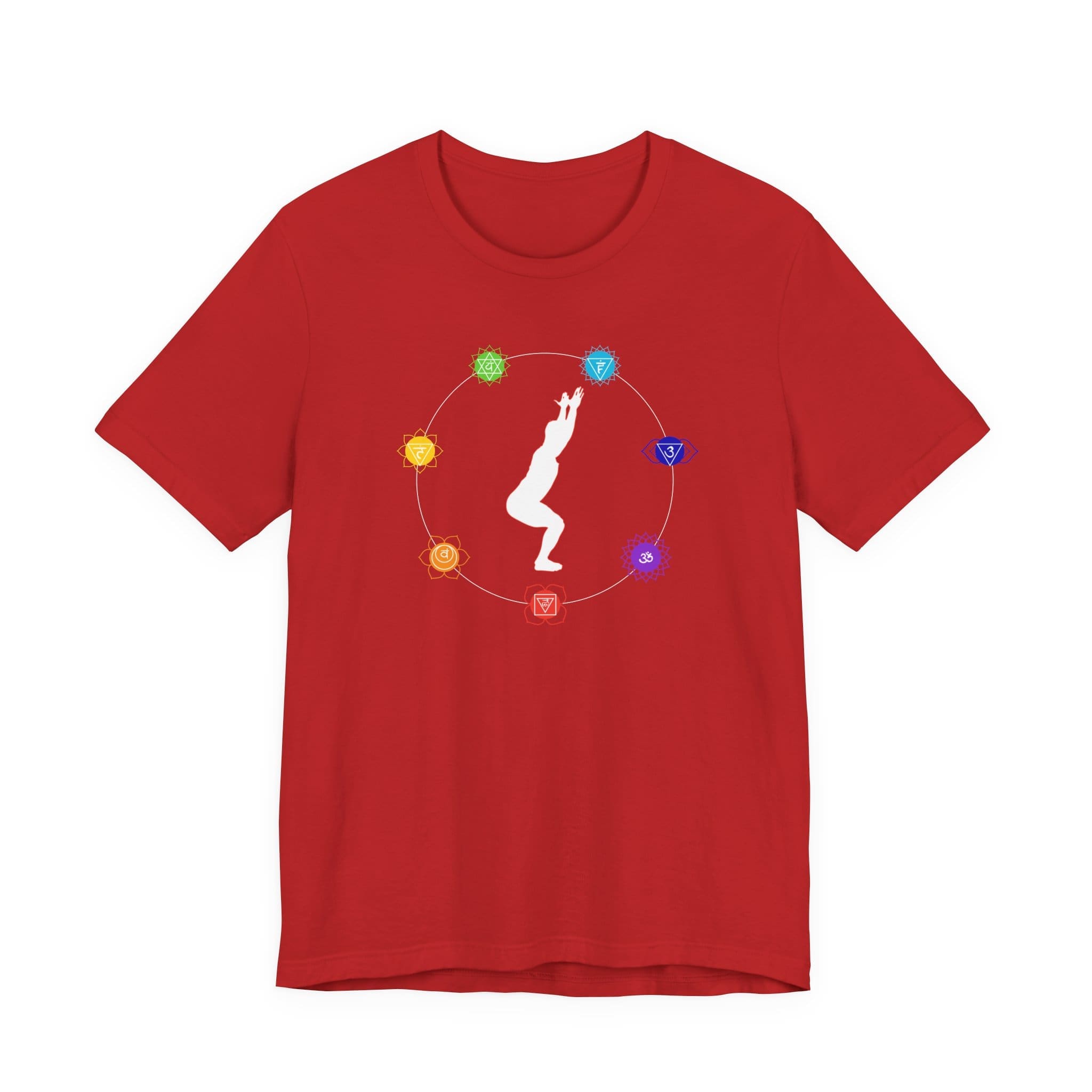 A lightweight, breathable cotton tee designed for movement and mindful style. The black jersey tee features a centered, vibrant chakra-inspired design: a white silhouette in a squat pose surrounded by seven luminous, color-coded energy points linked in a subtle circular flow. It reads calm and intentional — at once casual and quietly spiritual — making it easy to wear during yoga flows, studio classes, or relaxed weekends. The retail crew neckline and tear-away label keep focus on comfort. Sustainably made from Airlume combed and ring-spun cotton with reinforced side seams and shoulder tape for lasting shape, it layers cleanly under jackets or stands alone as a statement for anyone who values mindful movement and low-key, meaningful design.