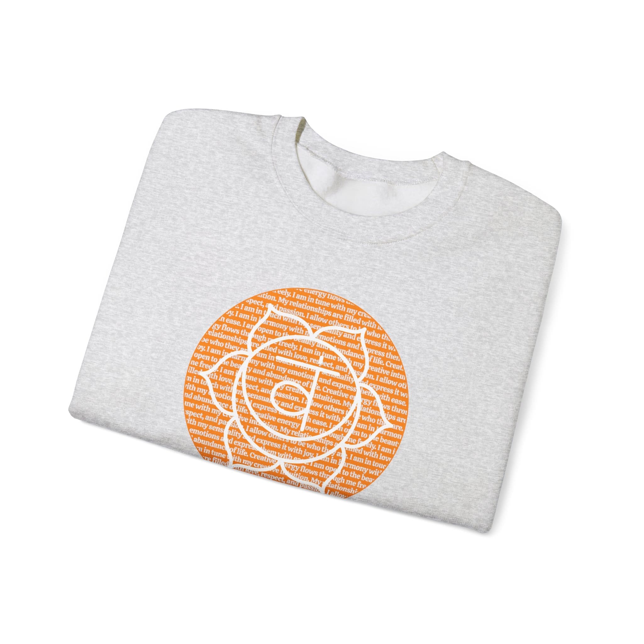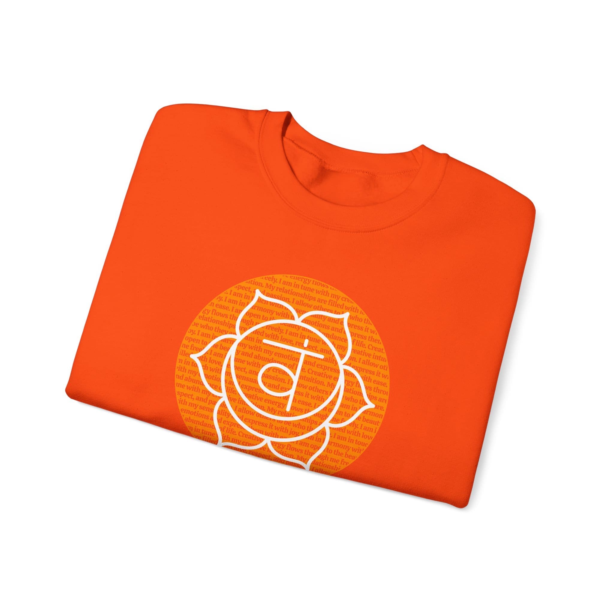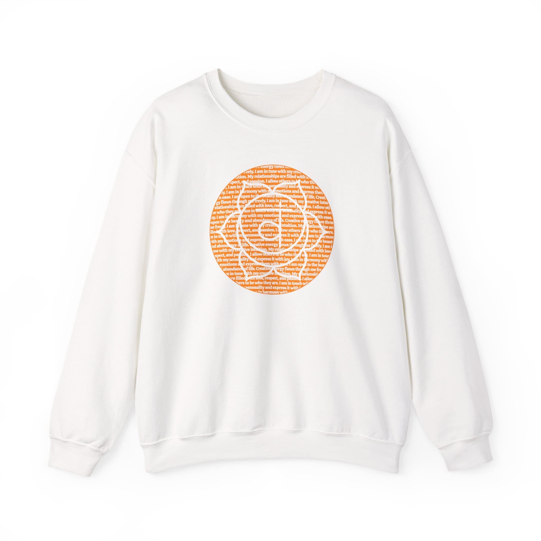 The design on this sweatshirt is multi-layered, with the chakra symbol in the forefront and sacral chakra affirmations typed out in the background. The affirmation text (repeated) is: ‘Creative energy flows through me freely. I am in tune with my creative intuition. My relationships are filled with love, respect, and passion. I allow others to be who they are. I am in touch with my sensuality and express it with joy. I am in harmony with my emotions and express them with ease. I am open to the beauty and abundance of life.’