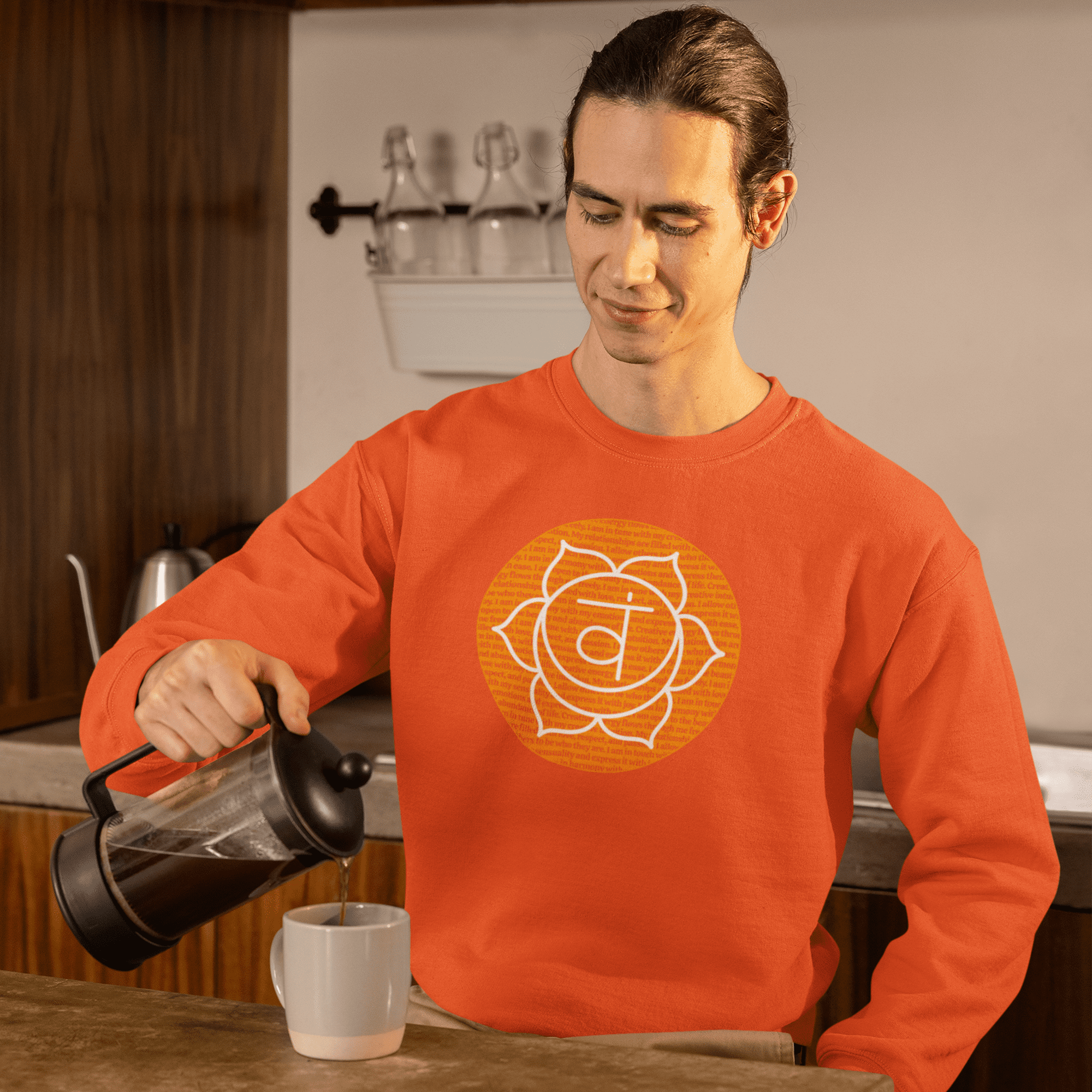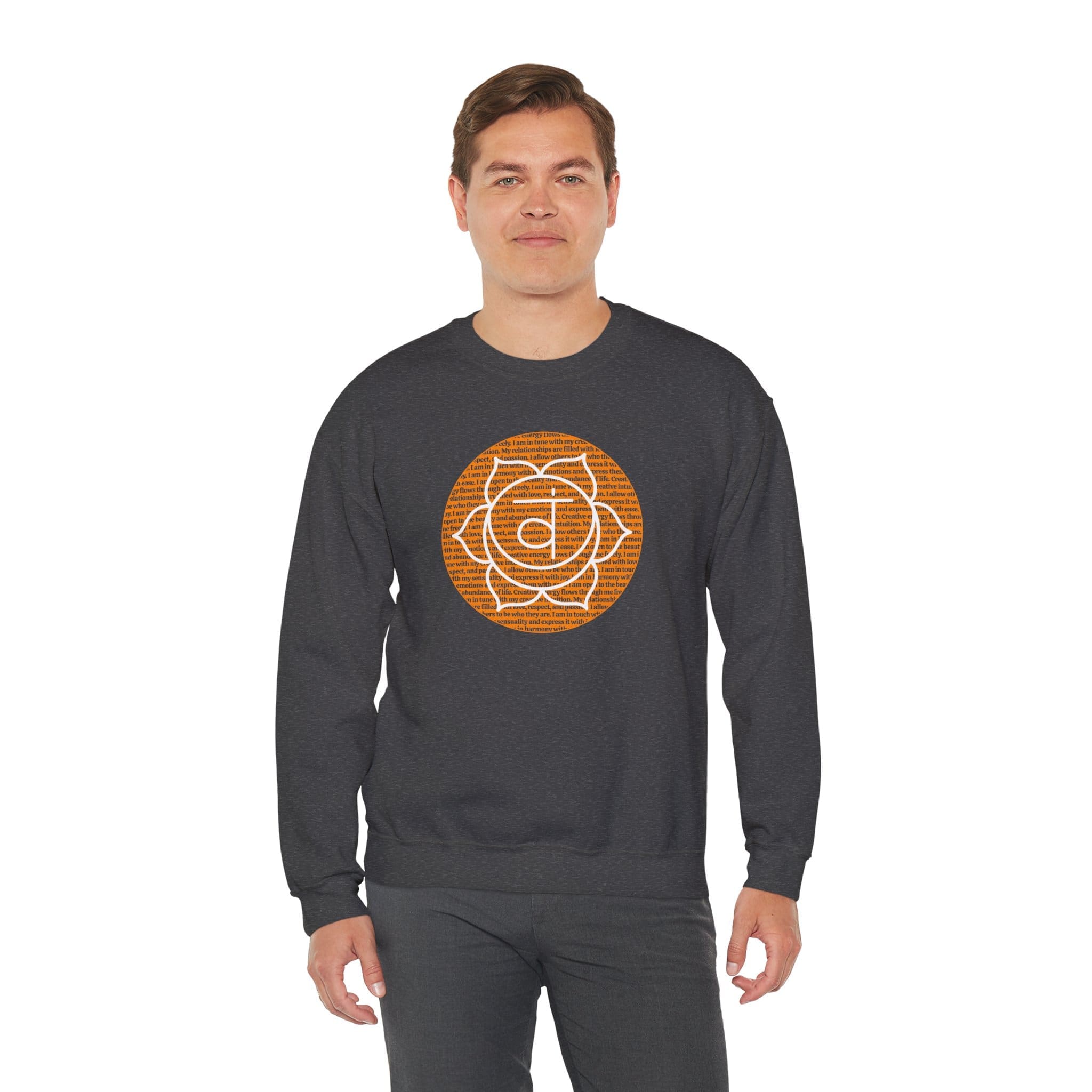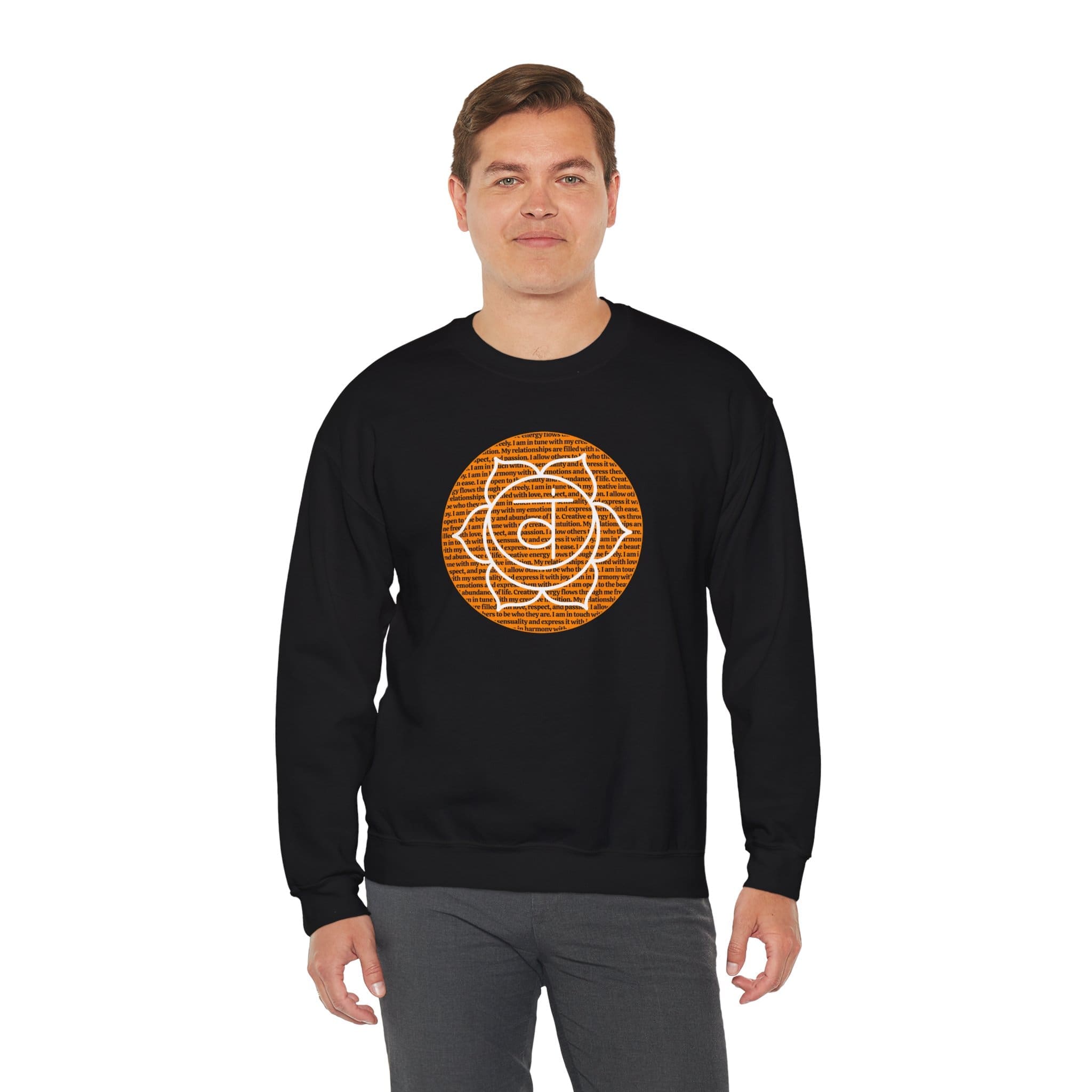 The design on this sweatshirt is multi-layered, with the chakra symbol in the forefront and sacral chakra affirmations typed out in the background. The affirmation text (repeated) is: ‘Creative energy flows through me freely. I am in tune with my creative intuition. My relationships are filled with love, respect, and passion. I allow others to be who they are. I am in touch with my sensuality and express it with joy. I am in harmony with my emotions and express them with ease. I am open to the beauty and abundance of life.’