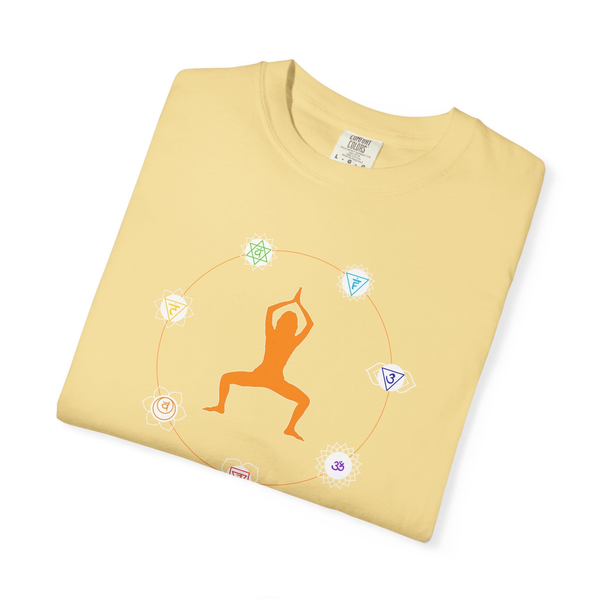 This soft, garment-dyed tee holds a quiet, grounding energy. It features a female silhouette in the goddess yoga pose at the center, surrounded by seven delicate chakra symbols. Wear it to breathe through morning stretches, walk into a sunset yoga class, or sit cross-legged with a steaming mug and slow music. The relaxed fit and washed color feel familiar from the first wear; the orange figure and light chakra symbol accents sit calm and centered. It’s clothing that moves with your practice—comfortable, unpretentious, and subtly expressive.