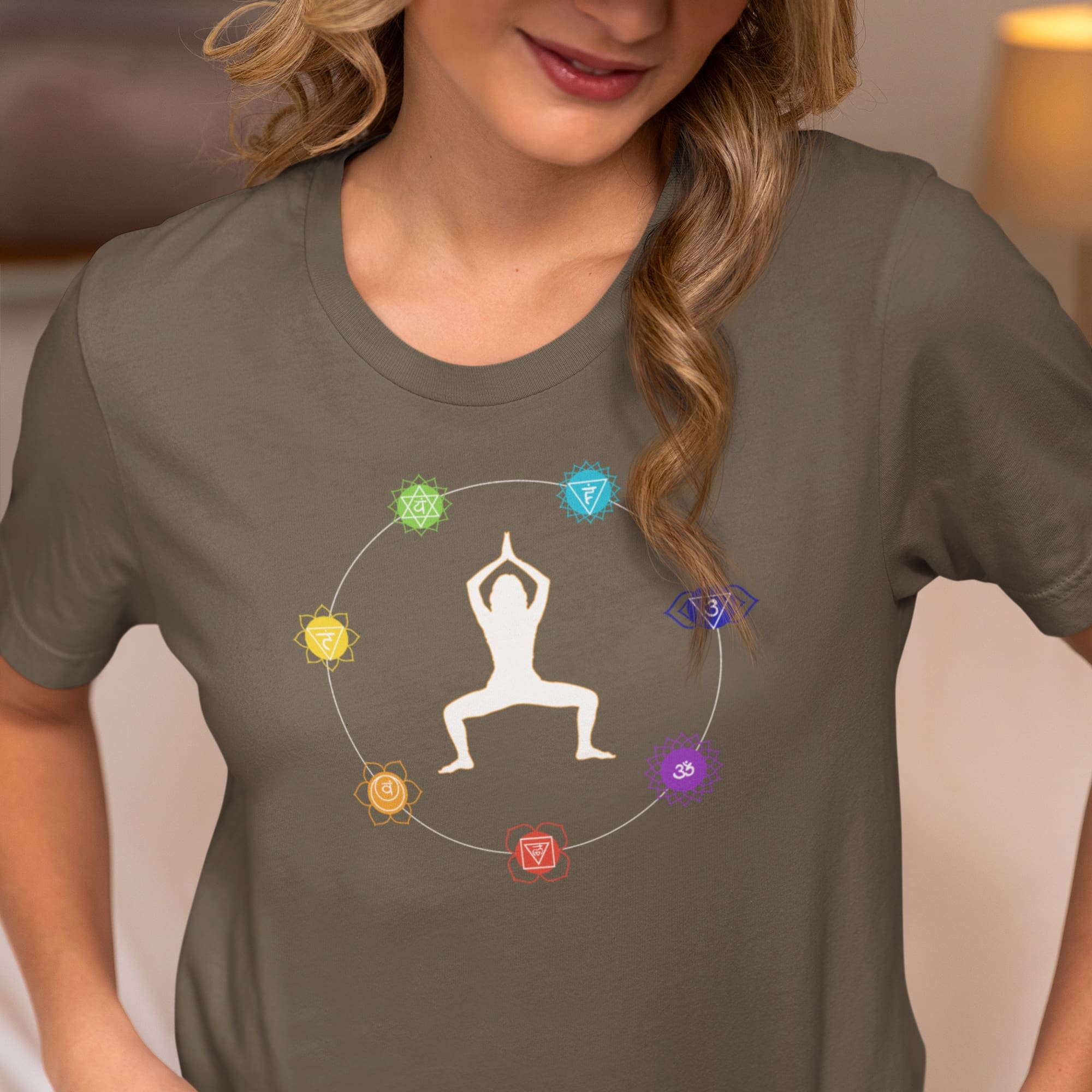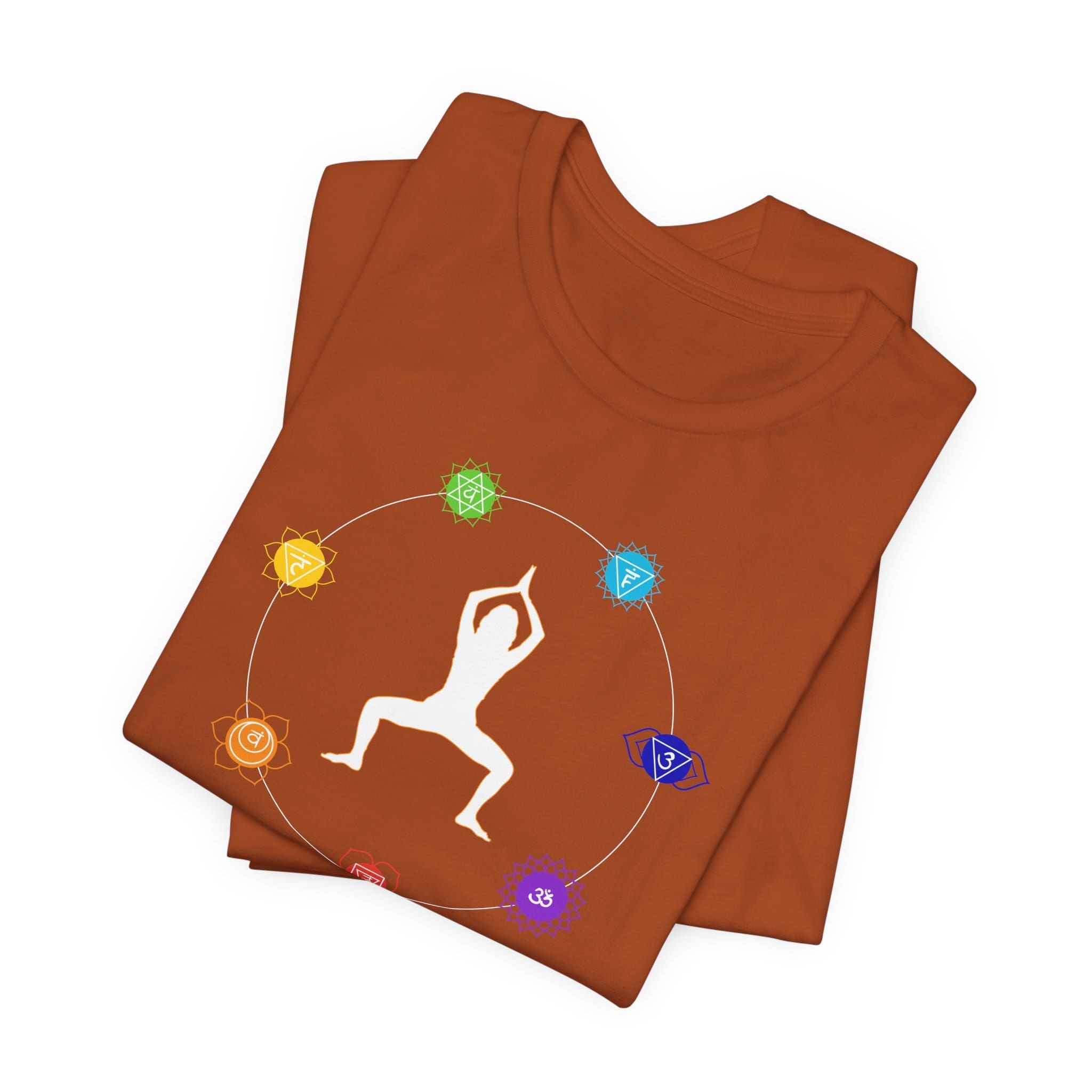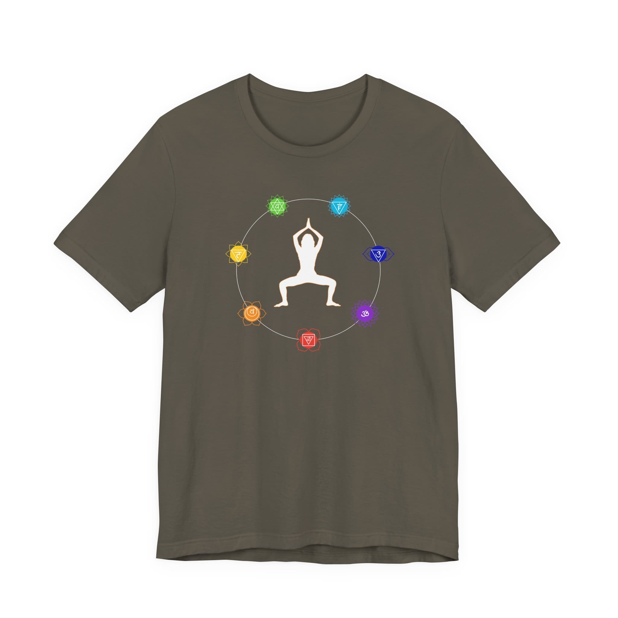 Soft, breathable tee designed for movement and mindful moments. A centered silhouette in a grounding yoga pose is surrounded by a ring of seven colorful chakra symbols — a calm visual reminder to breathe, balance, and move through your day. Lightweight Airlume cotton keeps the shirt airy during flows or casual wear, while the retail crew neckline and neat side seams preserve a tidy silhouette whether layered or worn alone. Subtle, durable printing on the sleeve and neck (DTF/DTG depending on provider) holds vibrant color through washes. Ethically produced with a tear-away label for comfort, this tee fits into conscious wardrobes that value both comfort and intention.