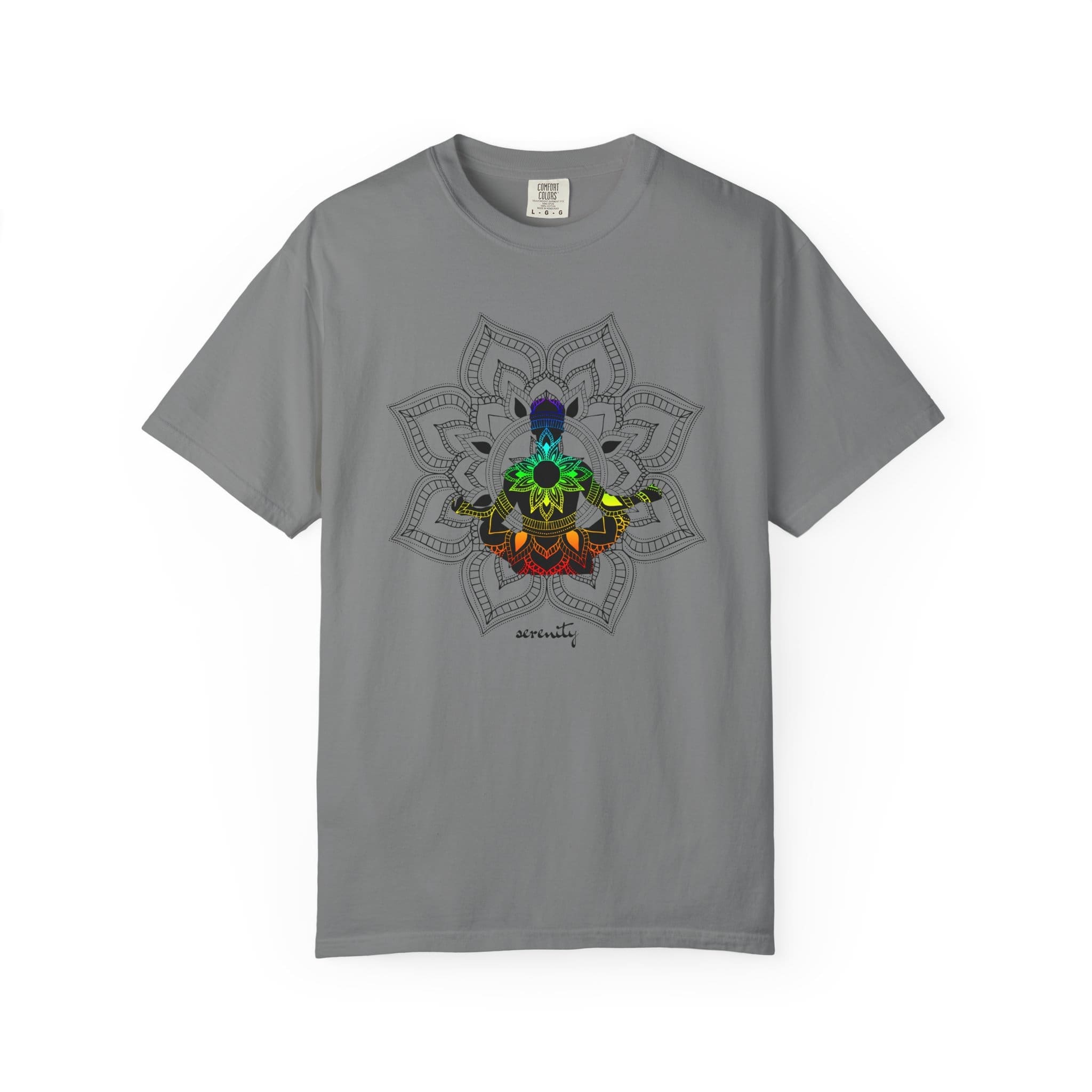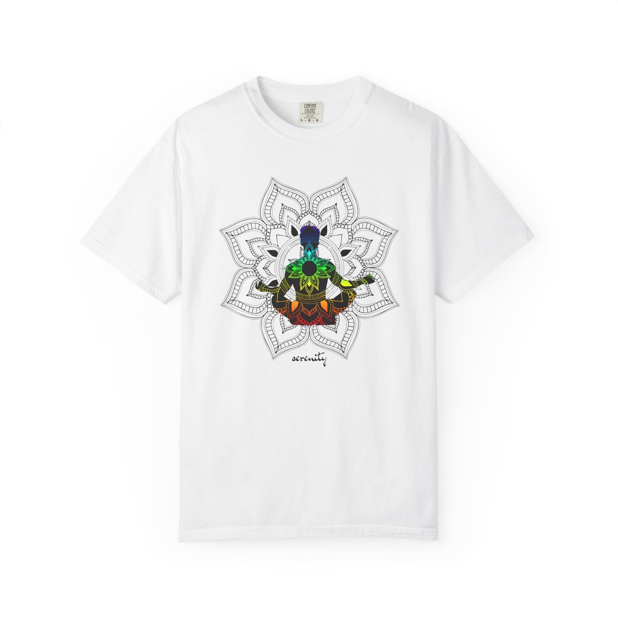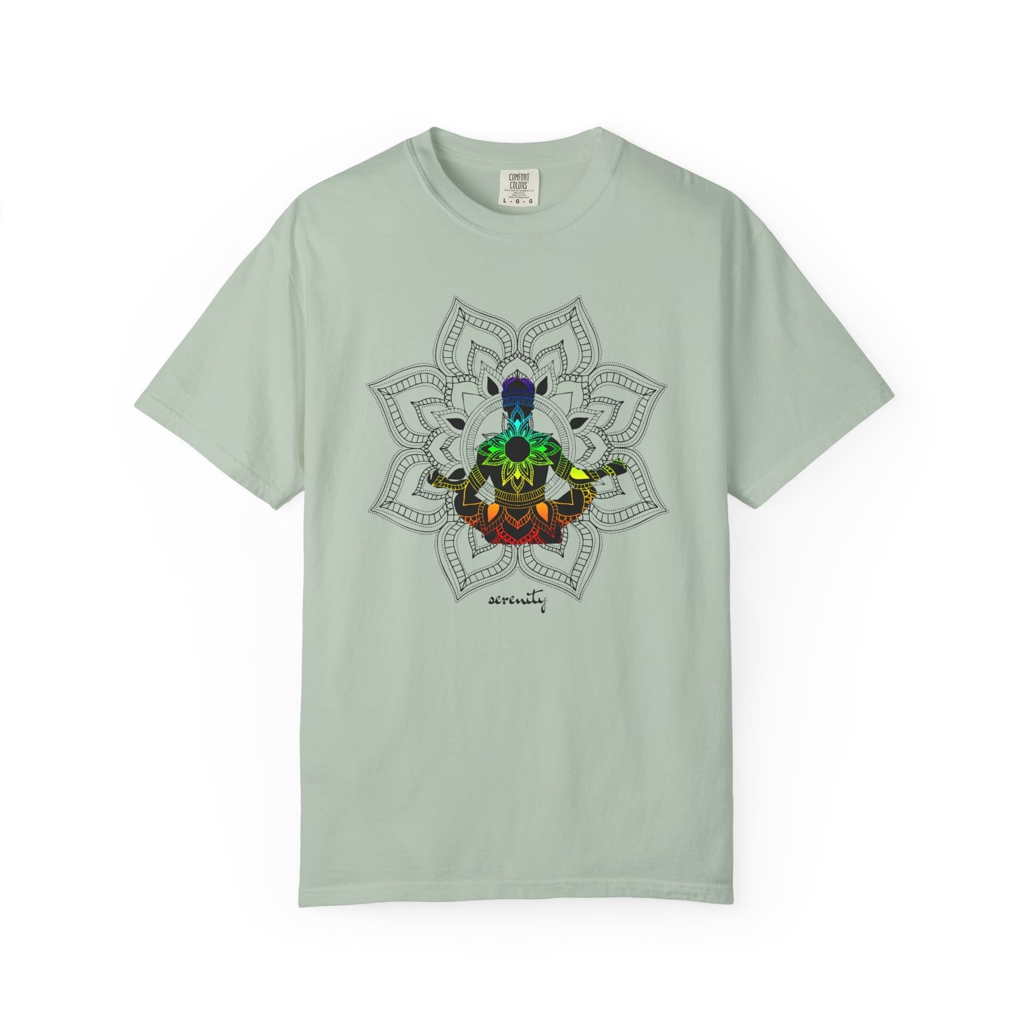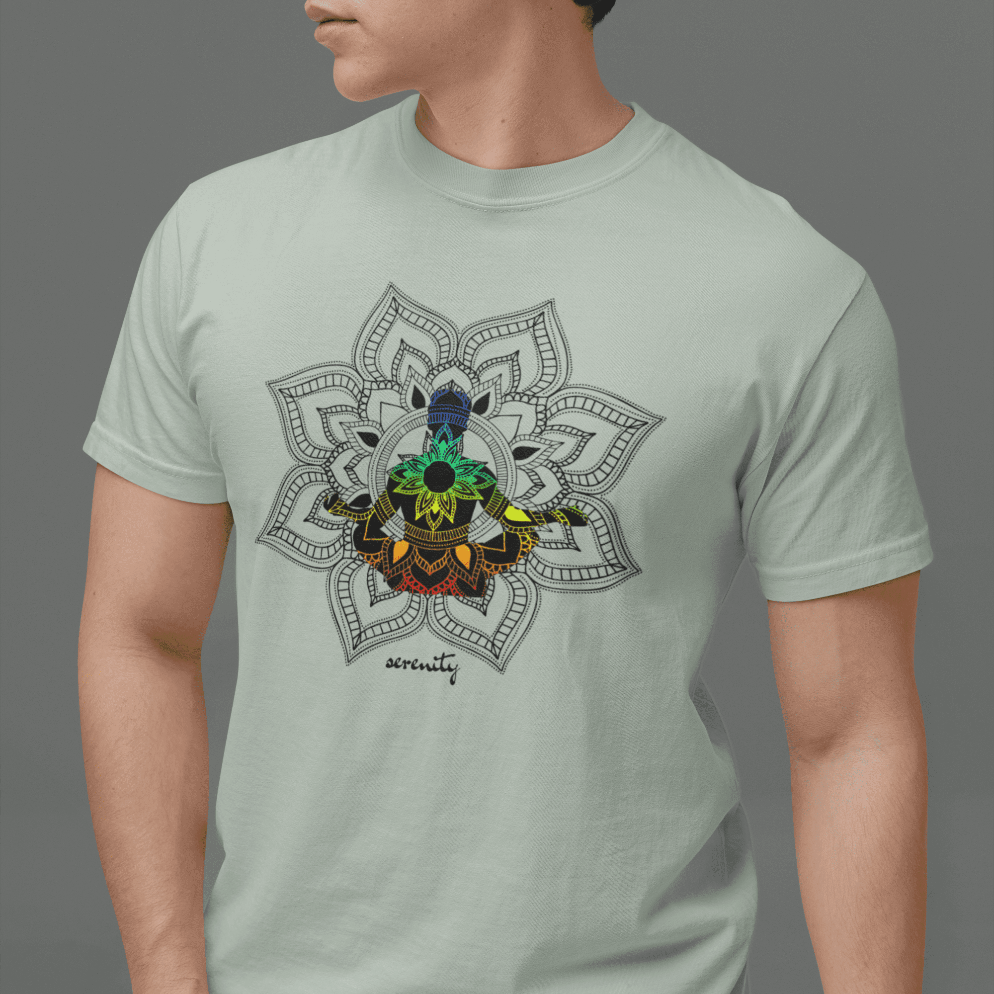 Serenity – Chakra Mandala T-Shirt with Male Silhouette – This is an excellent choice for yourself or as a gift for anyone looking to promote physical, emotional, and spiritual well-being, or just because! (I also have a similar shirt with a female silhouette.)