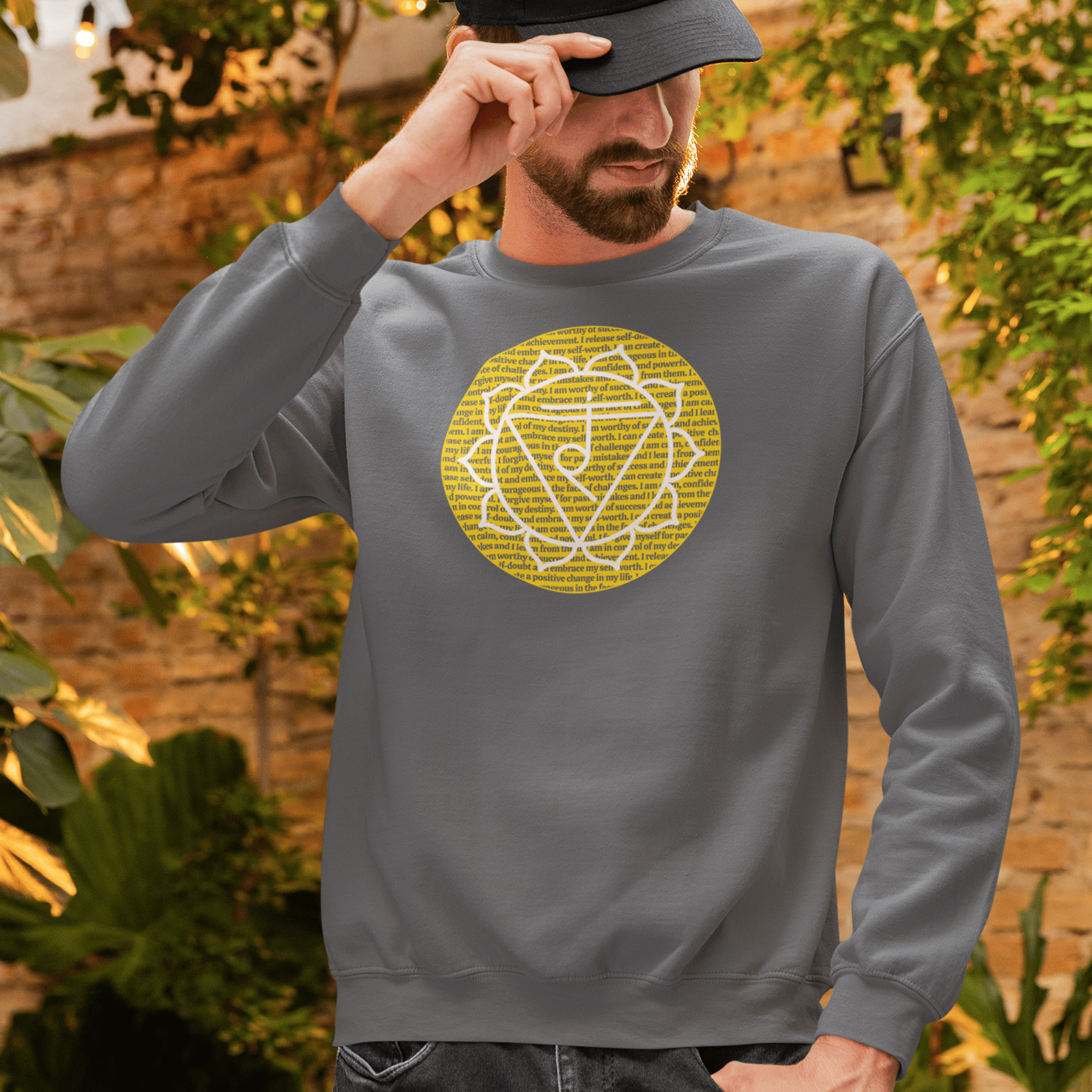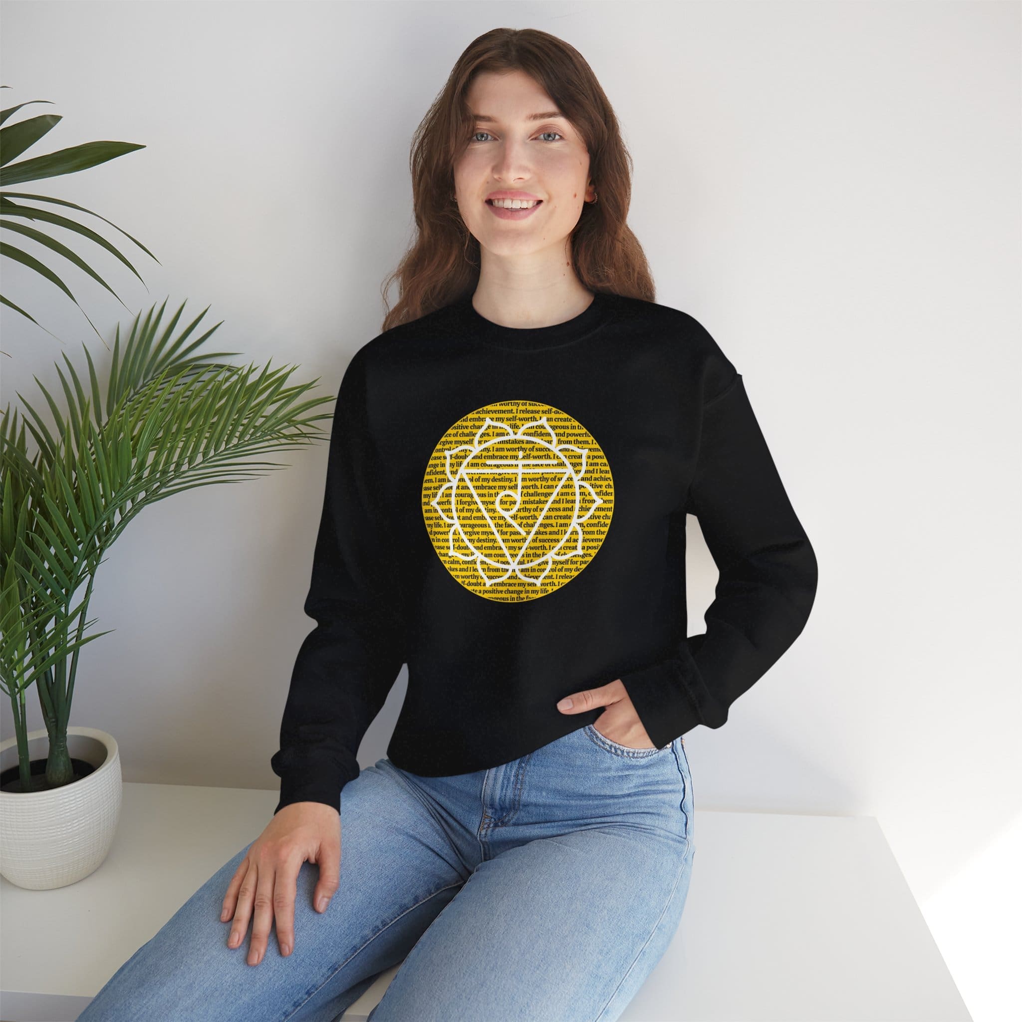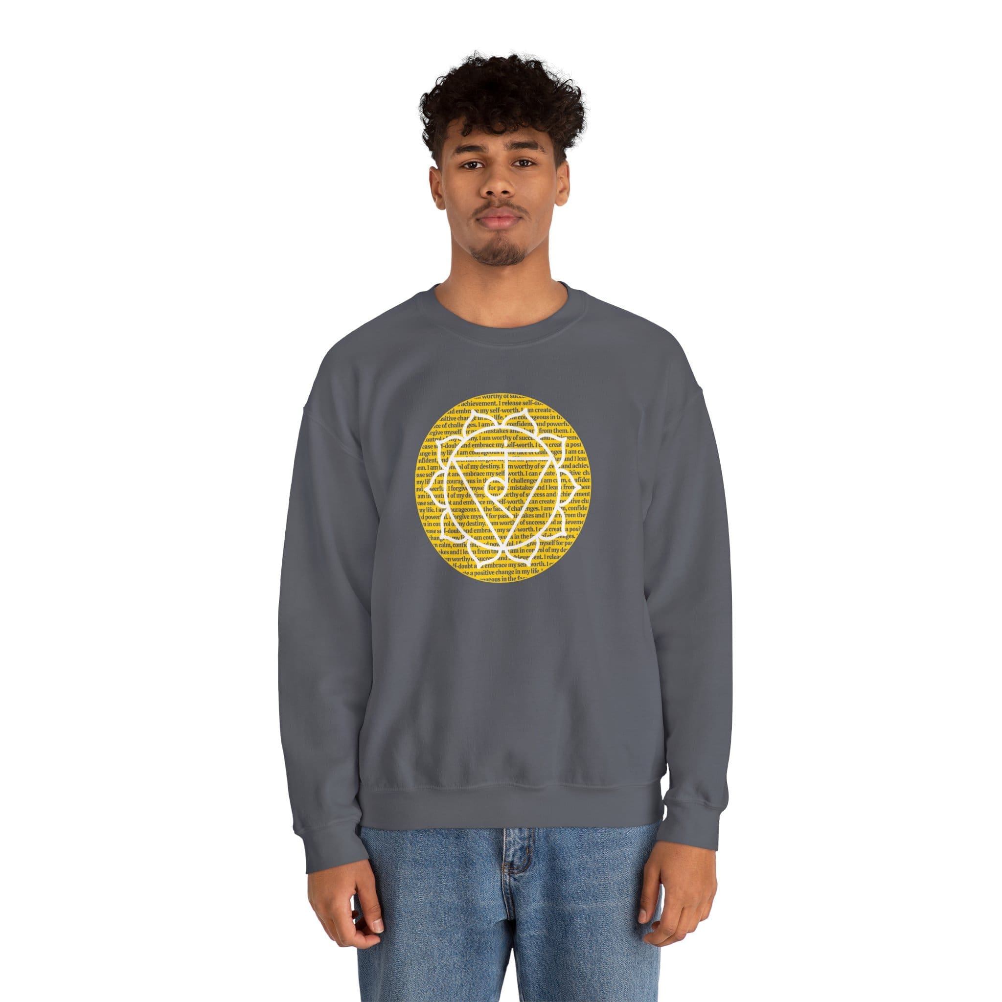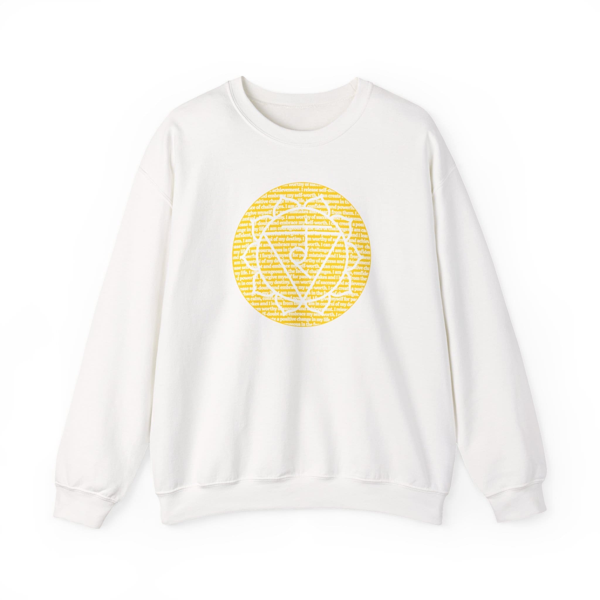 Solar Plexus Chakra Affirmations Sweatshirt – the background text on this crewneck is transparent, allowing the shirt color to show through as the text color.