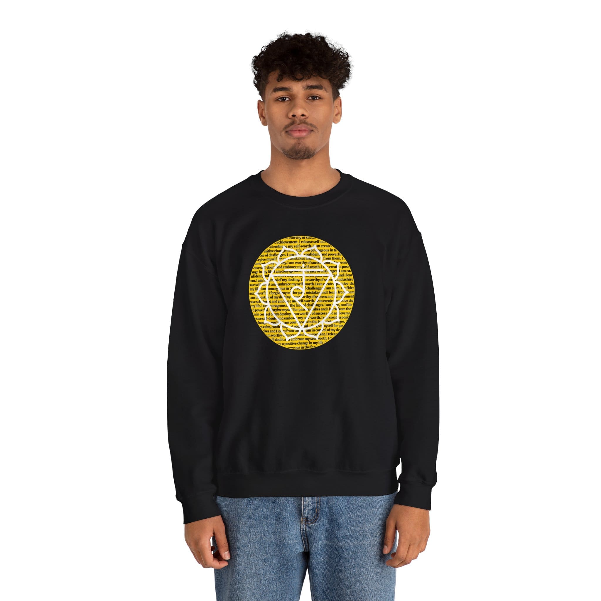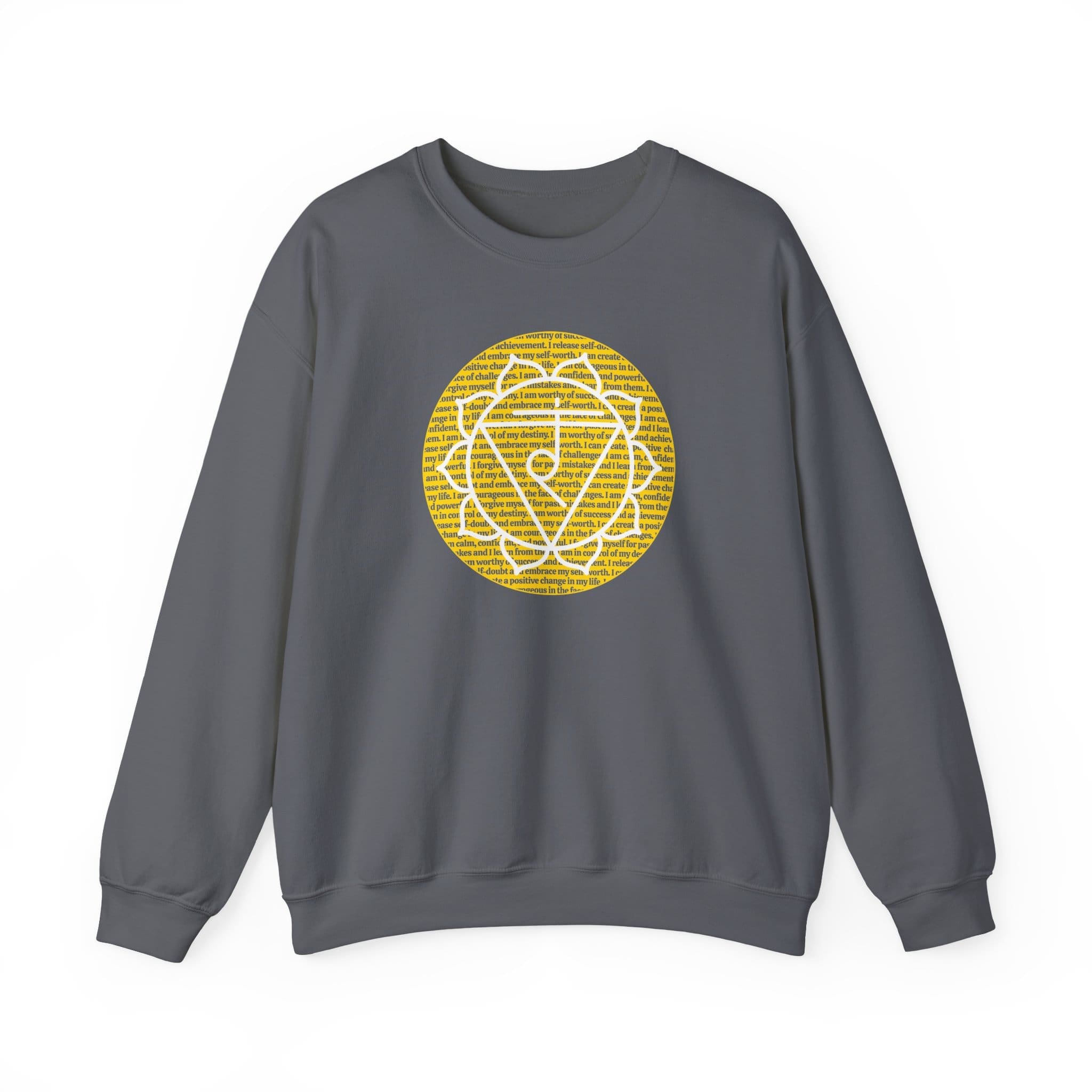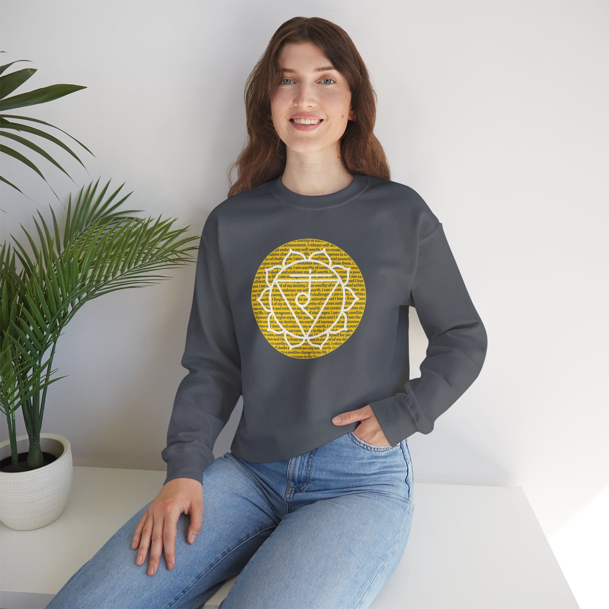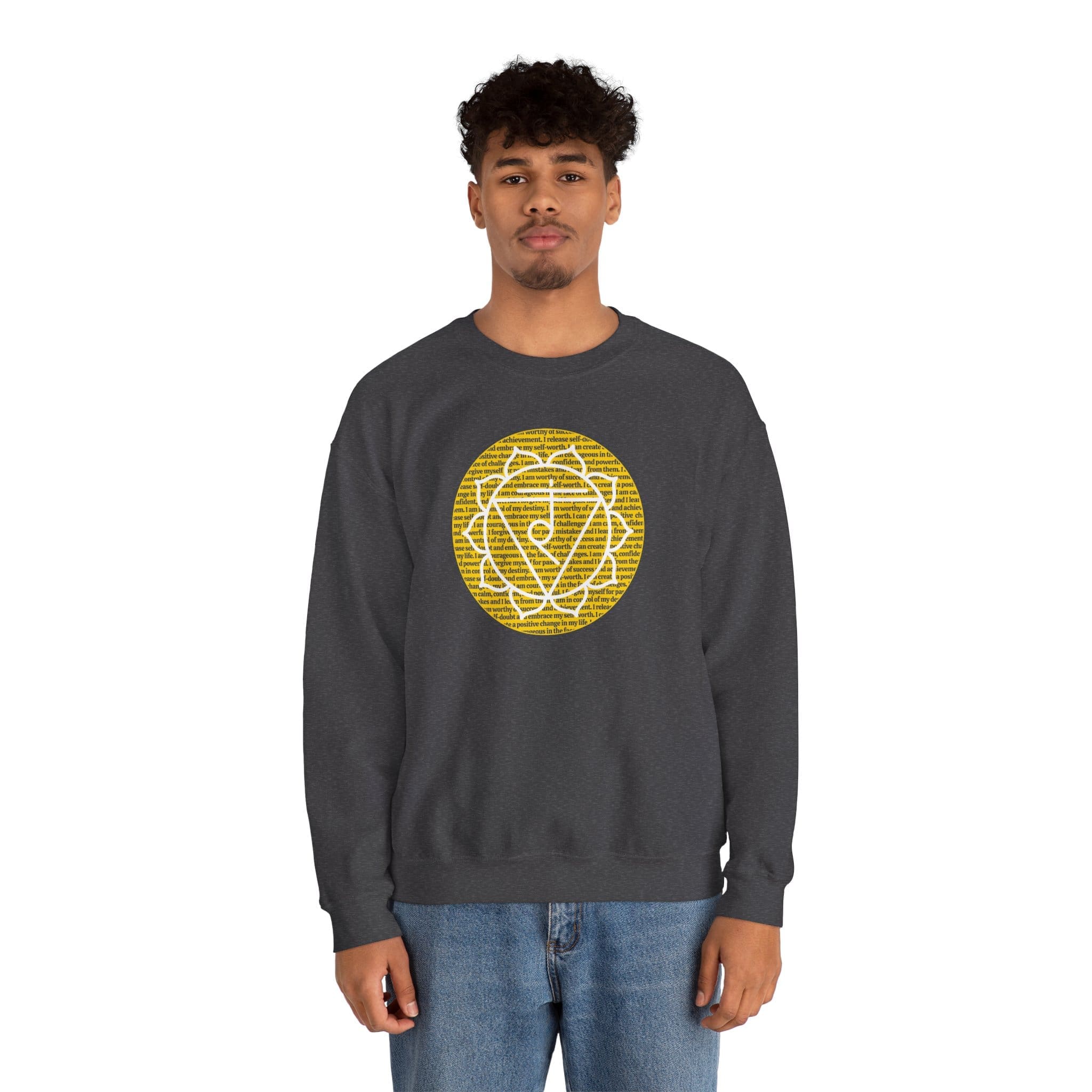 Solar Plexus Chakra Affirmations Sweatshirt – the background text on this crewneck is transparent, allowing the shirt color to show through as the text color.