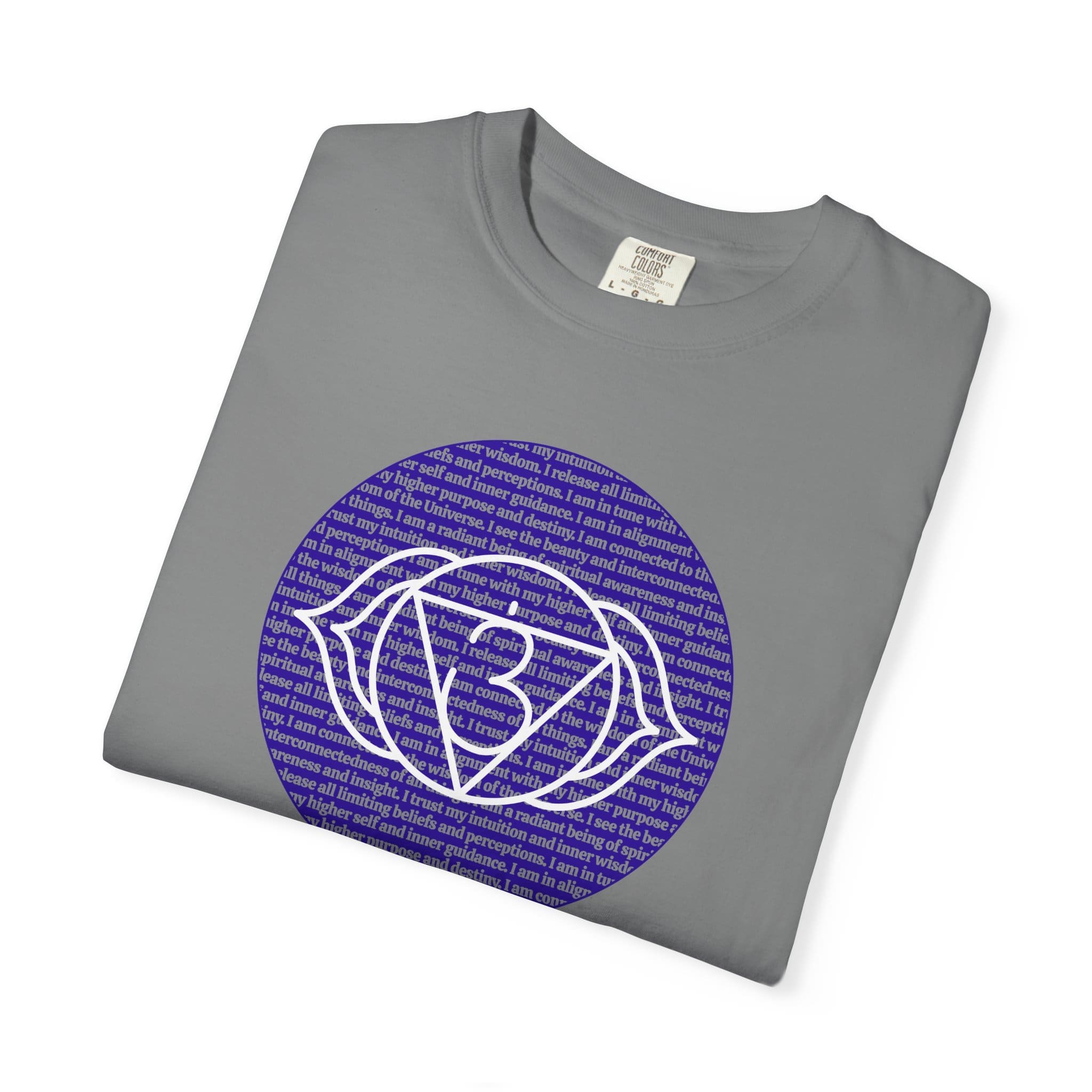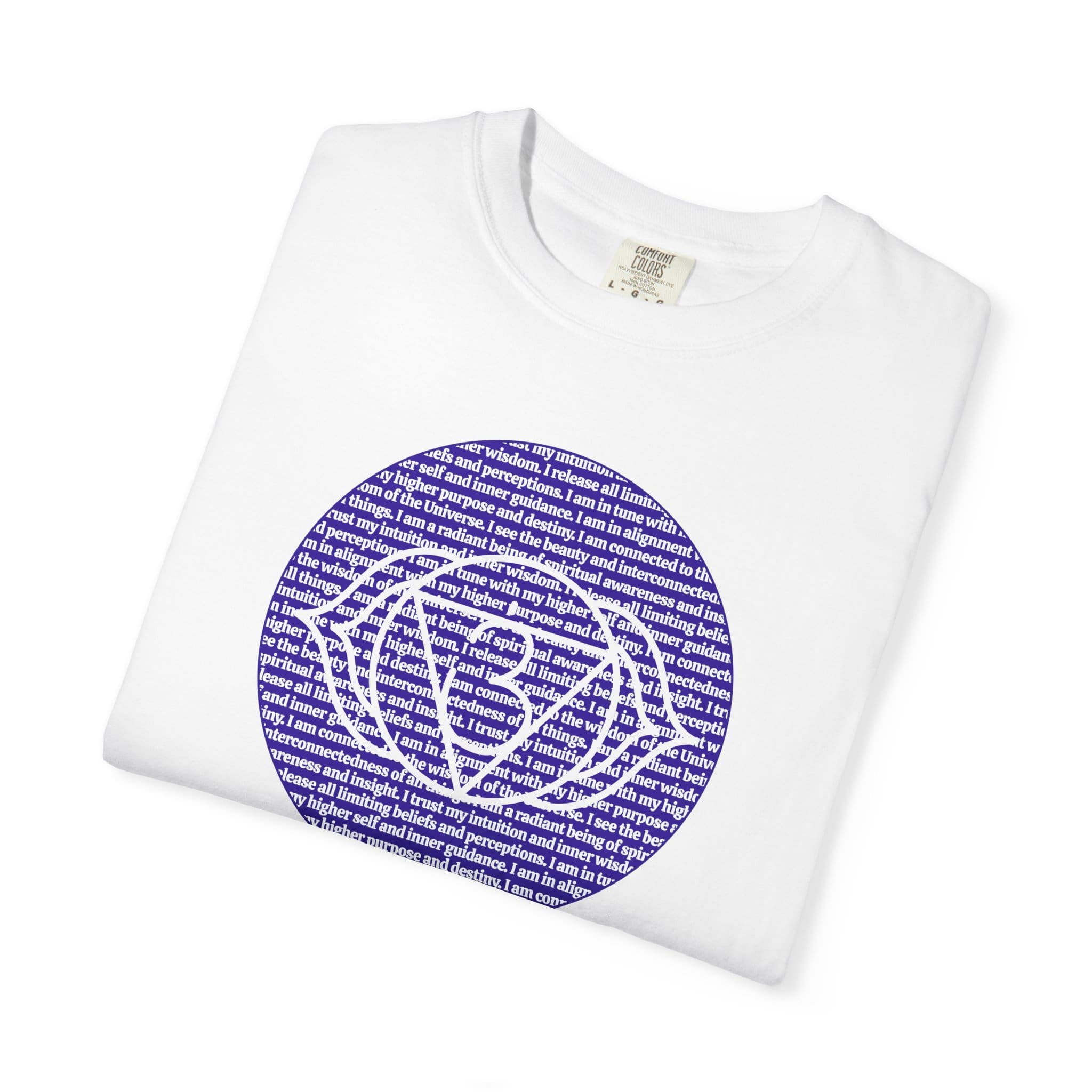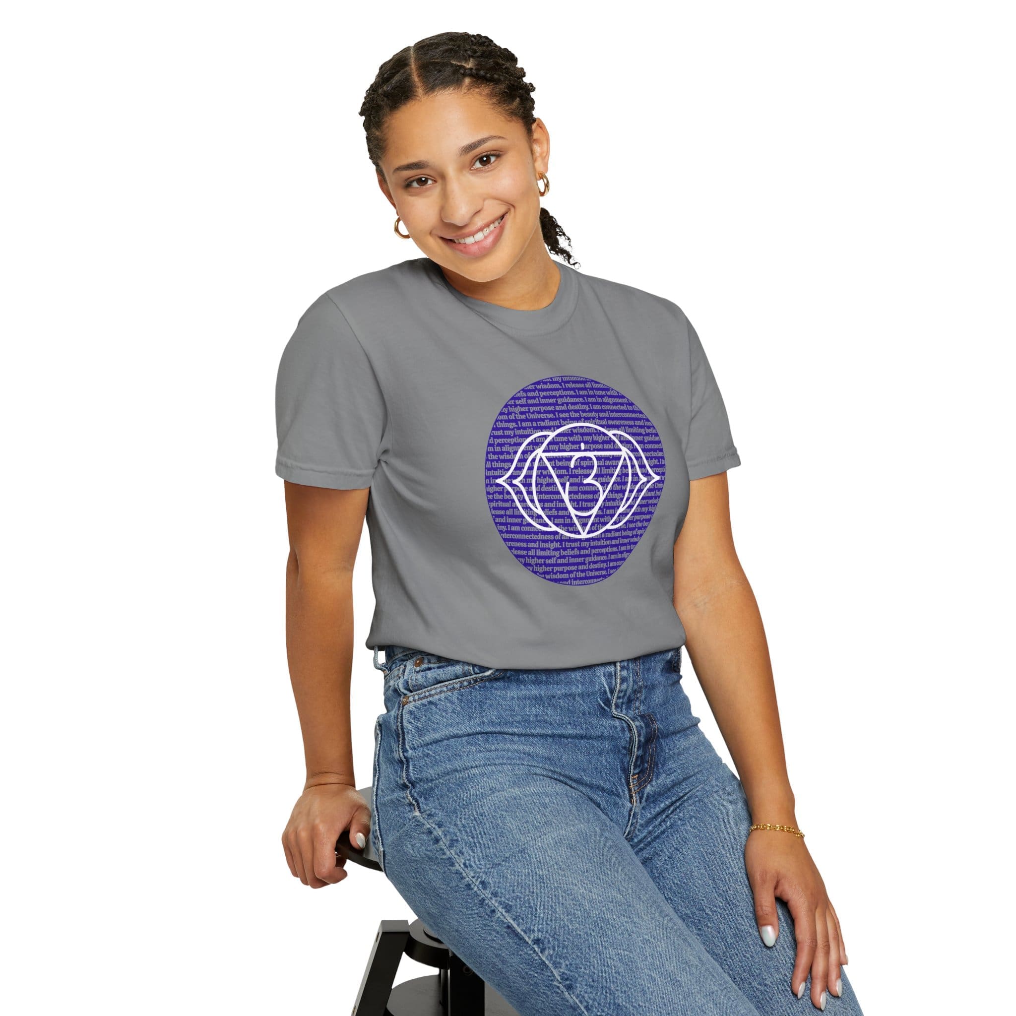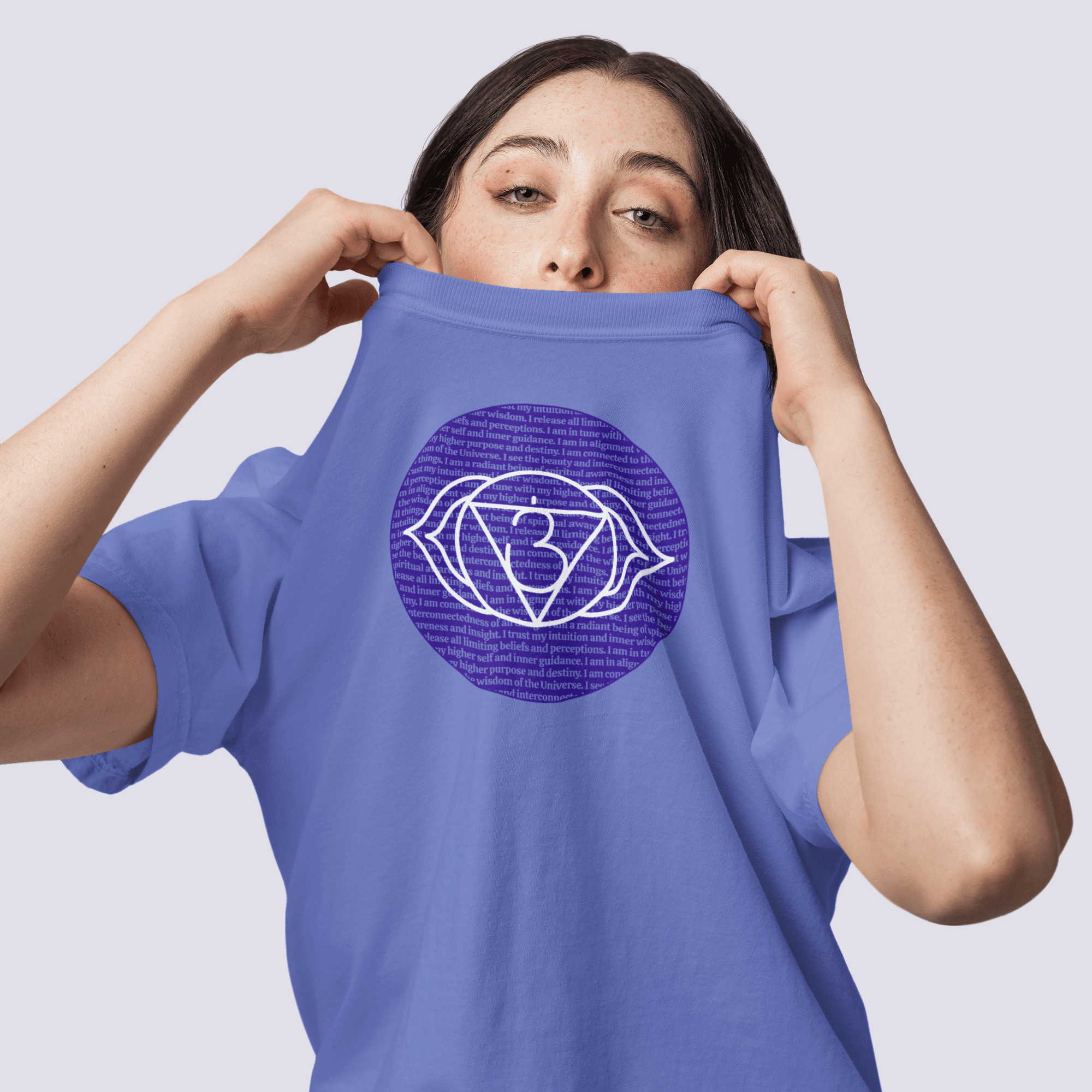Third Eye Chakra Affirmations Heavyweight T-Shirt – the background text on this shirt is transparent, allowing the shirt color to show through as the text color. The design on this tee is multi-layered, with the chakra symbol in the forefront and third eye chakra affirmations typed out in the background.