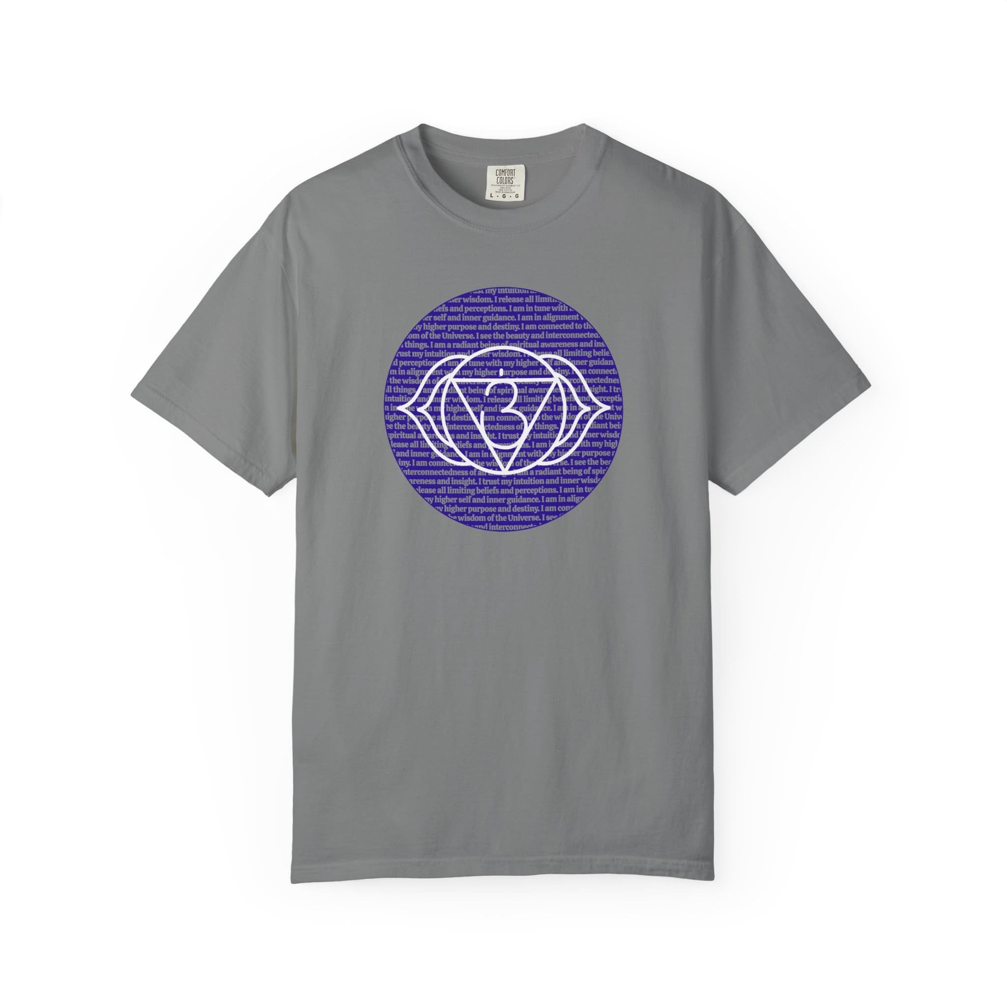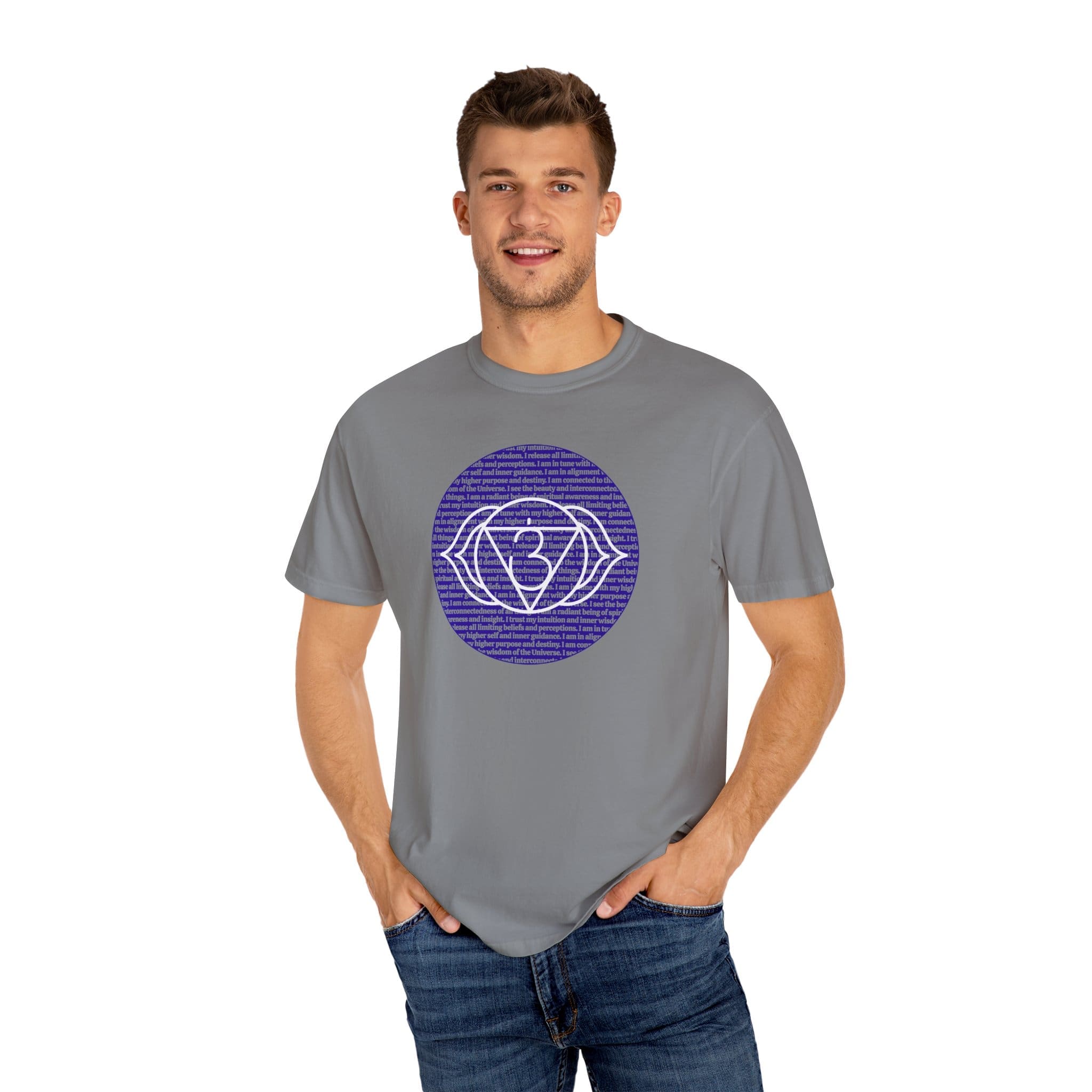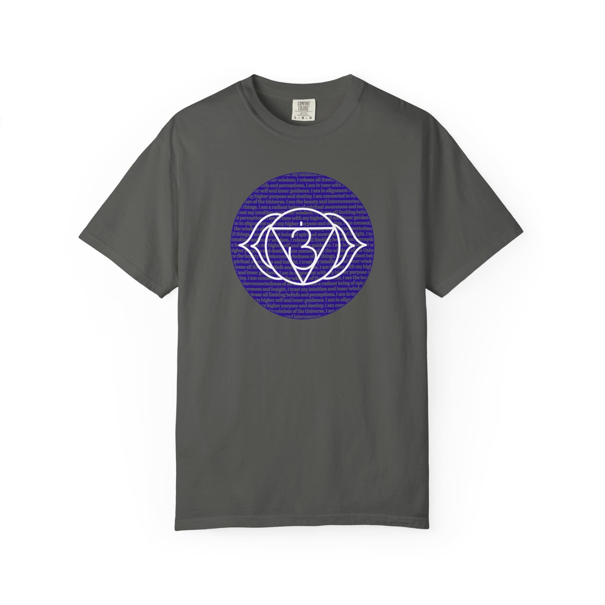 Third Eye Chakra Affirmations Heavyweight T-Shirt – the background text on this shirt is transparent, allowing the shirt color to show through as the text color. The design on this tee is multi-layered, with the chakra symbol in the forefront and third eye chakra affirmations typed out in the background.