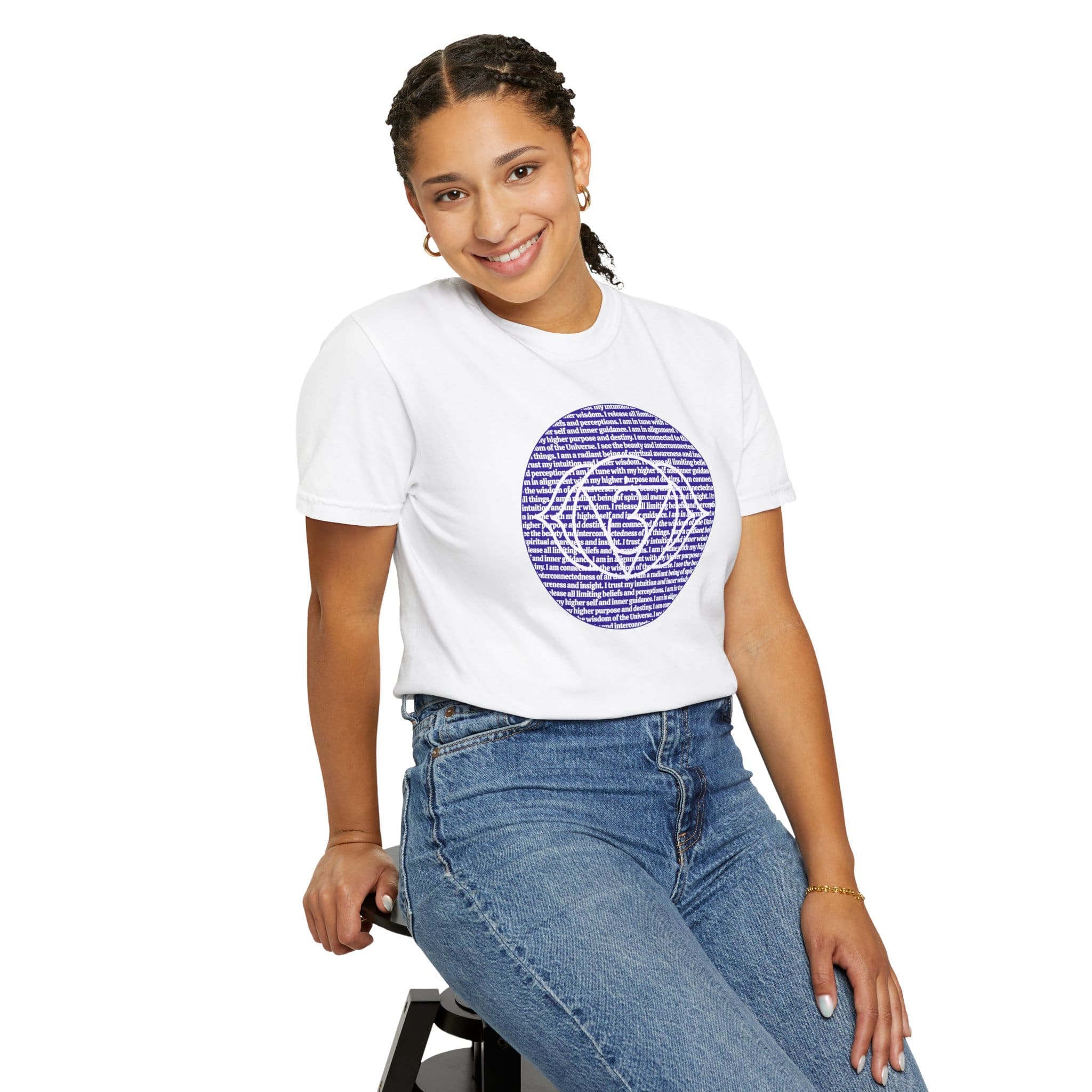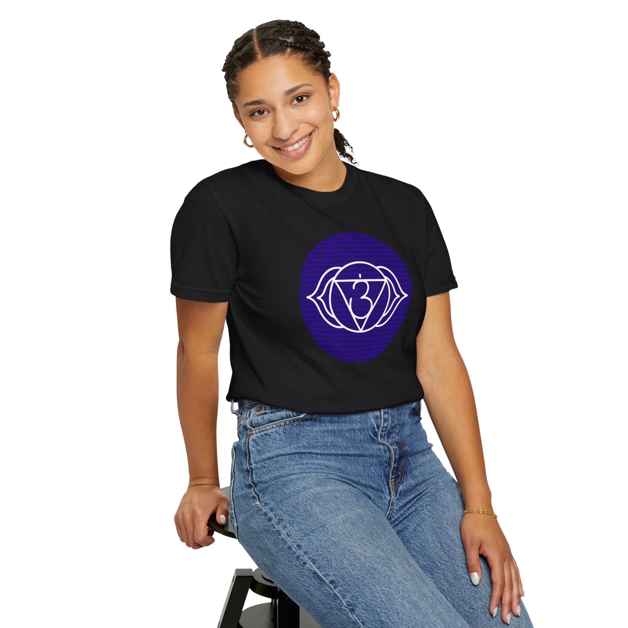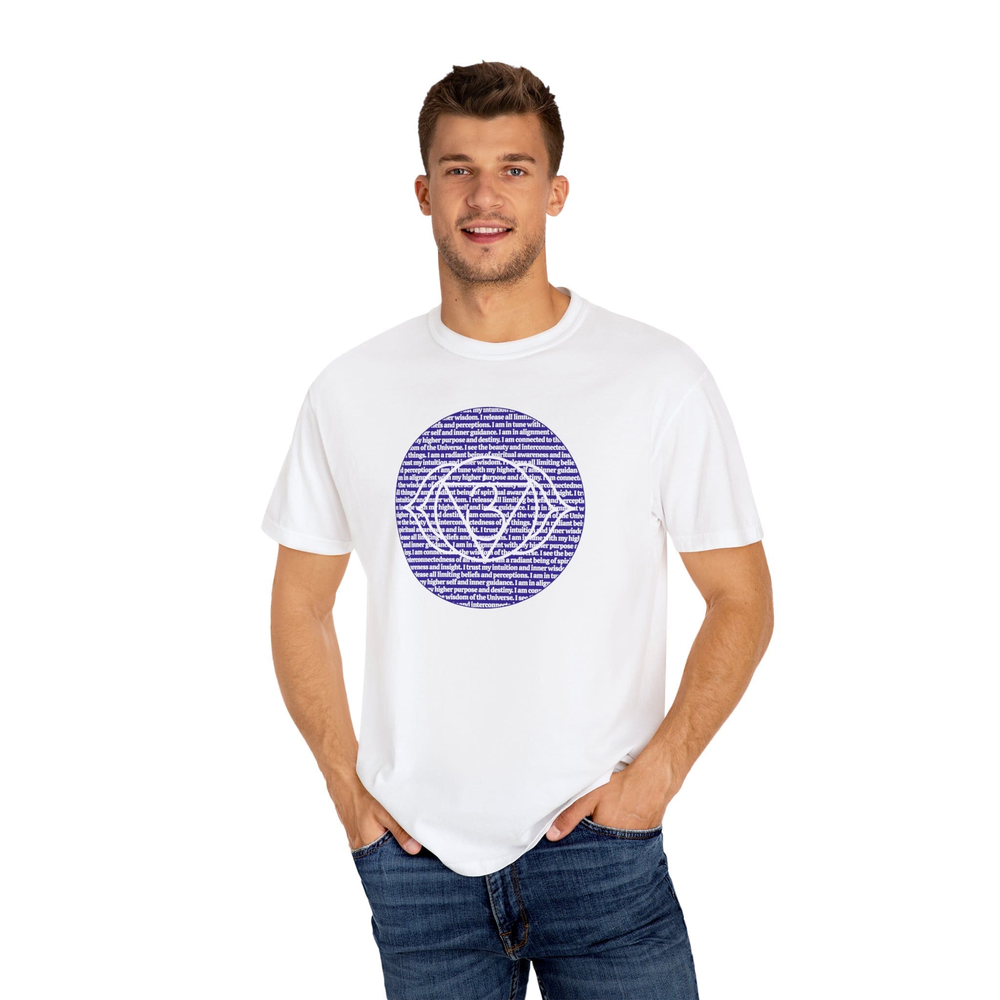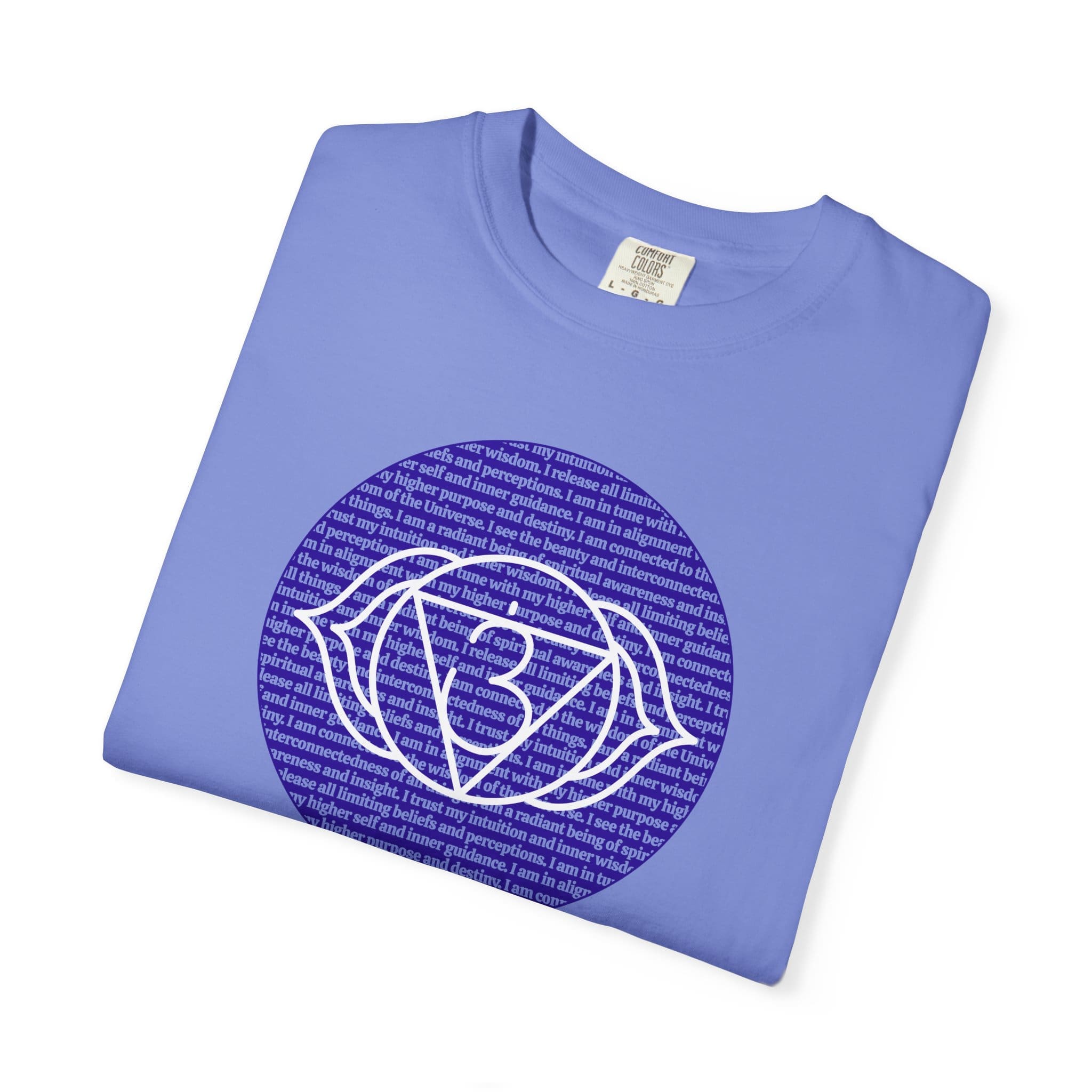 Third Eye Chakra Affirmations Heavyweight T-Shirt – the background text on this shirt is transparent, allowing the shirt color to show through as the text color. The design on this tee is multi-layered, with the chakra symbol in the forefront and third eye chakra affirmations typed out in the background.