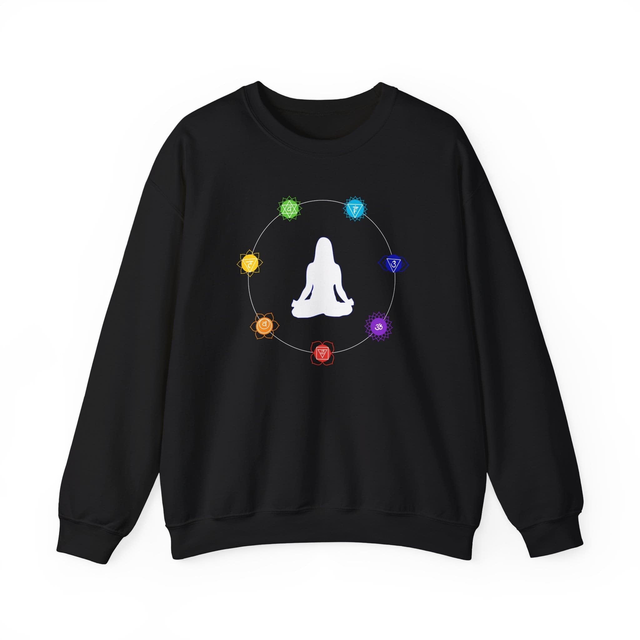 Wrap yourself in quiet focus. This mid-weight crewneck features a soft silhouette of a seated meditator surrounded by seven glowing chakra symbols, each rendered in its own luminous hue. Wear it before sunrise meditation, on slow walks between classes, or while journaling with tea—its classic fit and cozy heft keep you grounded as you move from breath work to everyday life. The crisp, color-rich print makes the design feel like an emblem of calm rather than loud branding. Subtle, durable stitching and a tear-away label mean it stays comfortable through long sits, travel days, and repeated washes, so the calm you cultivate can travel with you.